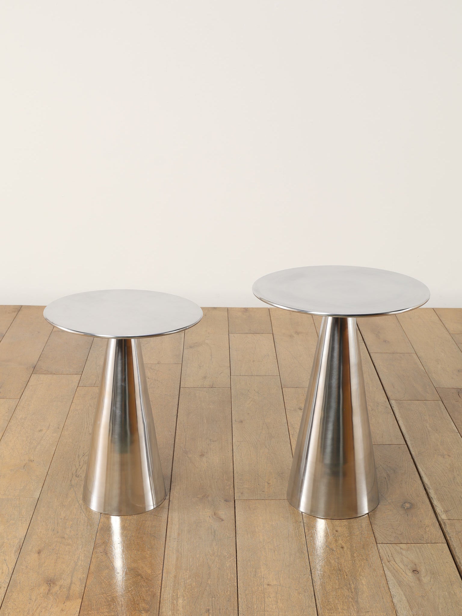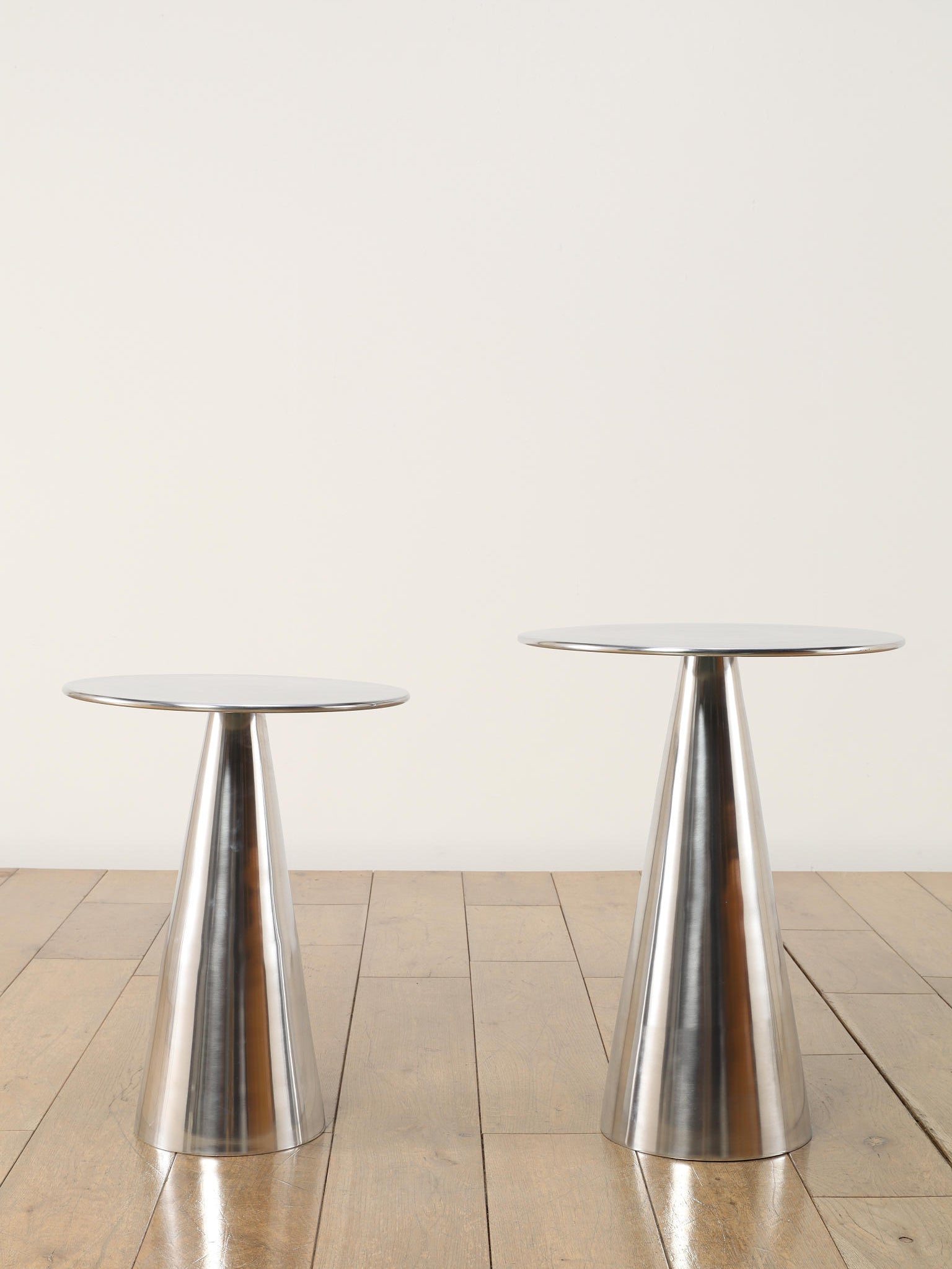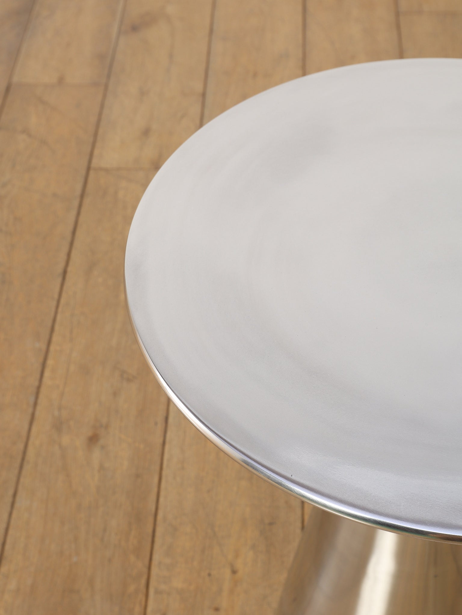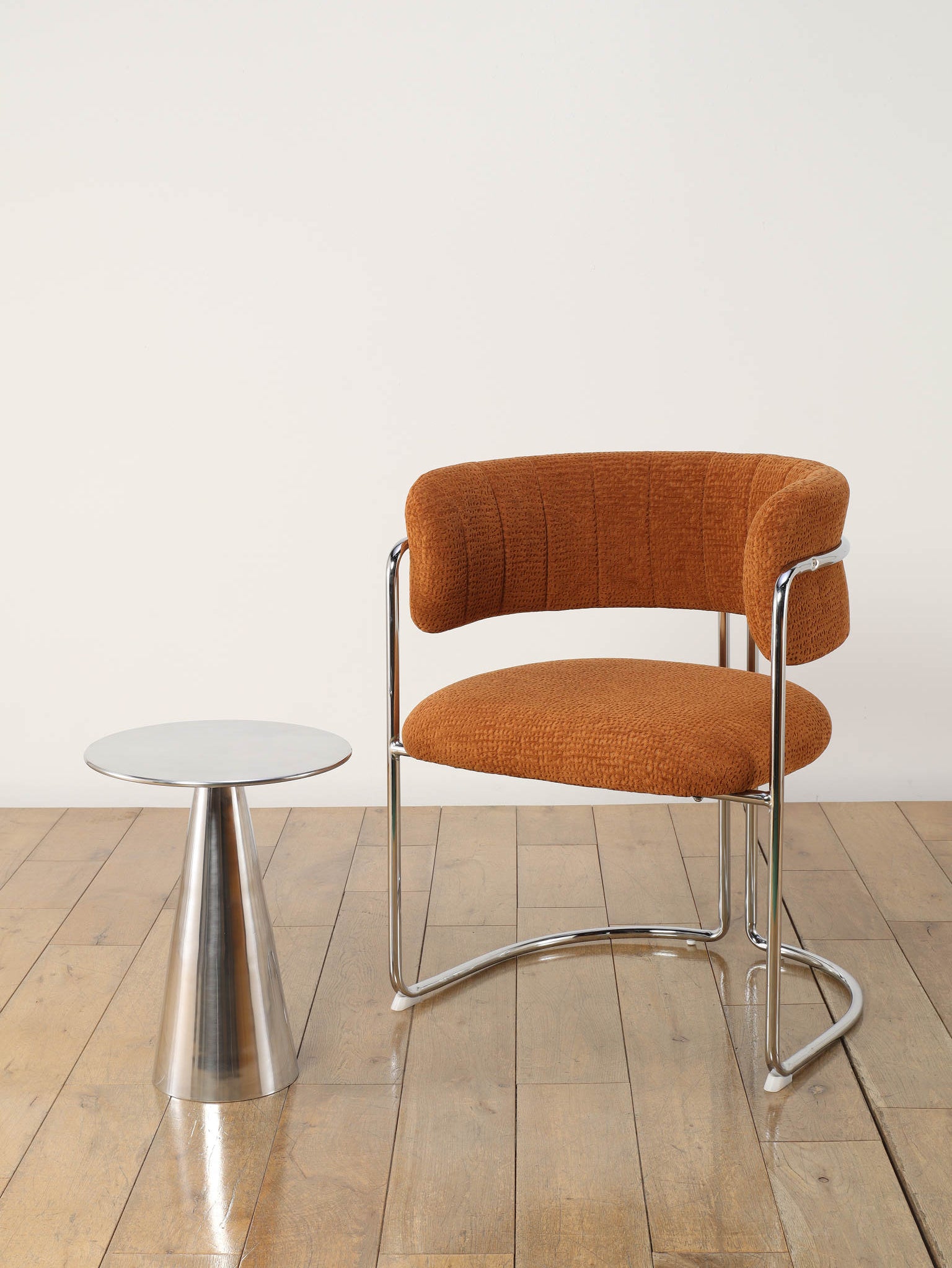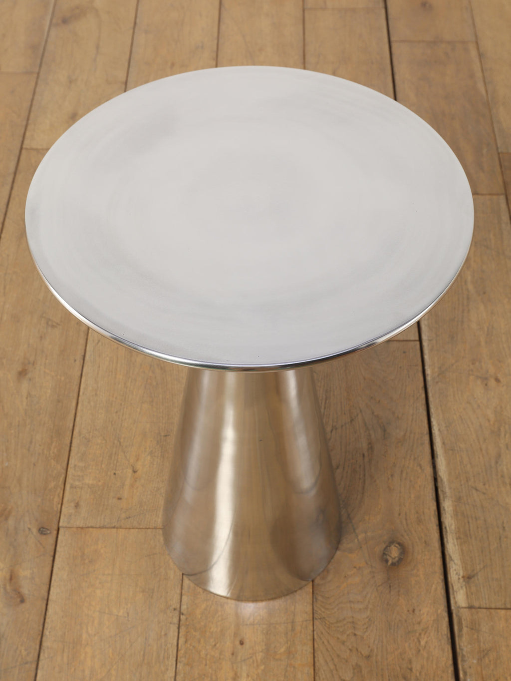 シャープな円形天板と、すっきりとしたコーン型ベースが美しいサイドテーブル。取り入れやすいサイズ感で、ソファやラウンジチェアの横に自然に収まります。無駄を削ぎ落としたフォルムは空間を圧迫せず、置く場所を選ばないのも魅力。天板にグラスや照明、花器を置くだけで、ミニマルながら洗練されたシーンが生まれます。モダンなインテリアはもちろん、ヴィンテージ家具と合わせても程よい緊張感を添え、空間全体を引き締めてくれる一台です。