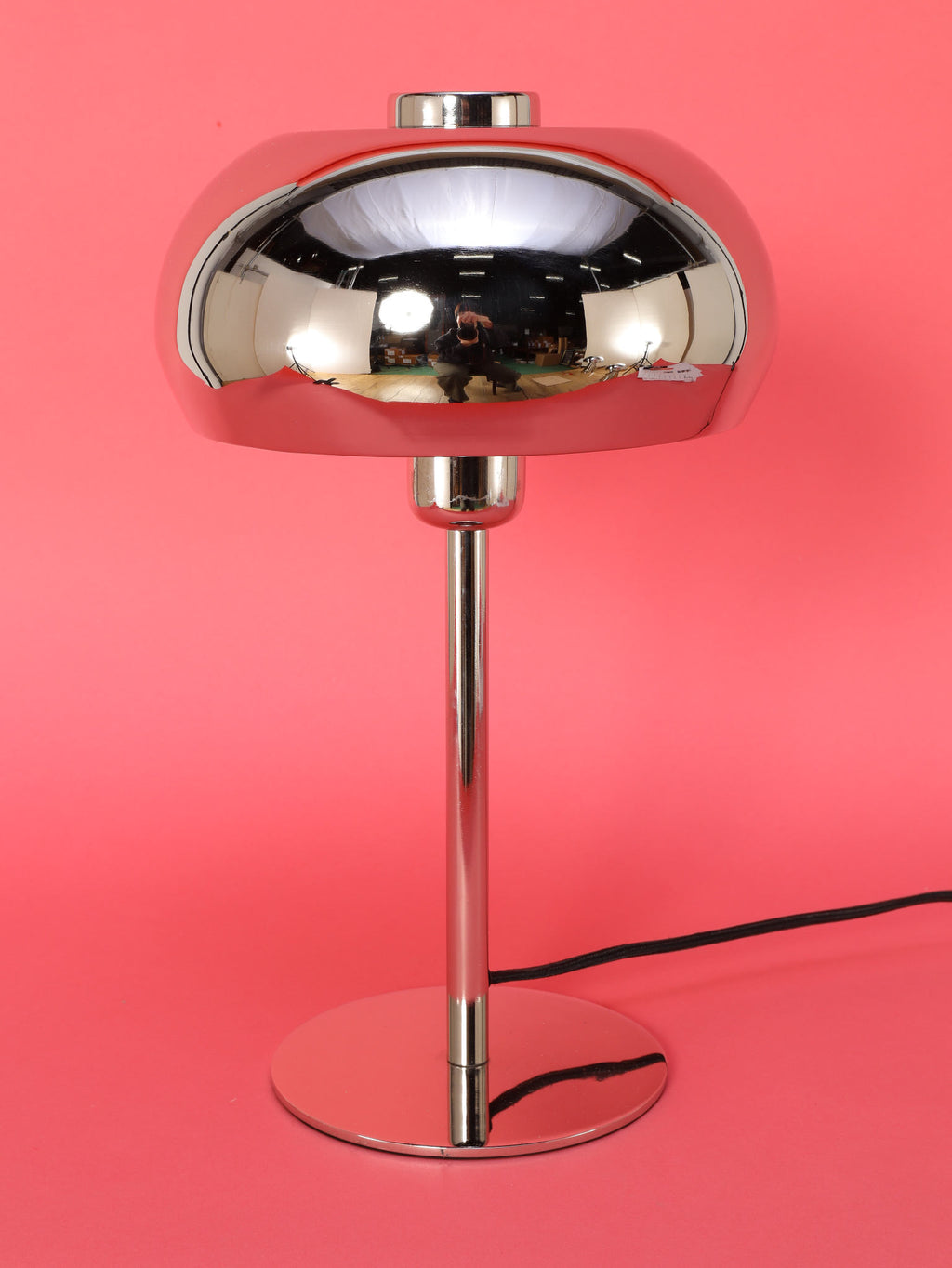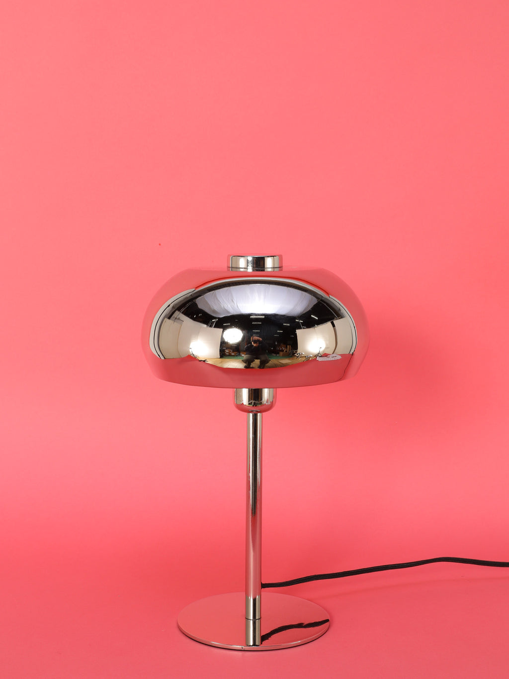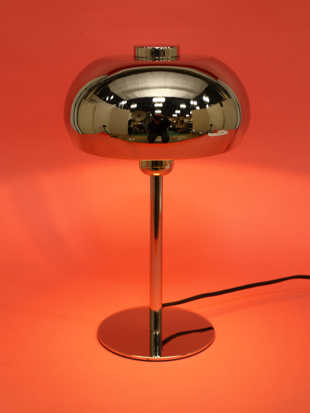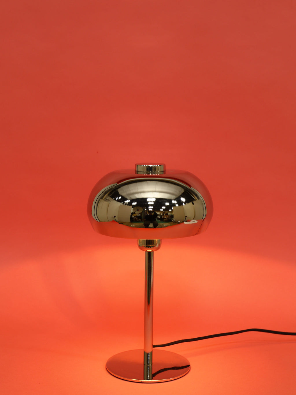 シャイニーなメタリックな質感が、洗練されたモダンな空間に格上げしてくれるテーブルランプ。ぽってりとした半球型のドームシェードは、光を柔らかく反射しながらも鏡面のようなクリアな輝きを放ち、ミニマルなデザインながらも上品で洗練された存在感を演出します。鏡面仕上げの表面は周囲の光やインテリアを美しく映し込み、置く場所によって表情が変わるのも魅力の一つ。柔らかな光が広がるので、ベッドサイドのナイトライトとして、またはリビングのサイドテーブルにアクセント照明として最適です。日常のシーンをワンランク上の洗練された雰囲気に変えてくれます。タイムレスなデザインで、長く愛用できる一灯です。
