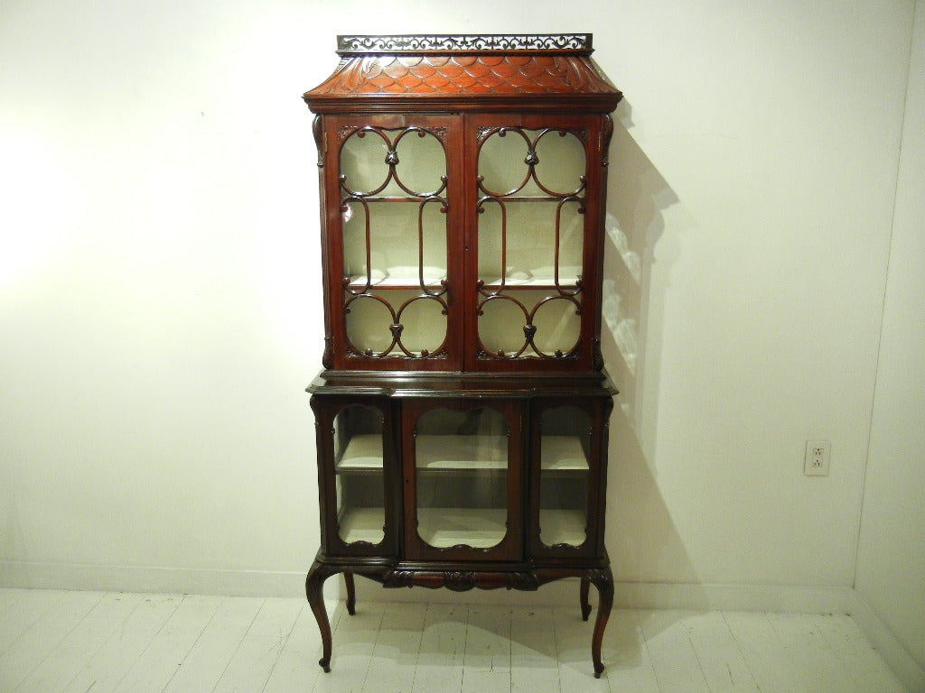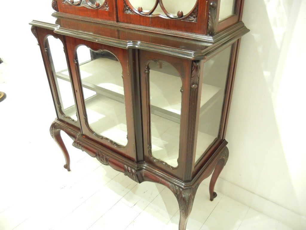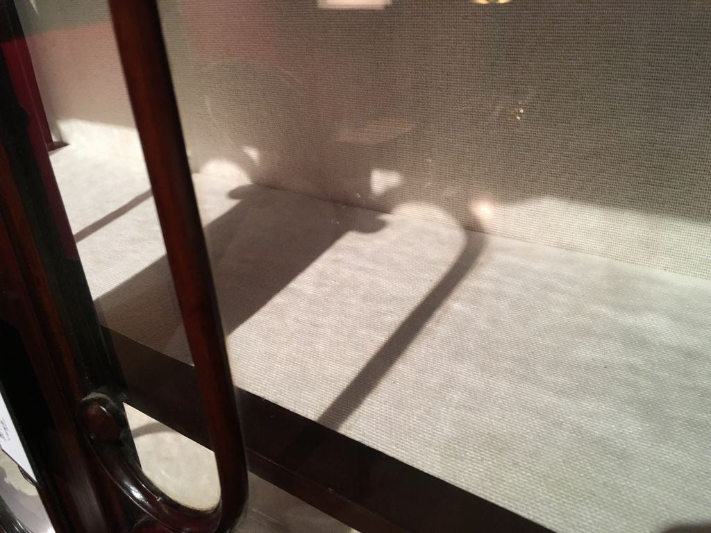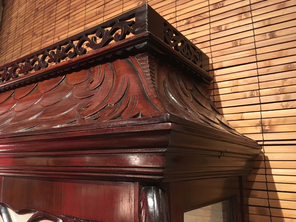 シックなお色味のマホガニーが艶めき、細部まで凝った装飾や彫り物がとても美しいです。曲線を使った窓枠や脚元から柔らかな女性的な印象をうけます。棚板や背面には白いクロスが貼られており、お気に入りの小物を飾れば、より一層素敵になることでしょう。見て、眺めてうっとりしてしまう逸品です。