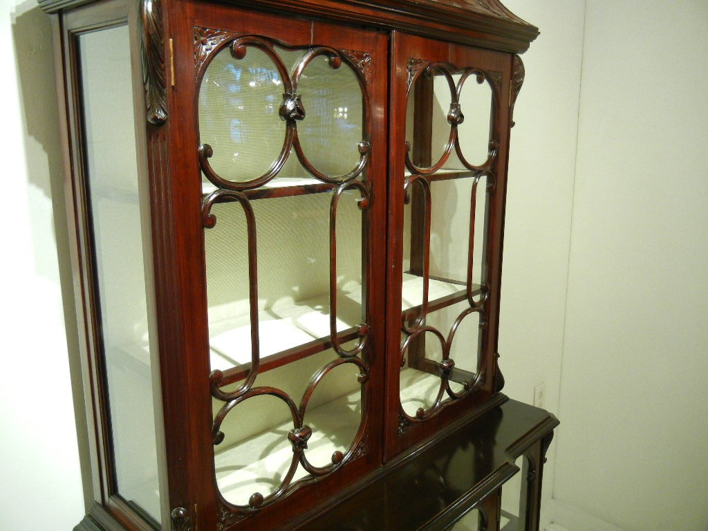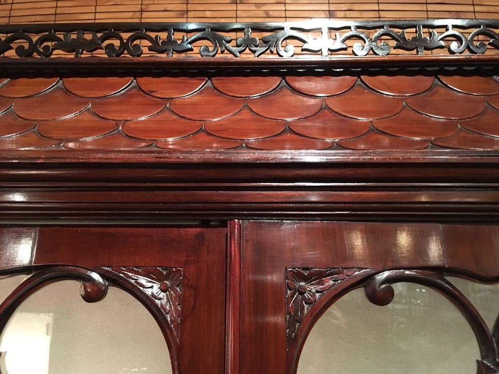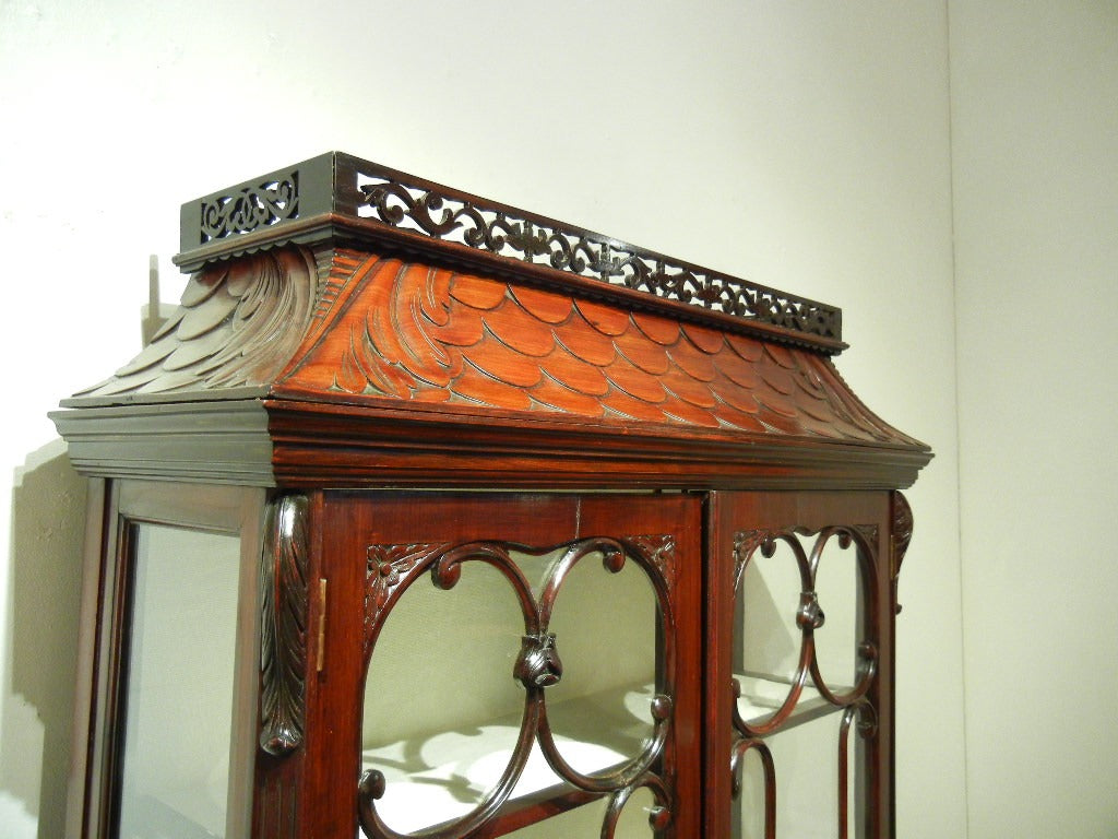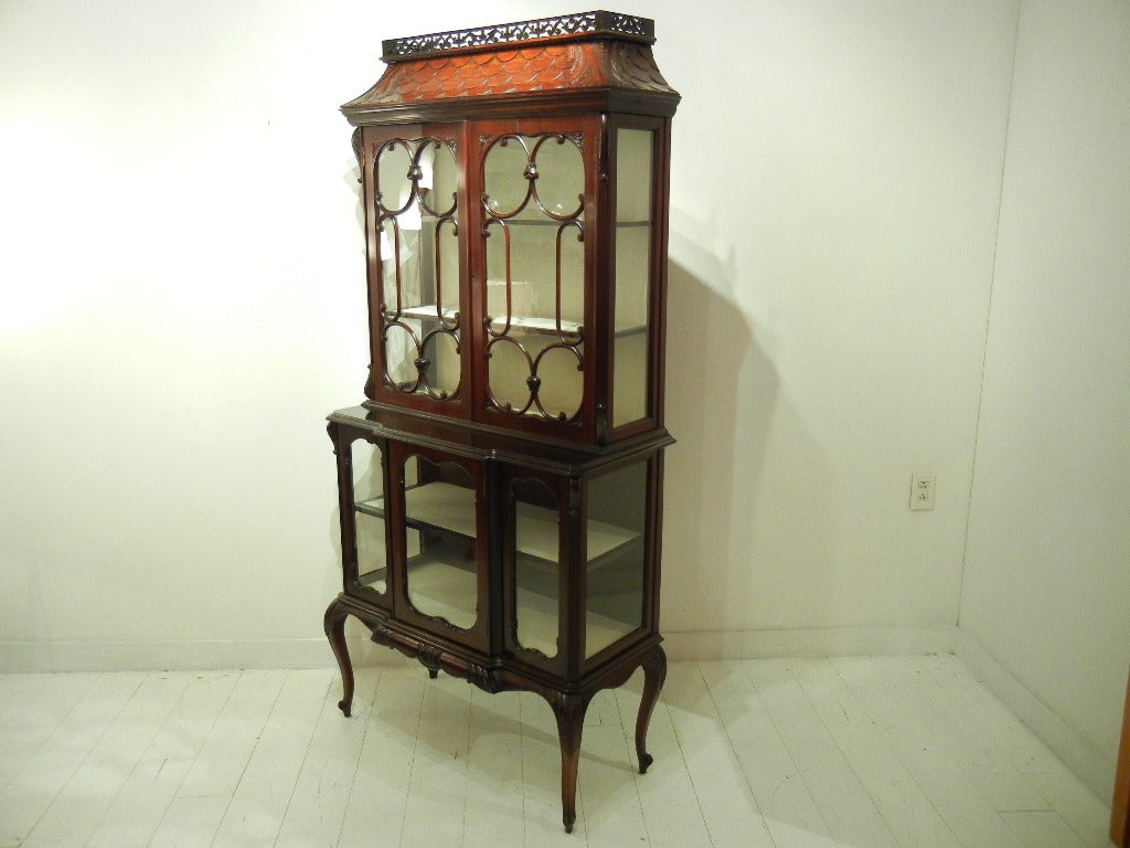 シックなお色味のマホガニーが艶めき、細部まで凝った装飾や彫り物がとても美しいです。曲線を使った窓枠や脚元から柔らかな女性的な印象をうけます。棚板や背面には白いクロスが貼られており、お気に入りの小物を飾れば、より一層素敵になることでしょう。見て、眺めてうっとりしてしまう逸品です。