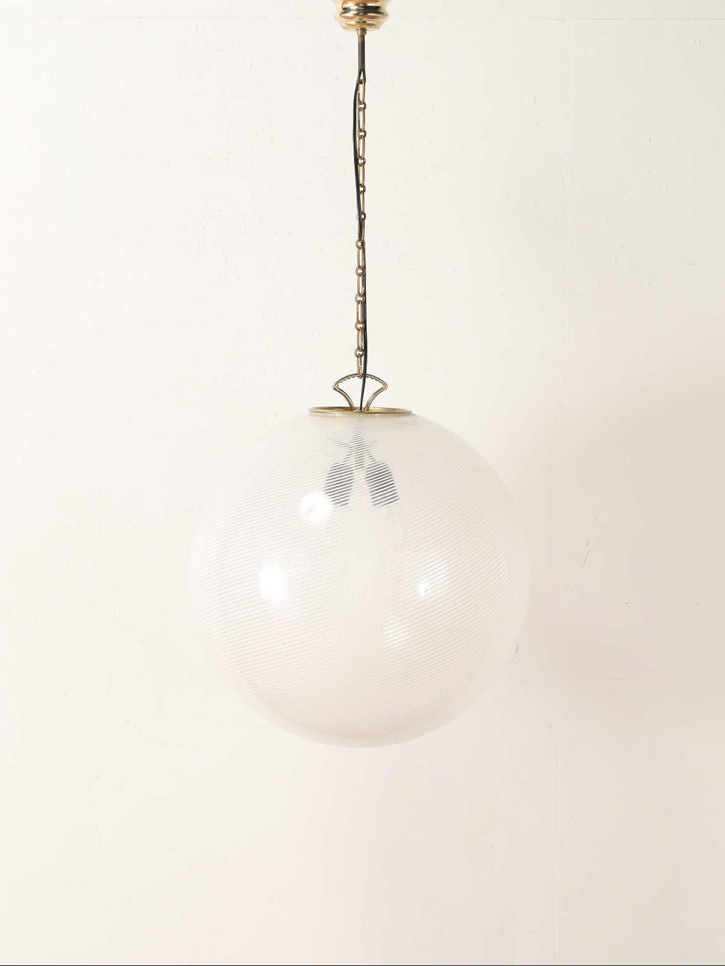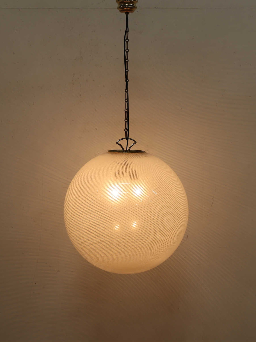 1970年代推定、ガラスの生産地として有名なムラーノ島よりデザインされたシーリングランプ。1921年創業したムラノブランドの老舗ヴェネチアングラスメーカー。他に類を見ない多くのカラーバリエーションをユニークなデザインと同時に数多く展開し、多くの芸術家や建築家との共作を成功させてきたことでも知られています。球体型のシンプルな造りに細いストライプの模様が斜めにデザインされ、点灯時と消灯時それぞれで感度の高いインテリア要素を感じることができるシーリングランプです。