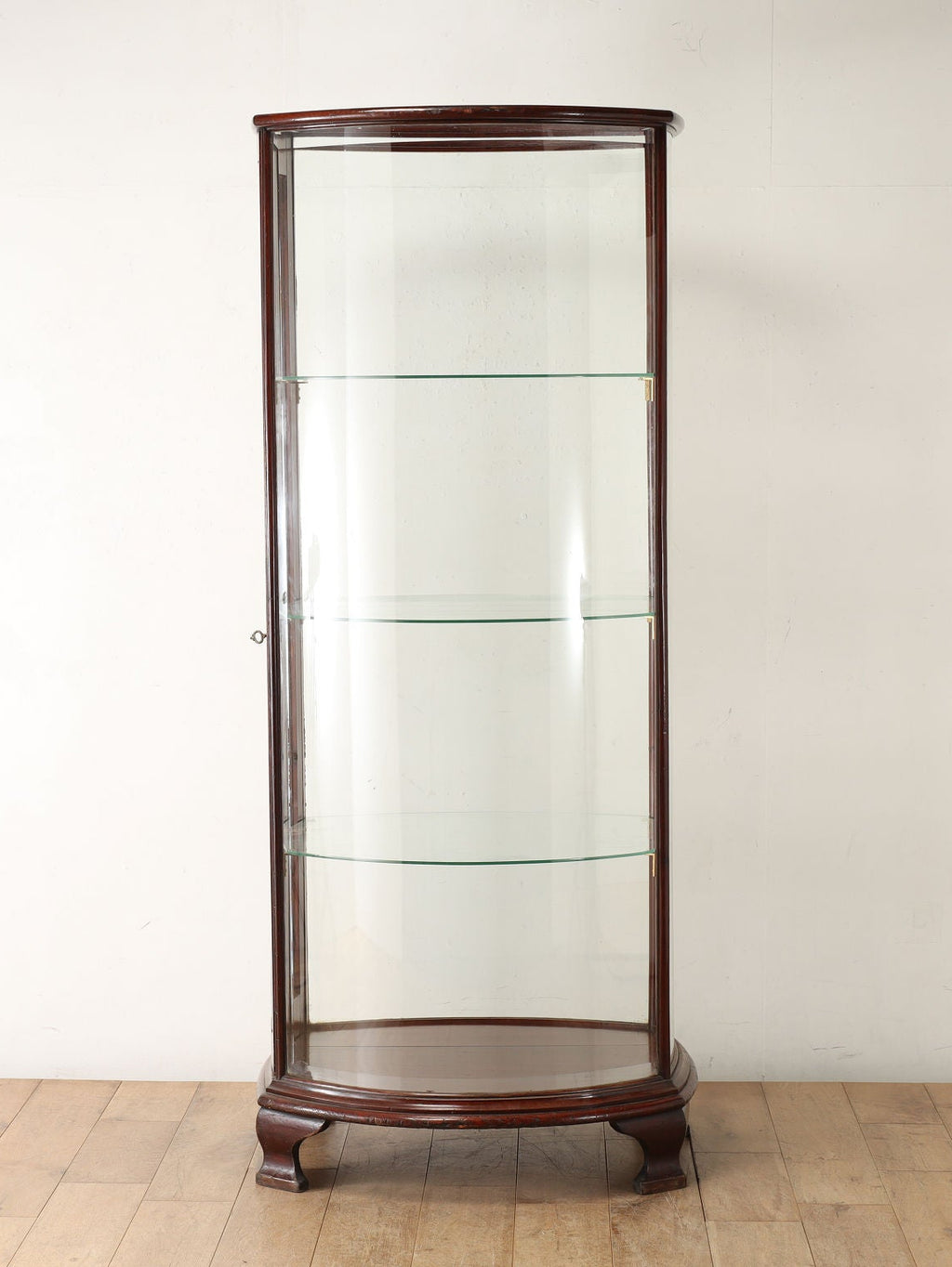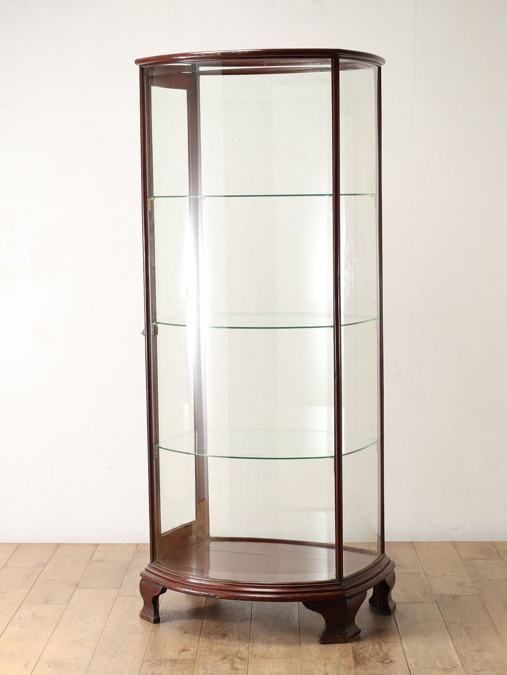 全面ガラスの存在感あるディスプレイキャビネット。ボウフロント&ボウバック&ボウエンドとなっており、サイド片側が開閉する珍しい造りとなっています。(詳細は2枚目の画像を御覧ください。)中央置きすることでどの角度からも見ることができ、マホガニー材の艶やかな光沢が中の物をより美しく見せてくれることでしょう。ショップでの使用はもちろんのこと、ご自宅でお気に入りのコレクションを飾ってみてはいかがでしょうか。シンプルなデザインな為、コレクションを一段と引き立ててくれることでしょう。