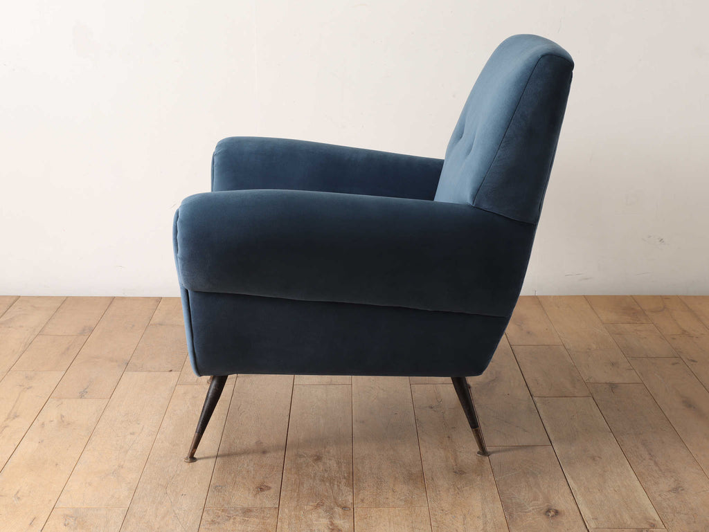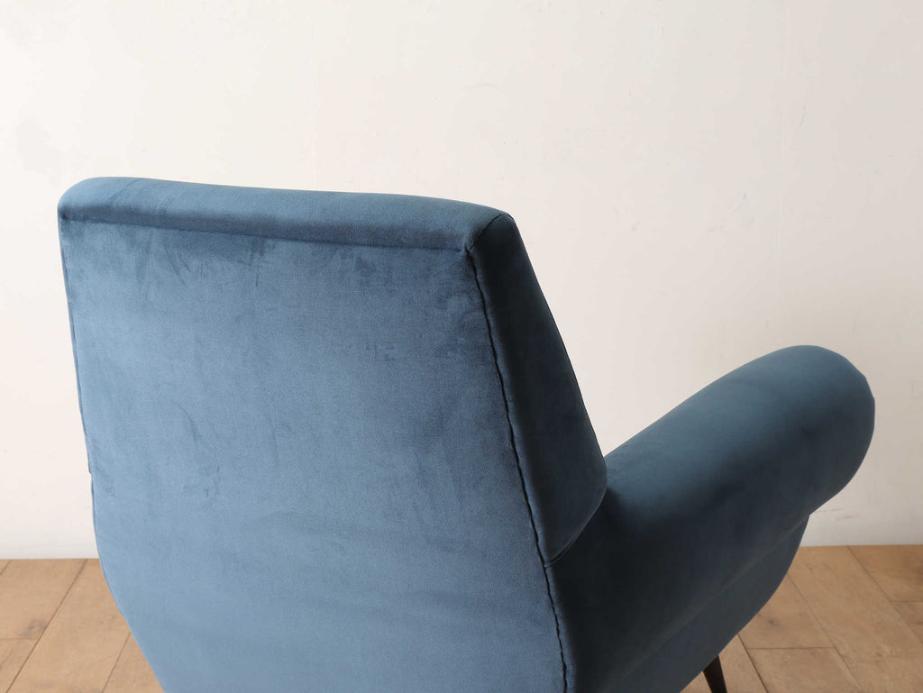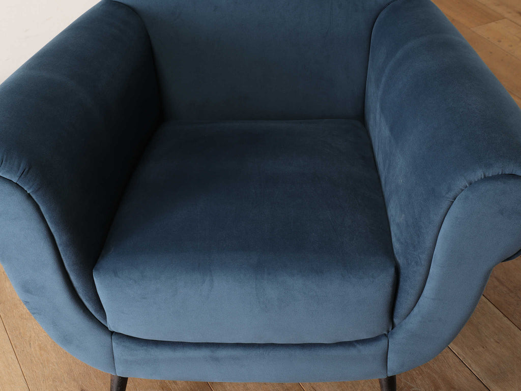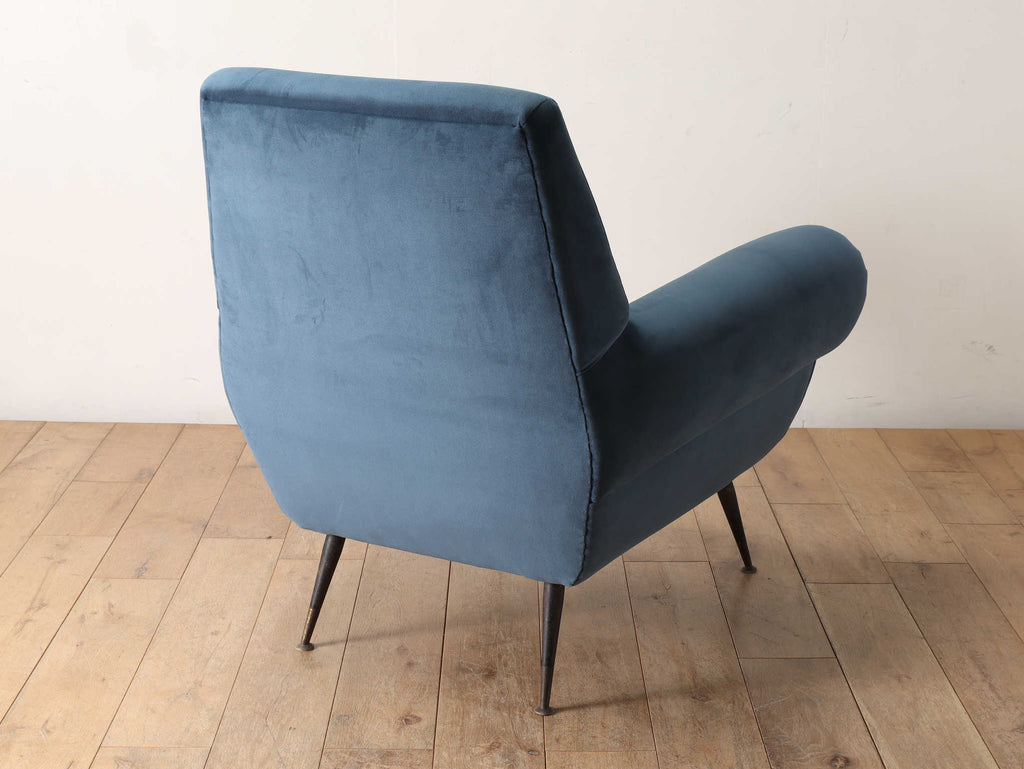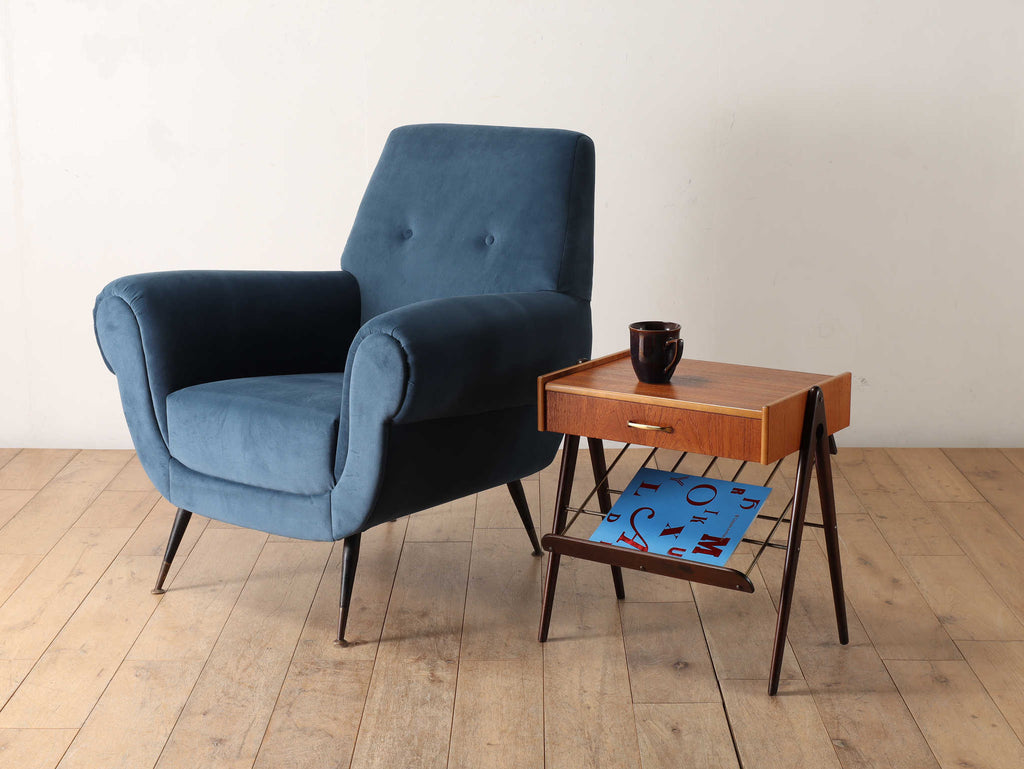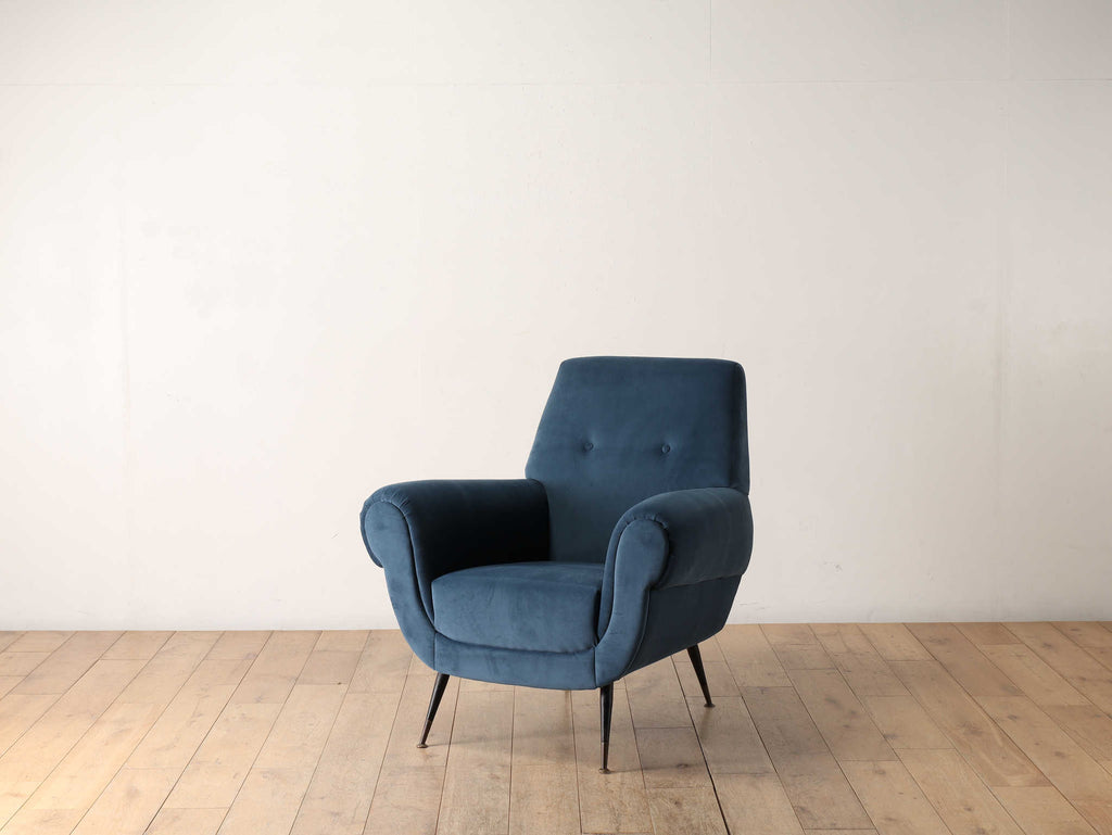 イタリアヴィンテージらしい、スタイリッシュな印象を与えるスマートな脚部と、どこかレトロさを彷彿とさせるシートのディテールが特徴的なアームチェアです。どの角度から見てもこのチェアのキャラクター性を感じることの出来るフォルムであり、コーディネートにおいて素晴らしい存在感を発揮してくれる事でしょう。ゆったりと寛げる安楽性もあり、ヴィンテージのある空間を、存分にお楽しみ頂けるチェアです。