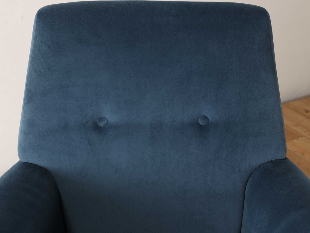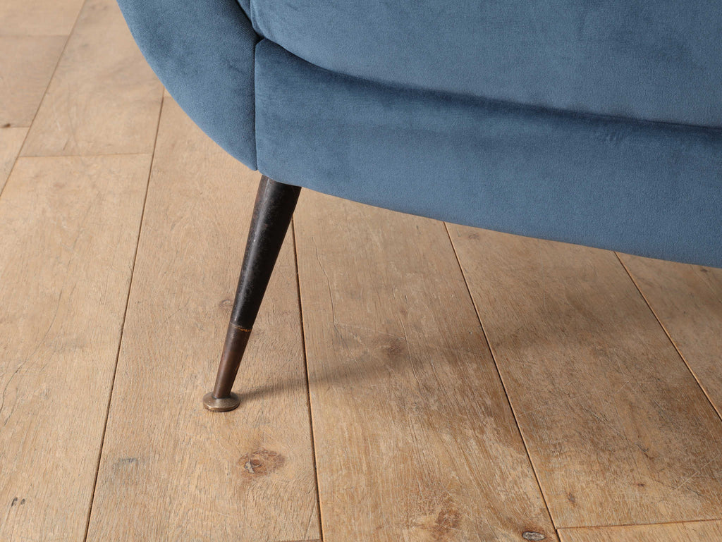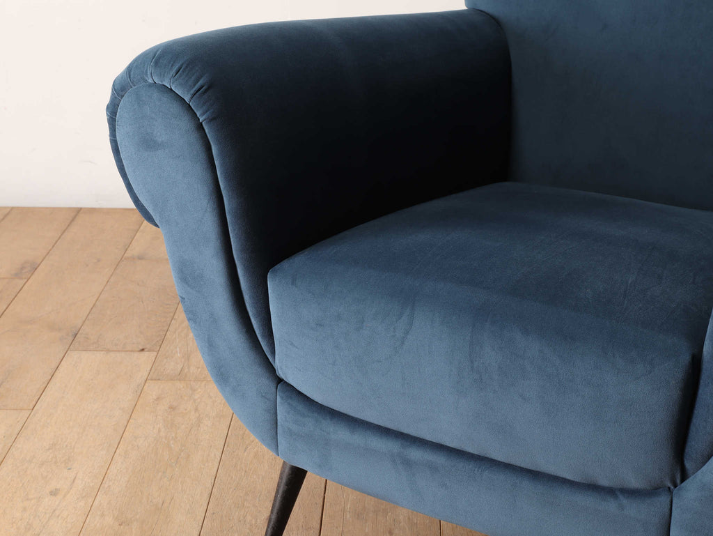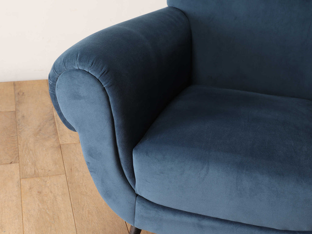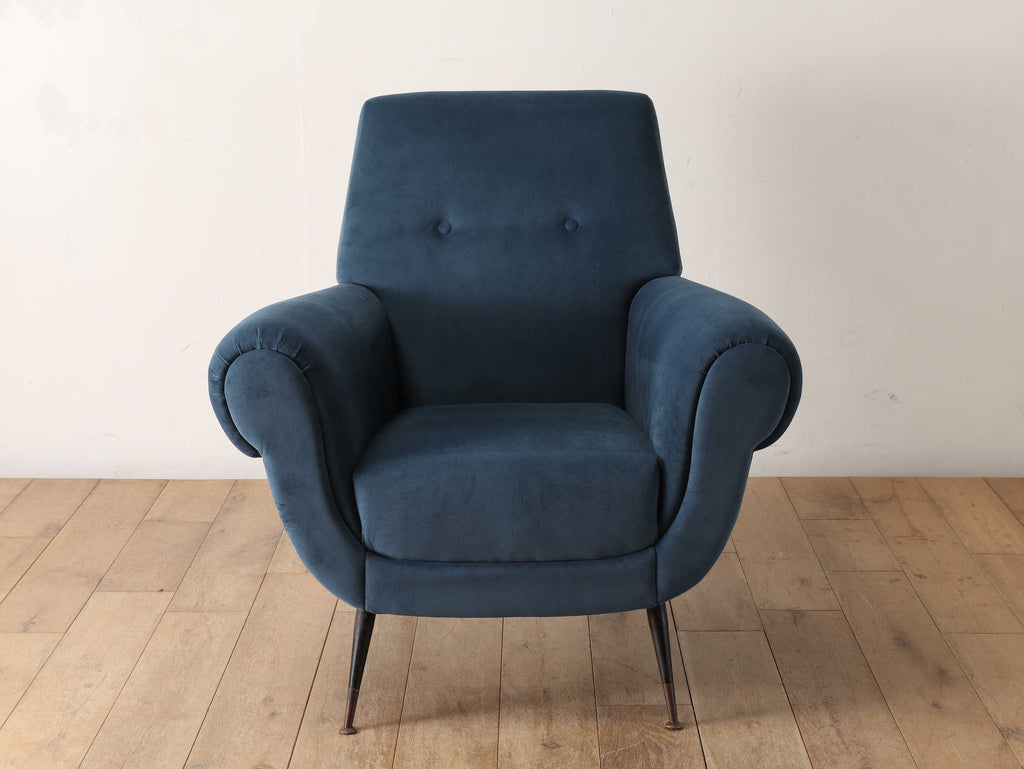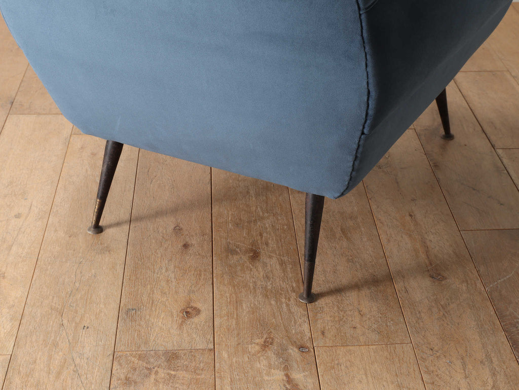 イタリアヴィンテージらしい、スタイリッシュな印象を与えるスマートな脚部と、どこかレトロさを彷彿とさせるシートのディテールが特徴的なアームチェアです。どの角度から見てもこのチェアのキャラクター性を感じることの出来るフォルムであり、コーディネートにおいて素晴らしい存在感を発揮してくれる事でしょう。ゆったりと寛げる安楽性もあり、ヴィンテージのある空間を、存分にお楽しみ頂けるチェアです。