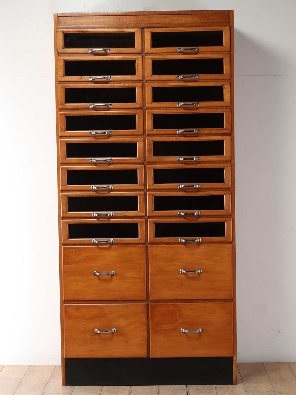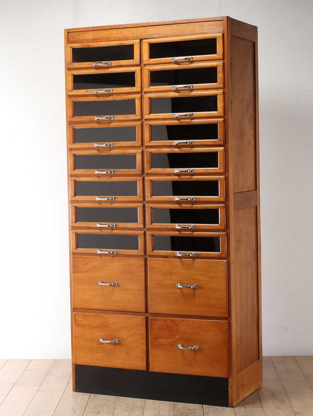 1910年代に英国で作製されたこちらのシャツキャビネット。存在感のある大量の引き出し、オーク材の温かくも凛々しい杢目と全体のシンプルなフォルム感が魅力です。下段の2段は木製、3段目からは中身が見えるガラスが使用された引き出しになっています。シャツキャビネットは、その名の通り、シャツや衣類を収納する為に作られた家具ですが、収納性に優れていることから、その他にも沢山の用途でご利用いただけるのではないでしょうか。