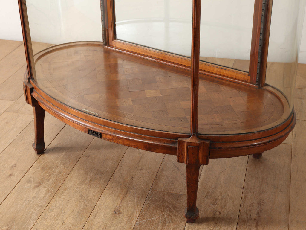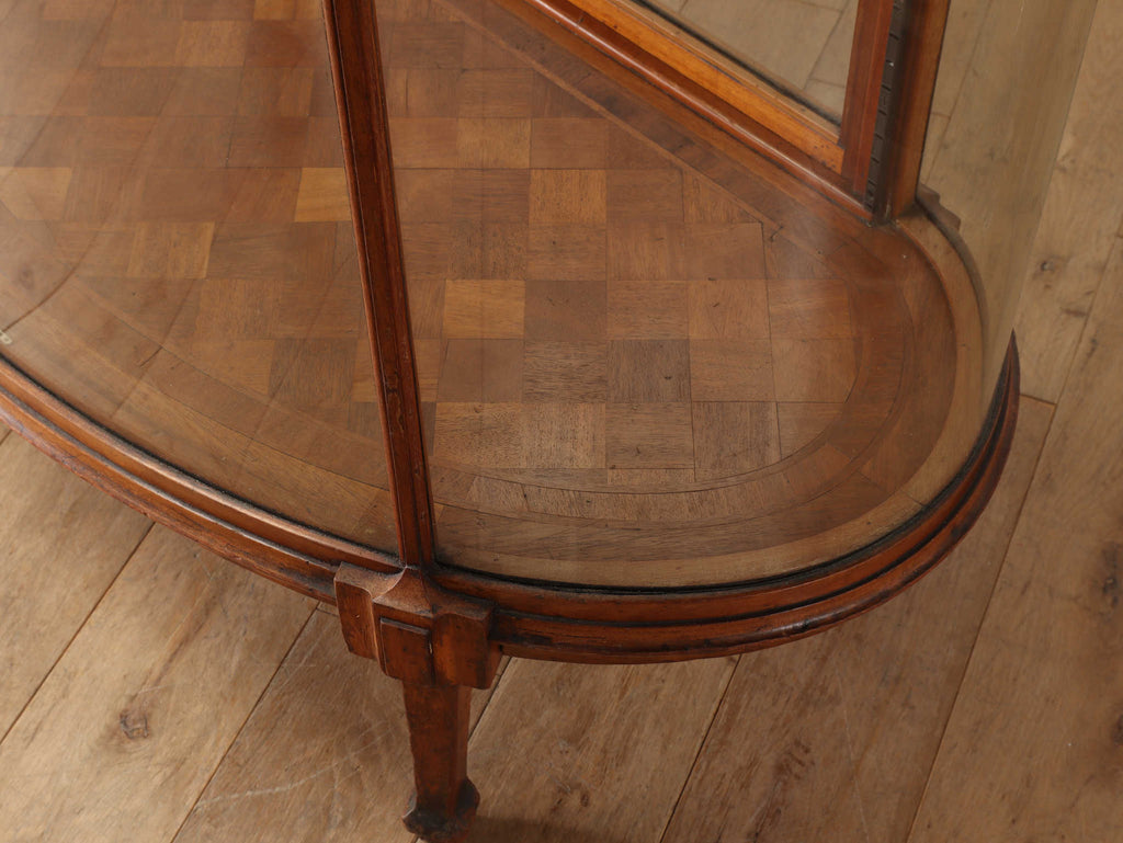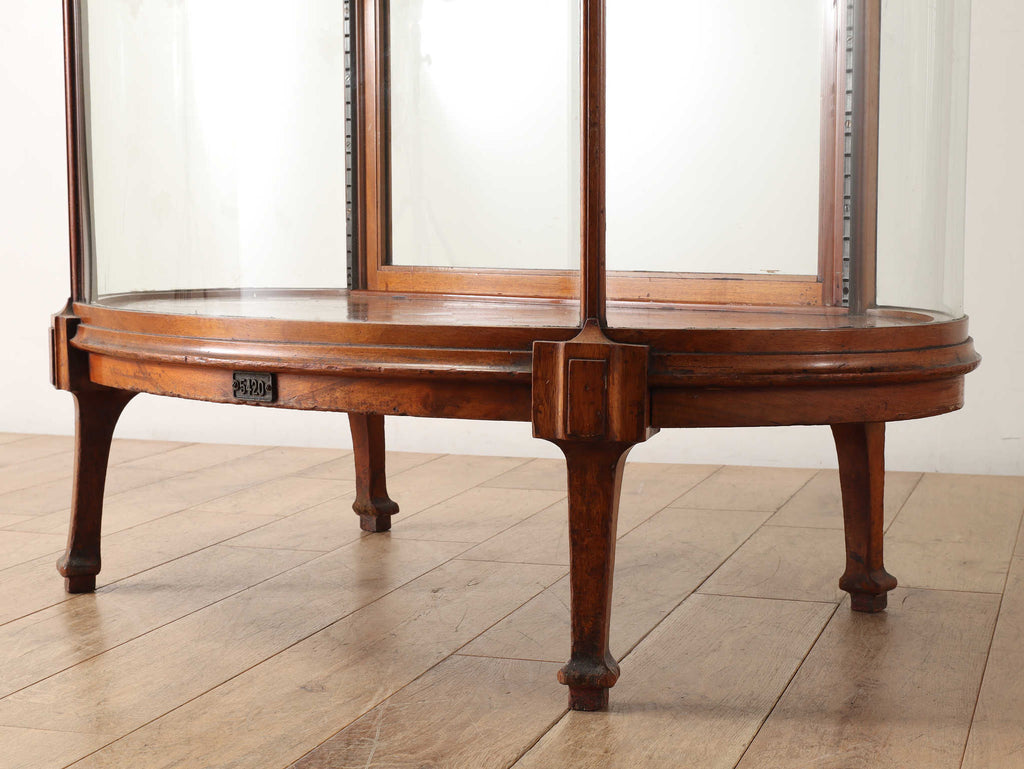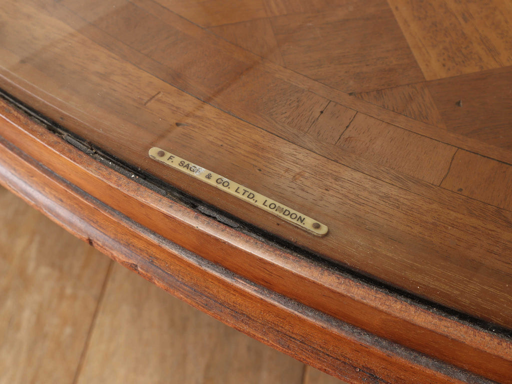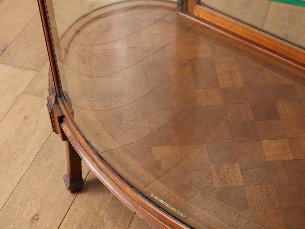 フレデリック・セージ・アンド・カンパニーは、ロンドンに拠点を置くイギリスのショップフィッティング会社。ヨーロッパ全土や他地域にも業務を拡大していきました。カウンターなどショップフィッティングに特化し、百貨店などの上質な空間を演出するインテリアを手がけました。こちらは両端が美しい円弧を描いたフォルムをしています。このような緩めの円弧を弓を連想することから「ボウ=bow)」といい、端が円弧なことから「ボウエンド」と呼ばれています。また底板の寄木細工の美しさも魅力です。ショップキャビネットの中では比較的小ぶりなサイズ感ですが、圧倒的な存在感と美しさを兼ね備えており、格調高い空間を演出する特別なアイテムです。現在となっては非常に希少なアイテムとなっておりますので、ショップユースにはもちろん、個人のお客様のコレクションディスプレイ用にもおすすめです。