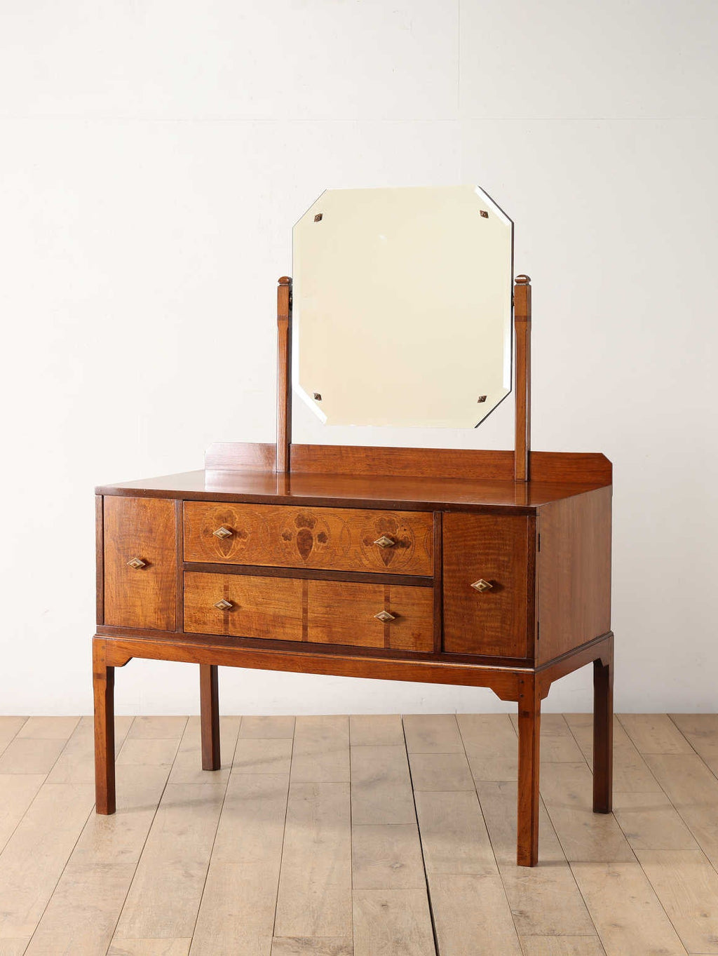 直線的なシルエットに、アールデコを連想させるエッジの効いた取っ手が魅力的なドレッサー。1段目の引き出しには抽象的な植物模様がインレイで施され、非常に目を引きます。発色の良いウォルナット材が美しく、品格を感じられます。用途・サイズに応じて使い分けができる2つの引き出しと2つの扉が付いており、細々した収納を一手に引き受けてくれます。すっきりとした脚は空間に軽やかさを与え、クラシックにもモダンな空間にも馴染んでくれることでしょう。