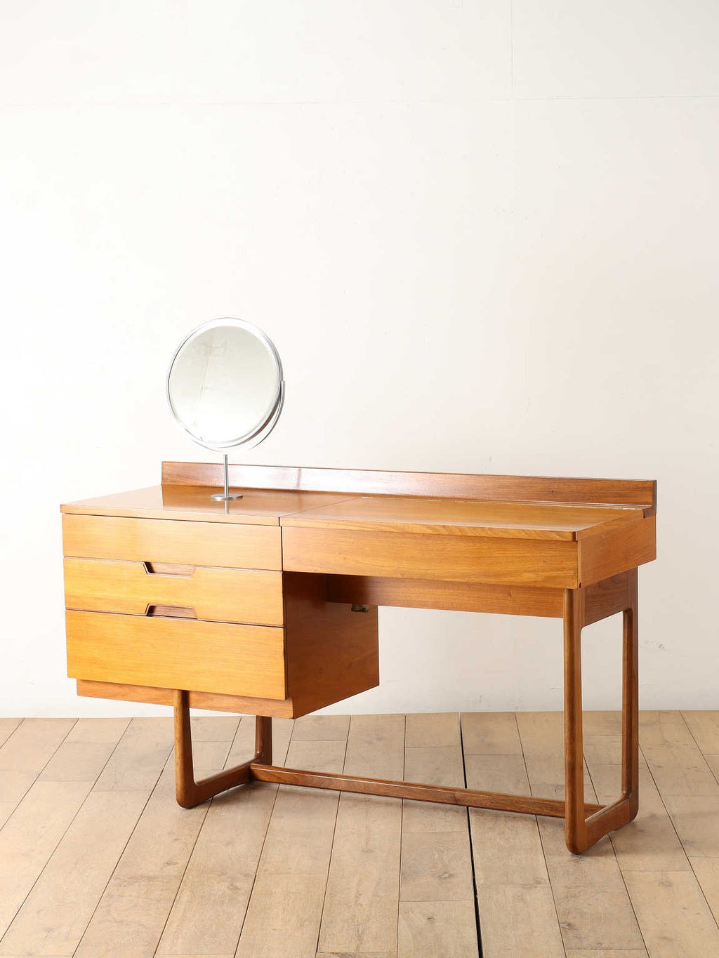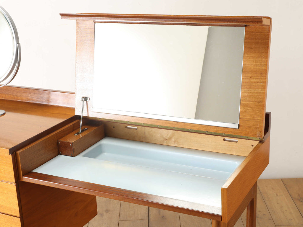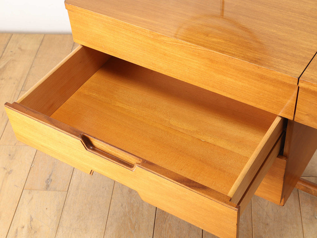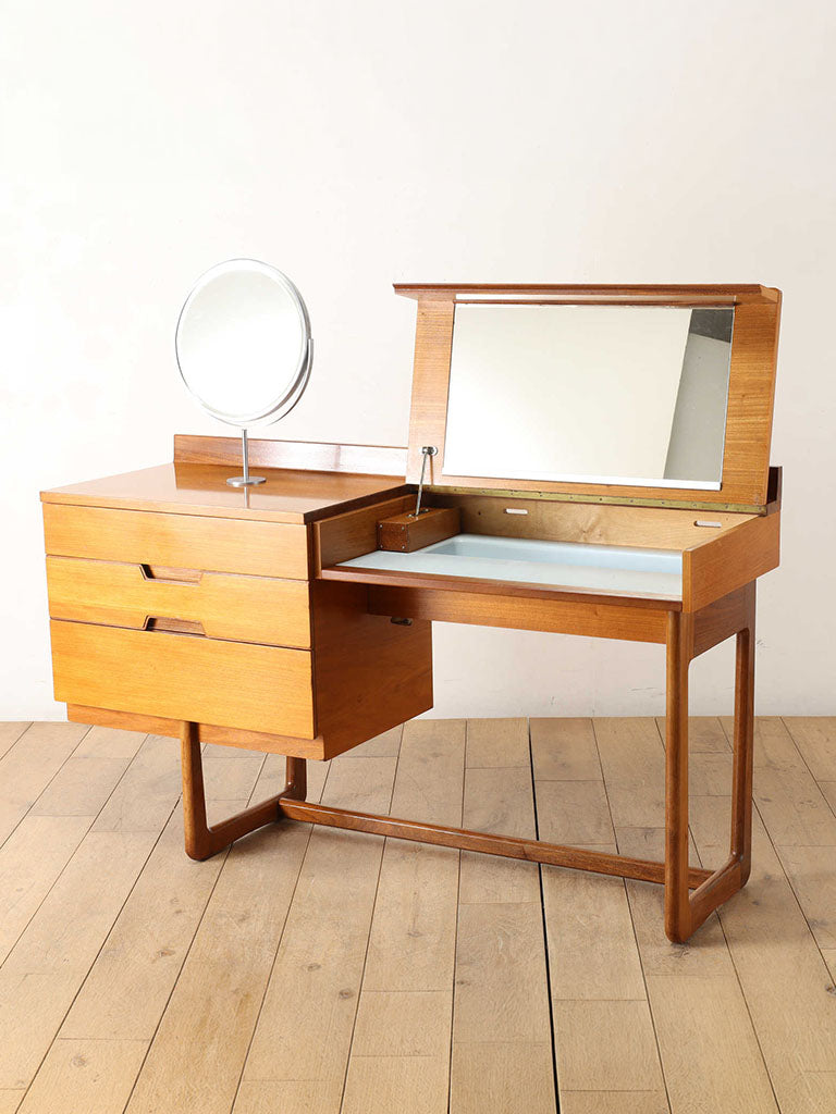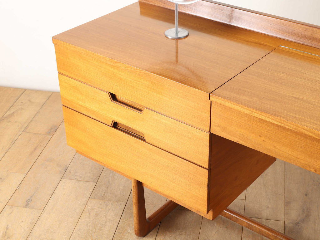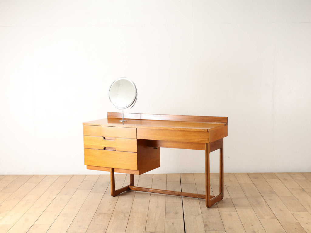 およそ1960年代イギリスの家具メーカー、Uniflexのヴィンテージドレッシングテーブル。G-PLANやMcintoshと並ぶイギリスを代表する家具メーカーの逸品です。デザイン性もさることながら、Uniflexの独特な感性が垣間見えます。収納、天板部分と脚部の木材のコントラストが美しく、飽きのこないデザインが魅力的です。
