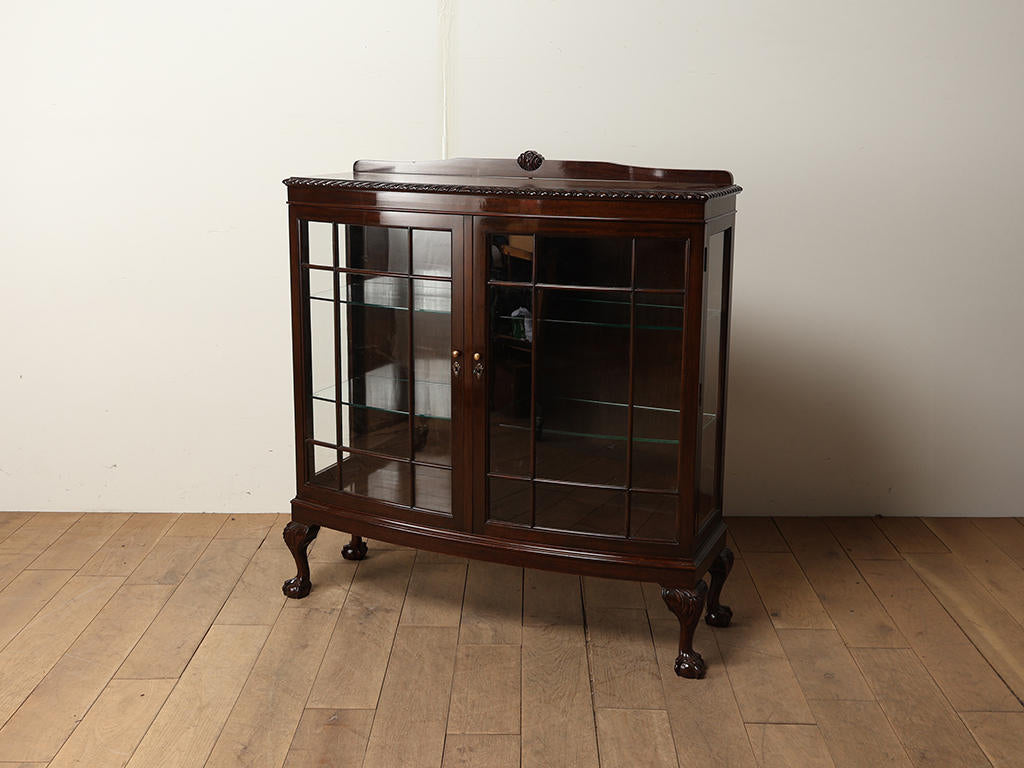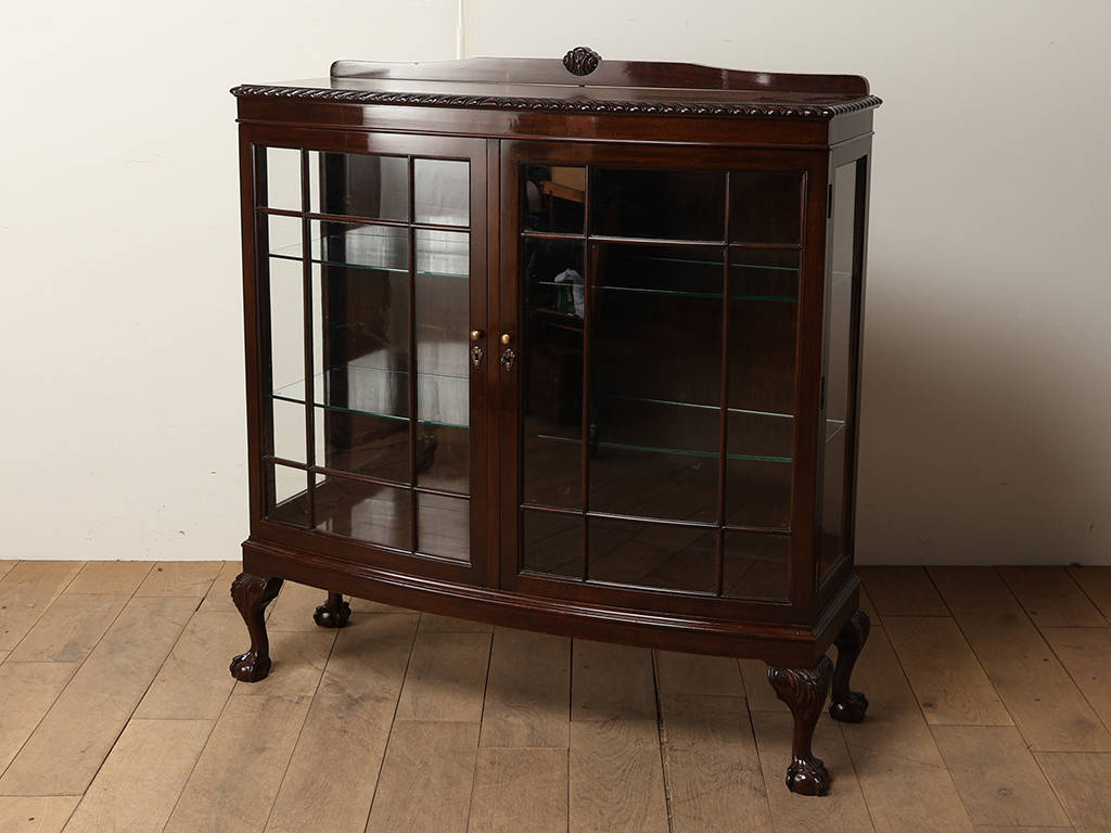 およそ1930年代英国製のディスプレイキャビネットです。艶やかなマホガニーの質感と細部の彫刻も美しく、中に飾るものの存在をより引き立ててくれそうです。脚元は、ボール&クロウという龍の爪が宝石を掴んだ様子がモチーフとなったデザインです。縁起の良いデザインとされ、古くから人気の高いスタイルの一つです。佇まいの華やかなアイテムのため、お部屋の主役に取り入れてみてはいかがでしょうか。