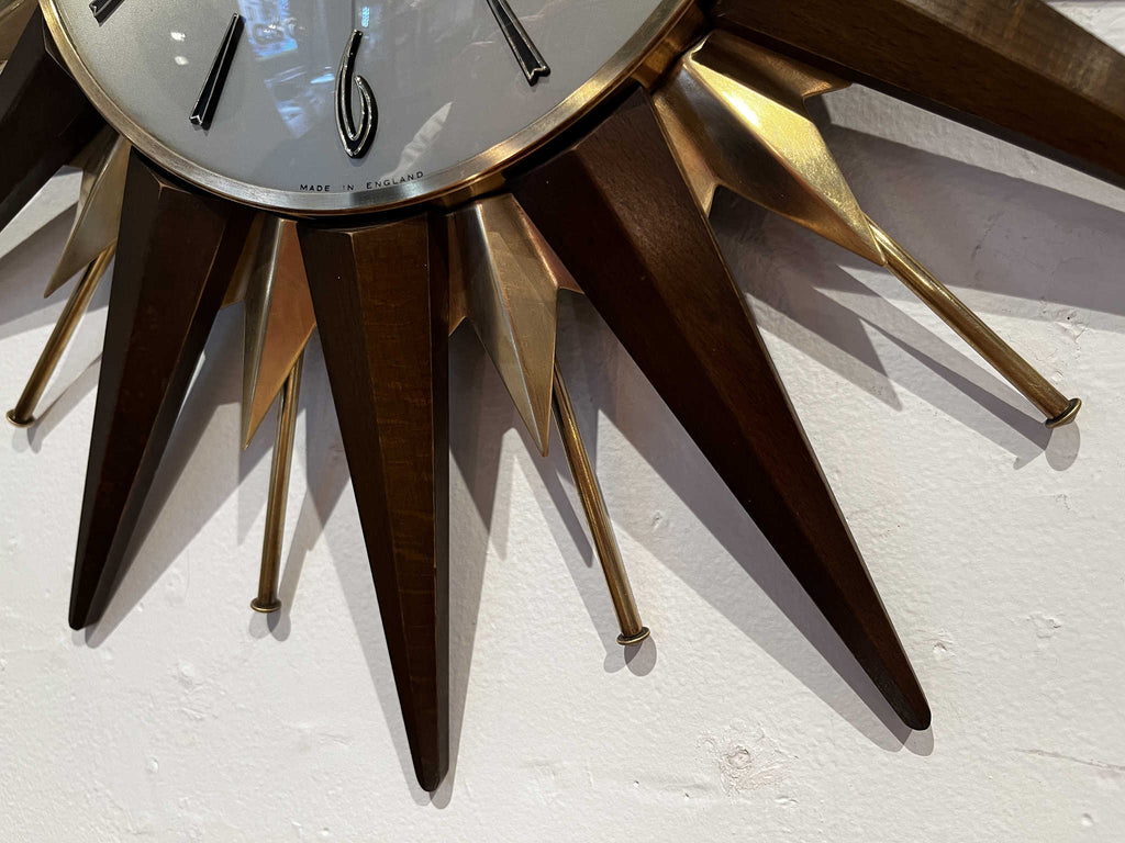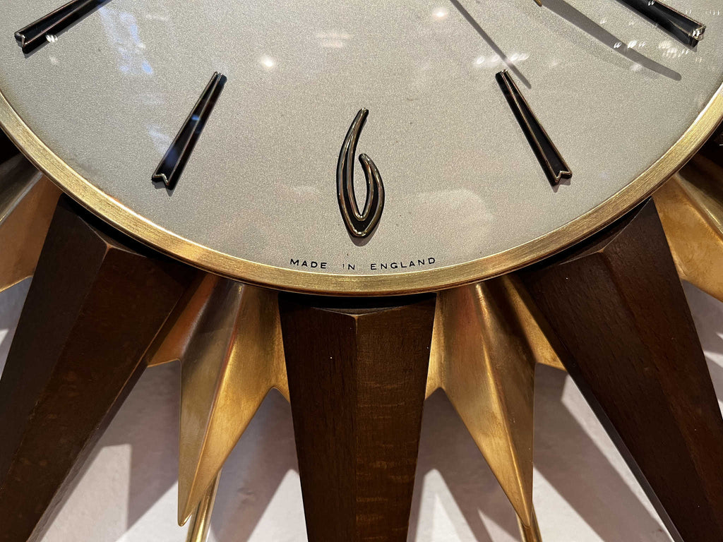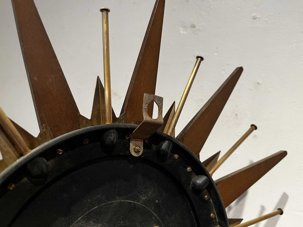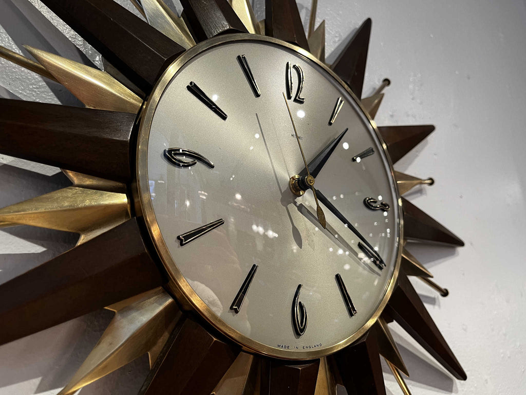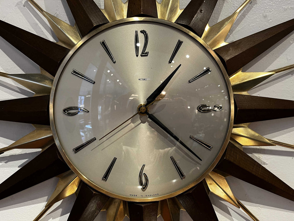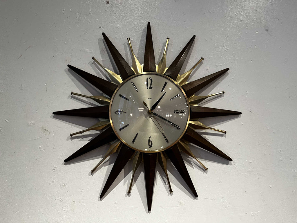 推定1970年代に制作されたスタークロック。ミッドセンチュリースタイルを代表するウォールクロック(壁掛時計)は、エッジの効いたデザインは存在感があり魅力的です。木材とメタルの異素材が組み合わさり、ユニークであたたかみのある雰囲気を演出します。お部屋のワンポイントとしてお迎えしてみてはいかがでしょうか。
