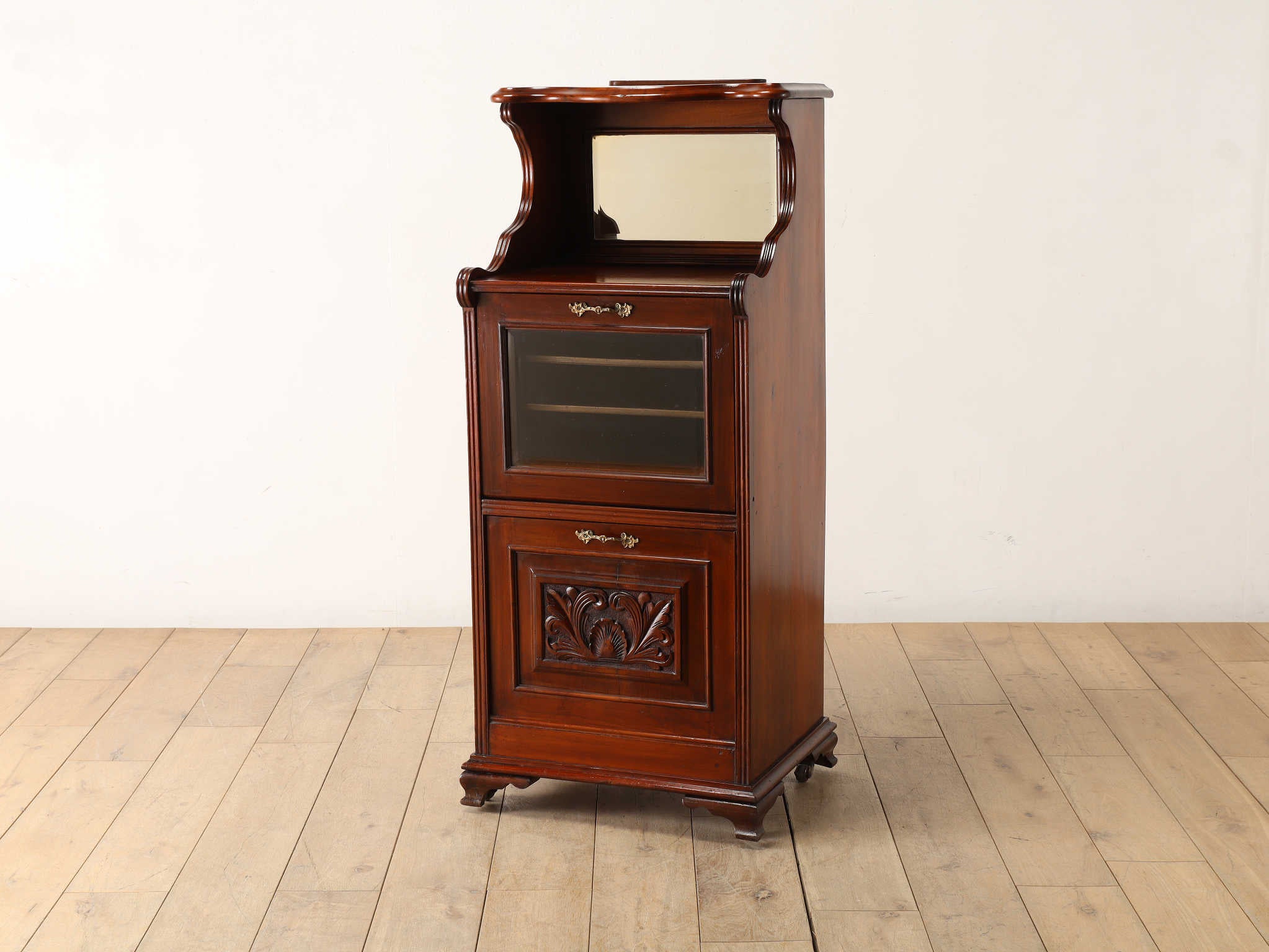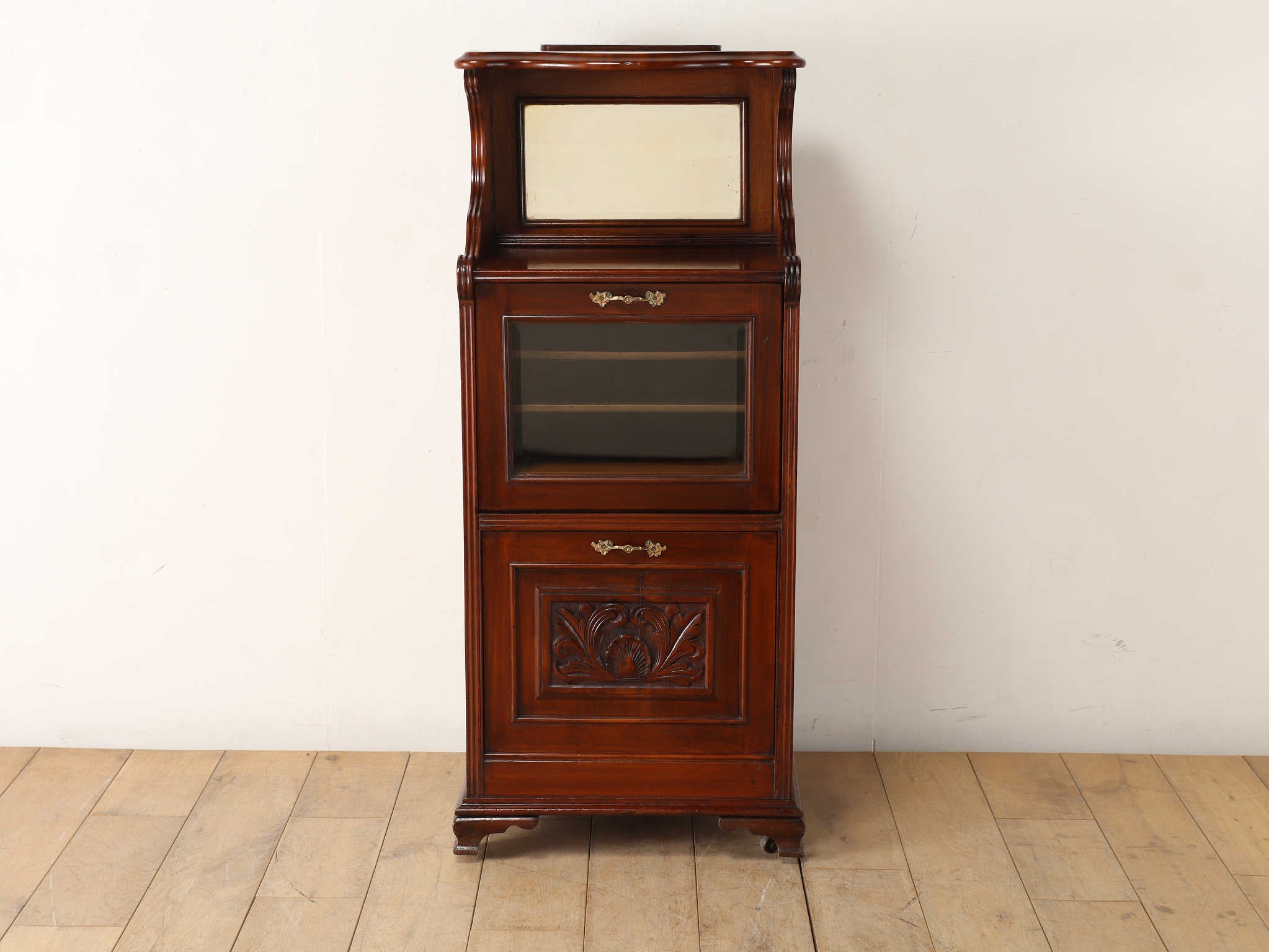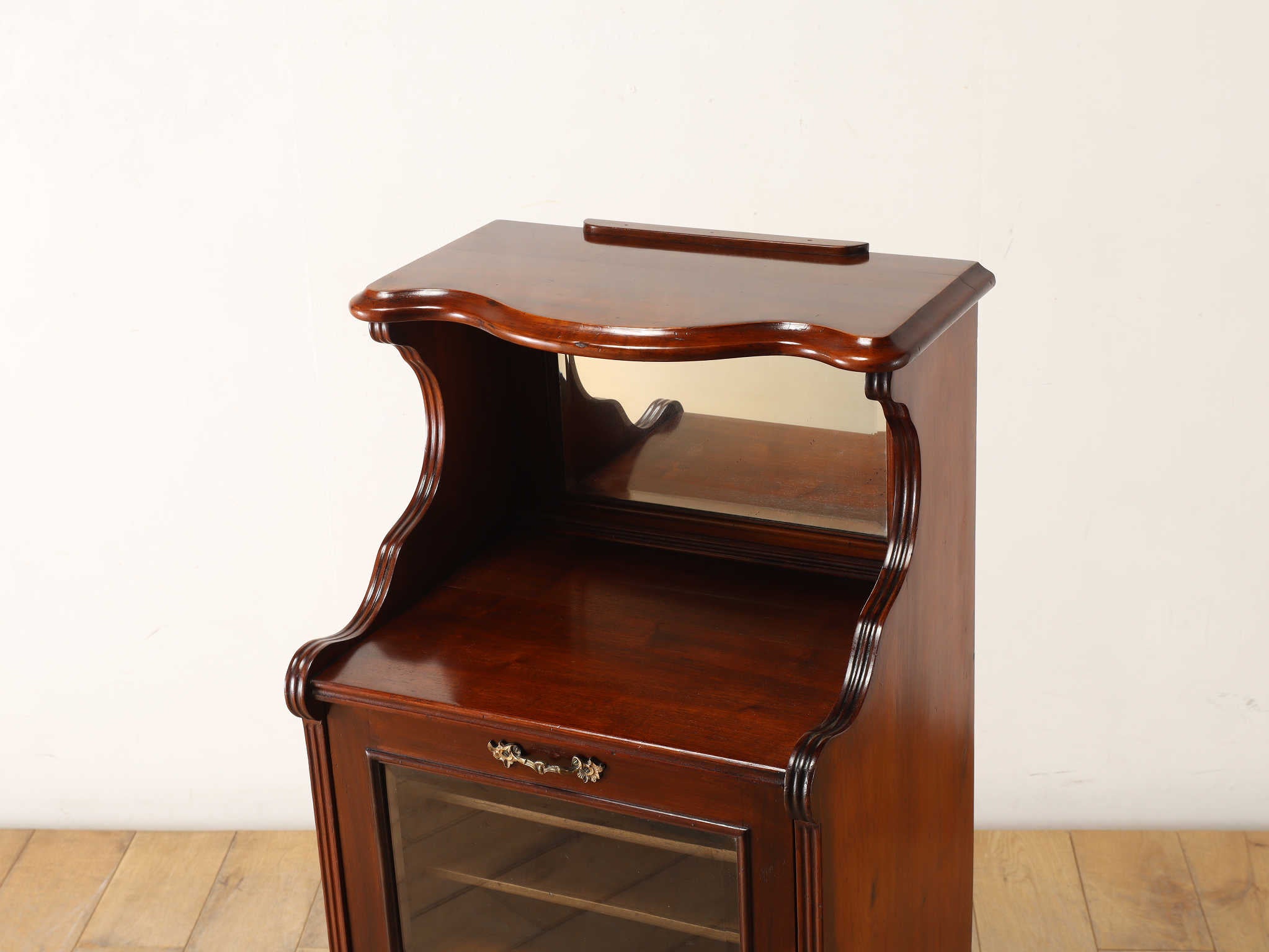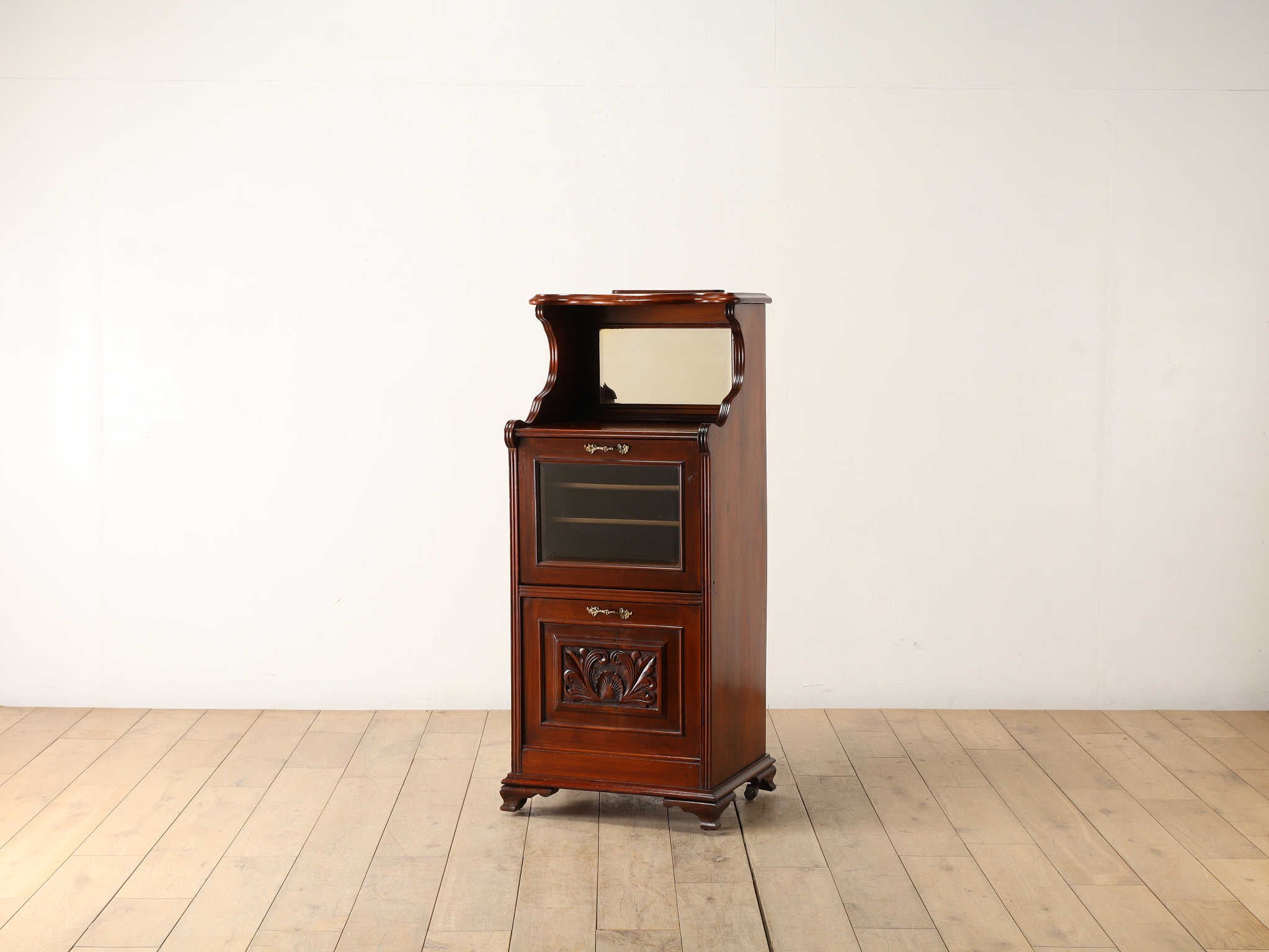 元来、レコード盤や楽譜などを収納する為に設計されたミュージックキャビネットと呼ばれる収納家具。アンティークにおいて、度々入荷のあるカテゴリーですが、デザインや材質など、様々なバリエーションがあり、一点物との出会いをより楽しめるとも言えます。その収納目的から、比較的小振りなものが多く、現代においてはディスプレイキャビネットやカップボードとして等、その用途は多岐に渡ります。こちらは上部にミラーが施されており、前に花やコレクションを並べていただくと奥行きがでて素敵な空間となるでしょう。