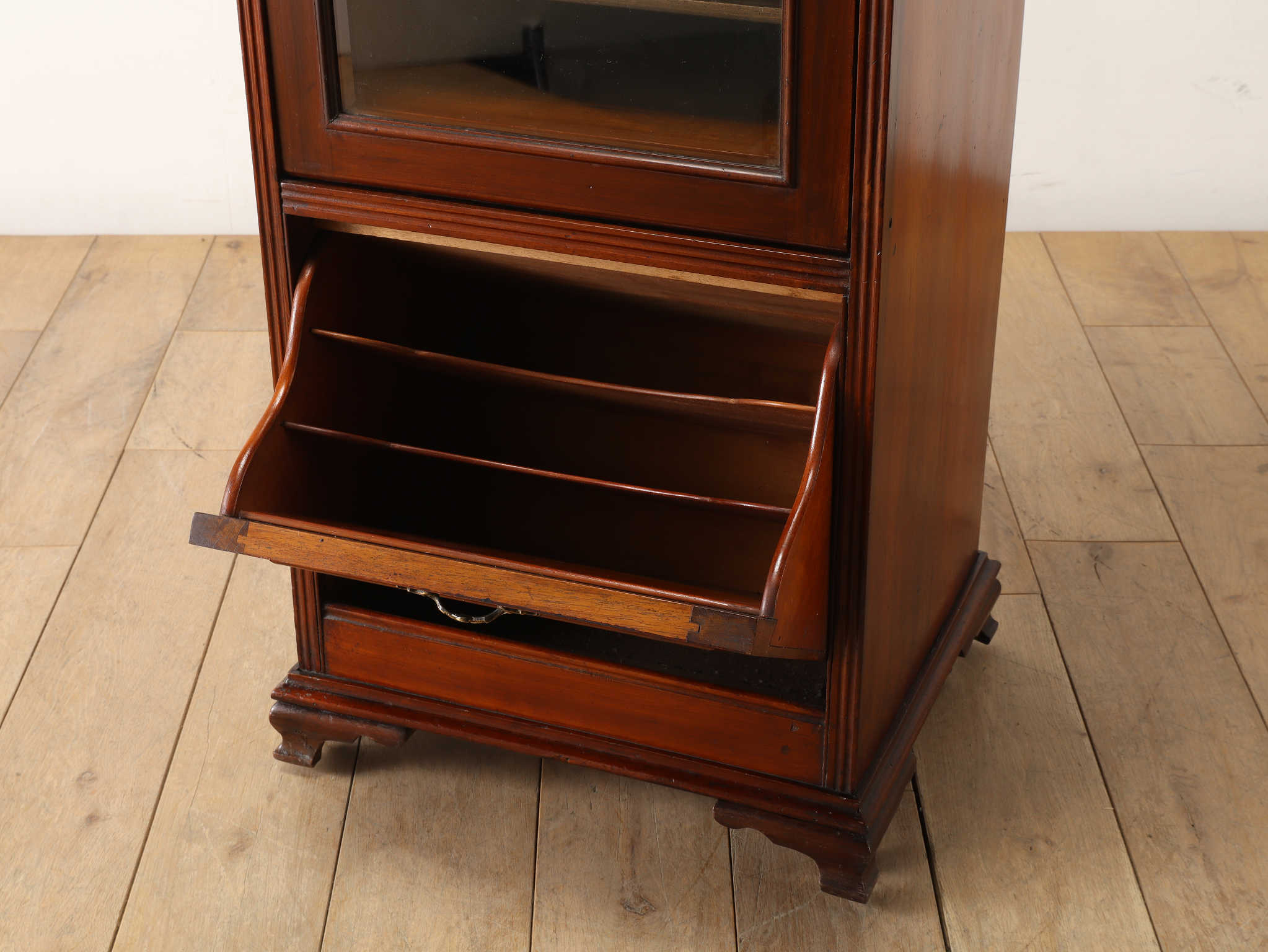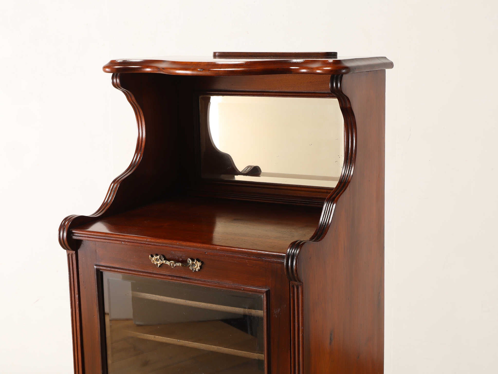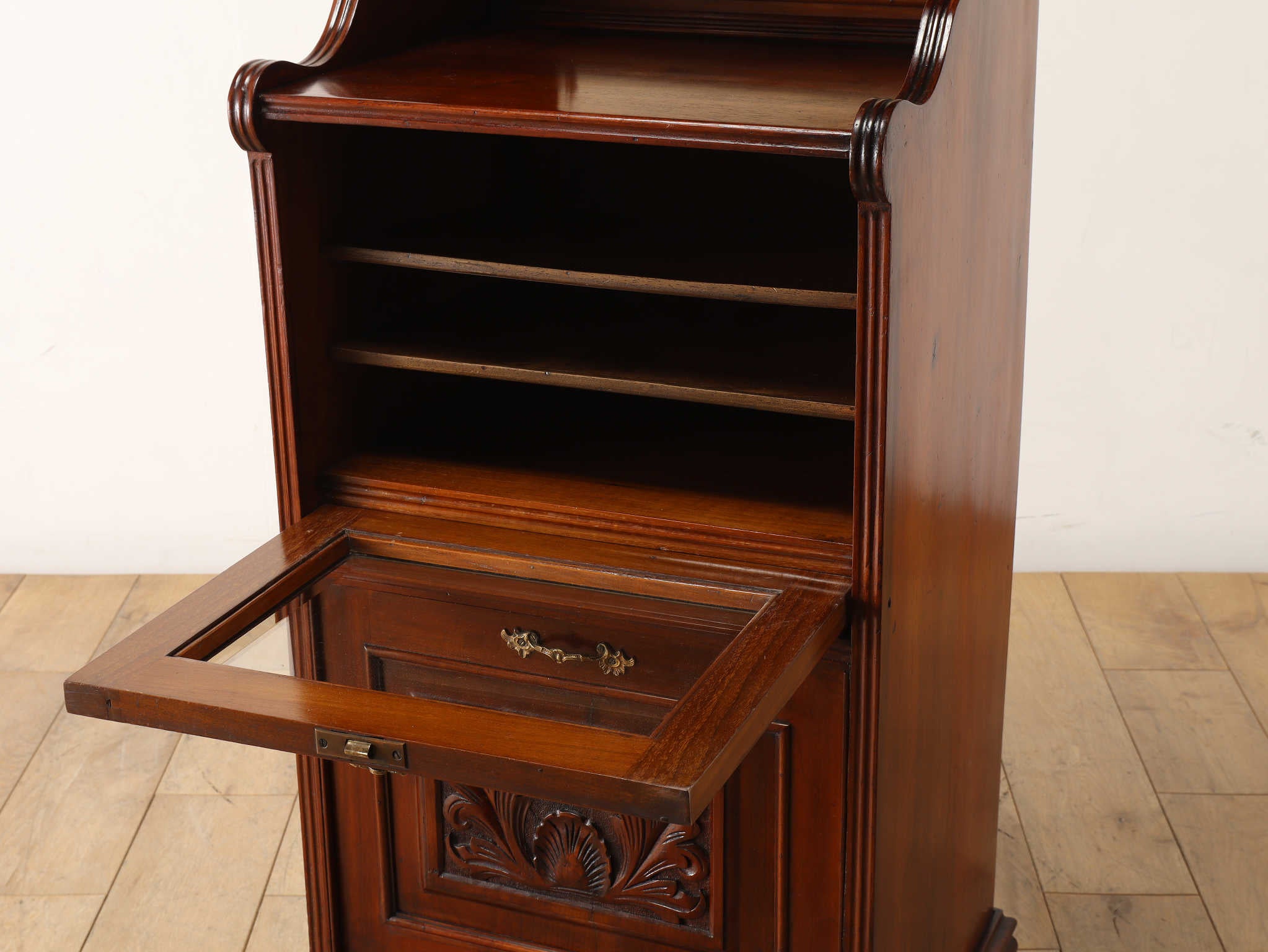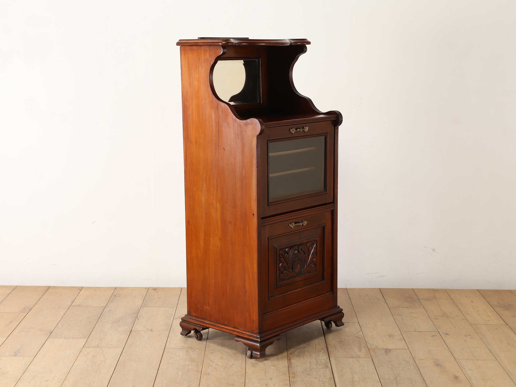 元来、レコード盤や楽譜などを収納する為に設計されたミュージックキャビネットと呼ばれる収納家具。アンティークにおいて、度々入荷のあるカテゴリーですが、デザインや材質など、様々なバリエーションがあり、一点物との出会いをより楽しめるとも言えます。その収納目的から、比較的小振りなものが多く、現代においてはディスプレイキャビネットやカップボードとして等、その用途は多岐に渡ります。こちらは上部にミラーが施されており、前に花やコレクションを並べていただくと奥行きがでて素敵な空間となるでしょう。