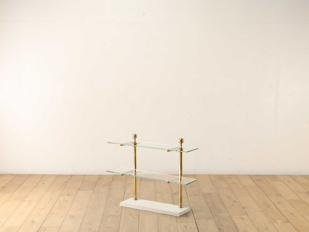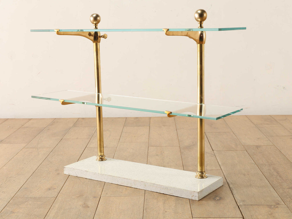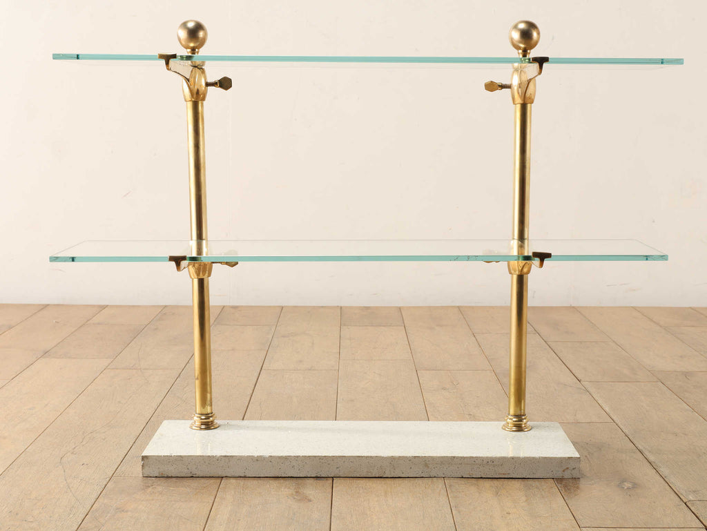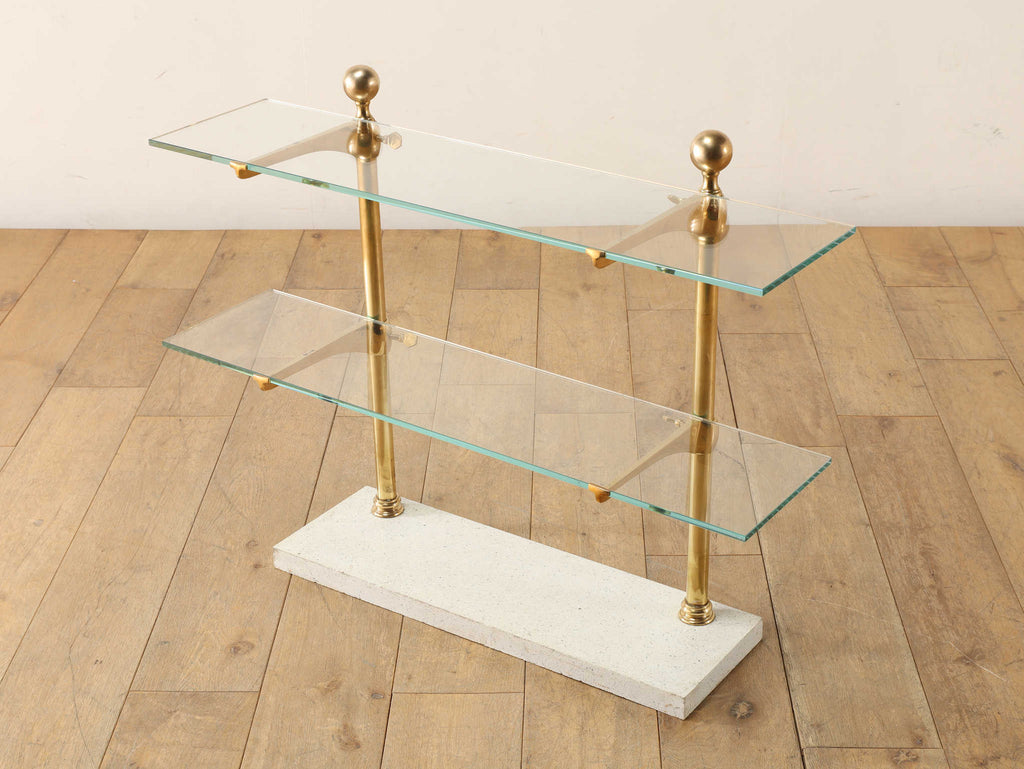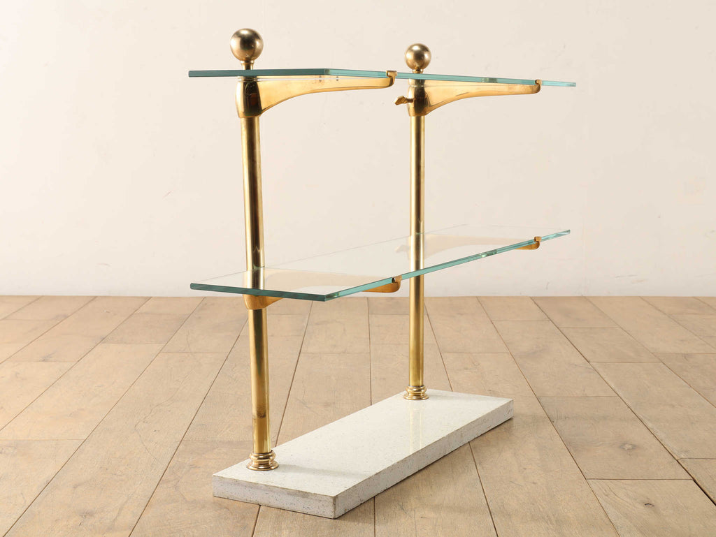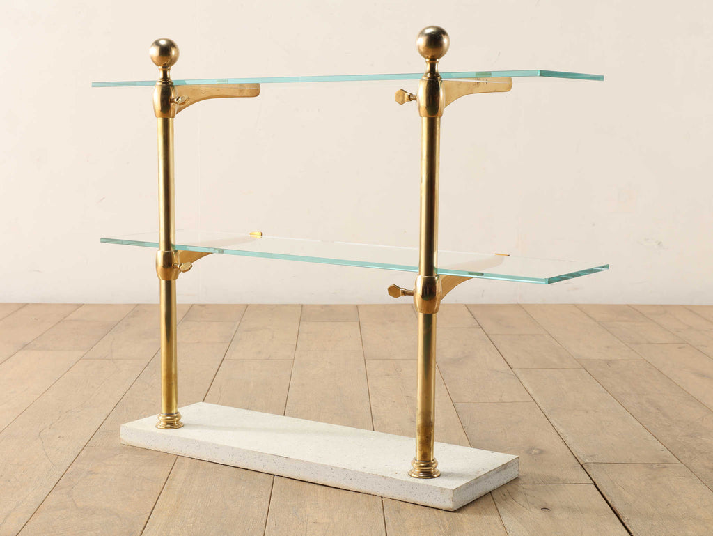 卓上用に作られた商品陳列用のシェルフ。1950年代(推定)の英国製アンティークです。真鍮製の支柱を大理石の台座が支えています。シンプルな佇まいなので、陳列するアイテムの魅力を邪魔することなく引き出すことが出来るでしょう。ショップユースはもちろんのこと、お持ちのコレクションを飾っていただくのにもお勧めのアイテムです。
