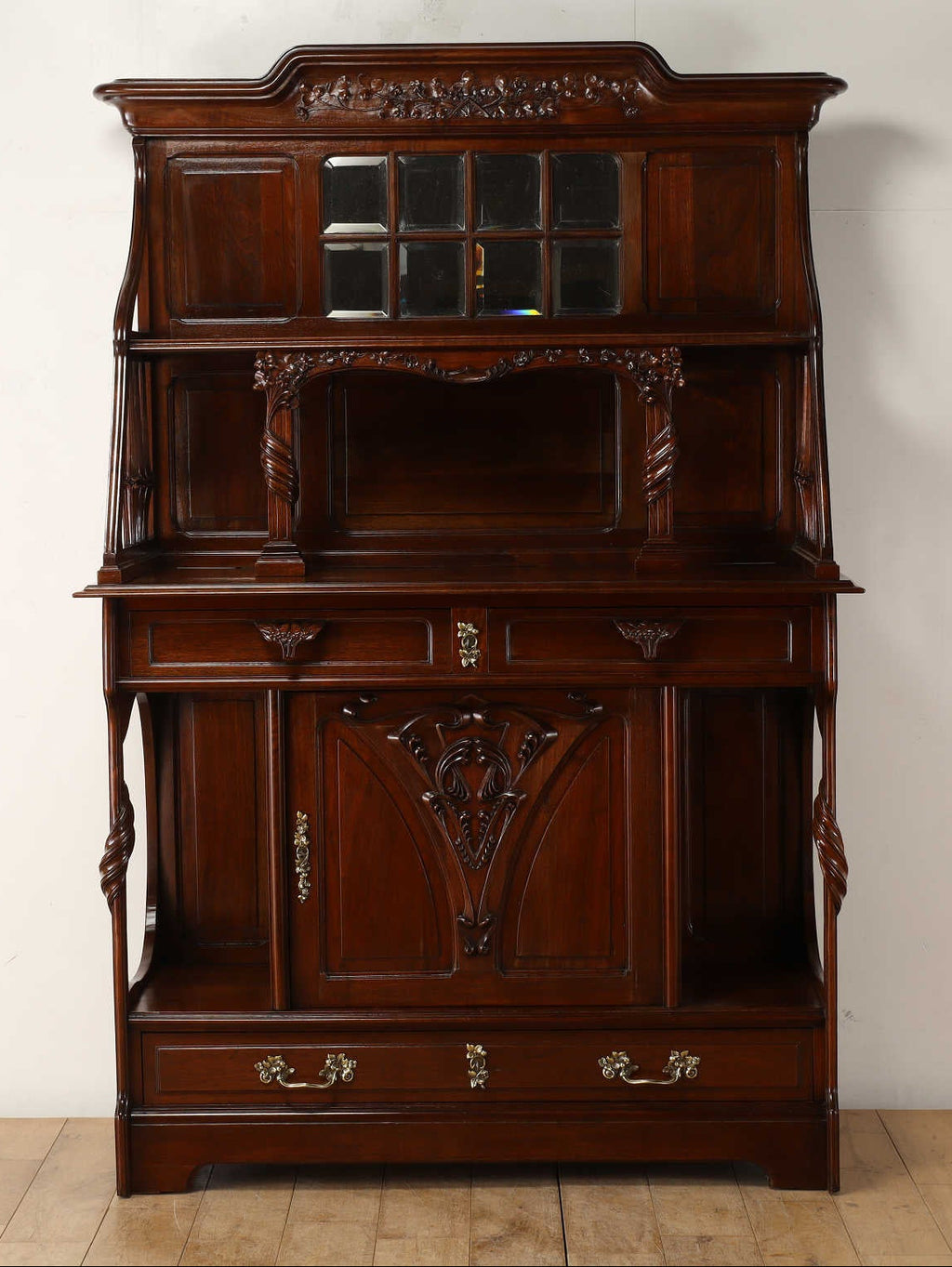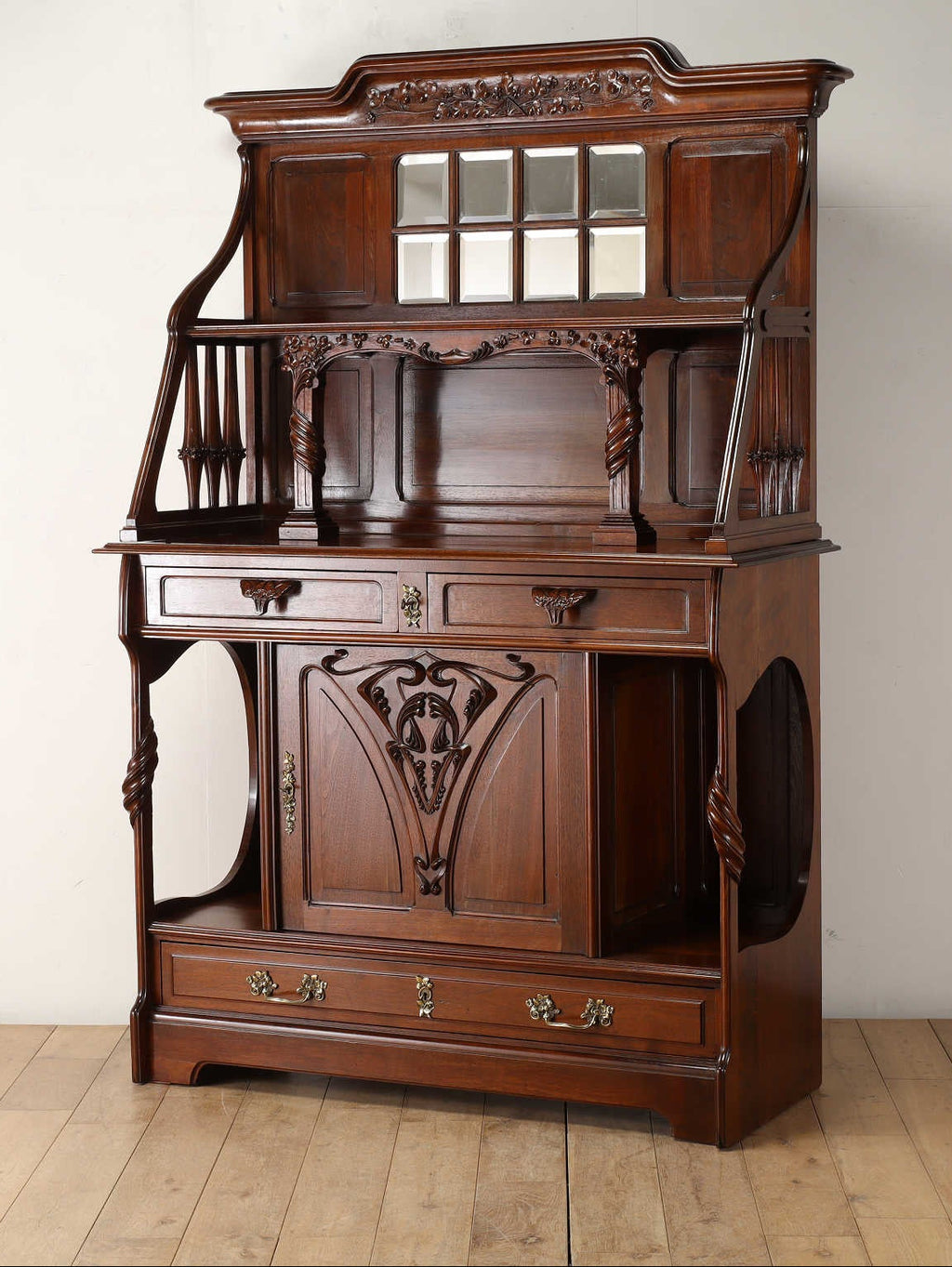1900年推定、フランス製の贅沢に散りばめられた装飾、質感の良いマホガニーが豪奢なサイドボード。サイズは大ぶりながらも、全体フォルムは角がないため柔らかな印象を与えます。デザインだけでなく、機能面も優れており、扉、抽斗の収納や、ミラーバックのデザインはお部屋を広く見せる効果があります。リビングやダイニングでお気に入りの食器やコレクションを並べたりとデコレーションも楽しんでいただけます。お部屋の主役にいかがでしょうか。