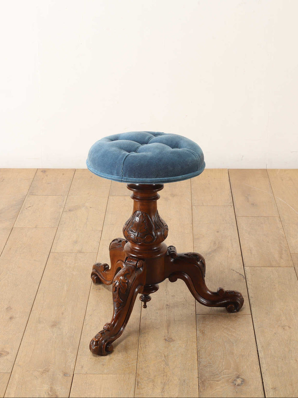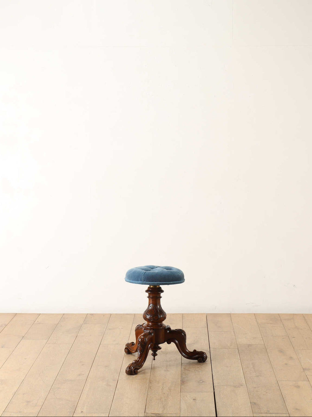 優美な佇まいの猫脚デザインが特徴の1880年代(推定)の英国製ピアノスツール。上品なウォルナットの風合いが目を惹く逸品です。数あるスツールの中でもデザイン性が高く、インテリアとしても人気があります。ピアノ周りのインテリアは当時、披露宴場や客間で使われる事が多く、当時の優雅な生活の象徴的なアイテムでもあり、アッパー層向けに多く製造されています。そのため材木が一級品であり、素晴らしい意匠を感じられるピュアアンティークな名品である場合が多いです。こちらのピアノスツールも例に漏れず、確かな気品と贅沢な木材の使用を見ることができます。ピアノ用に使用されたとされますが、現代では異なるシチュエーションで使ってみるのもアンティークの楽しみ方の一つです。玄関や廊下の腰掛けとして、窓際にテーブルと合わせて寛ぐ場所など、日常のあらゆるシーンで活用してみてはいかがでしょうか。【ファブリック】