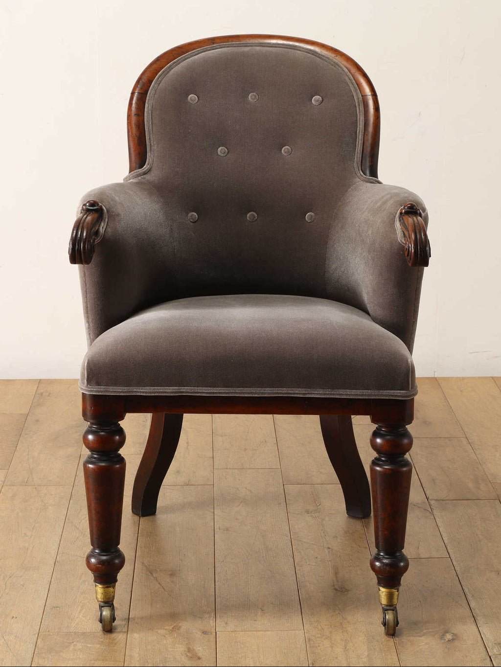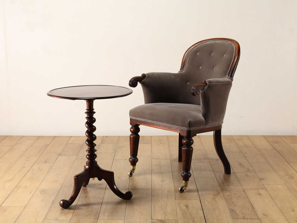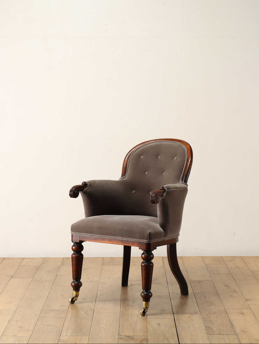 1820年代(推定)ジョージアン期に作製されたとされるアームチェアです。リージェンシースタイルとも呼ばれる時代であり、一般的に流通するアンティーク家具の年代としては特に古い時代に位置します。その後、装飾性を追求していったヴィクトリア時代とは対象的な佇まいのこちらのチェアは、装飾性が省かれた代わりに、思わず見惚れてしまうような、マホガニーの素朴で奥深い質感が特に強調され、内側から滲みでる存在感に心を打たれます。長年引き継がれてくる年代物、アンティークの魅力を現代の私達が享受できる素晴らしさを教えてくれているようです。生活のキーになるような、そんな逸品です。【ファブリック】