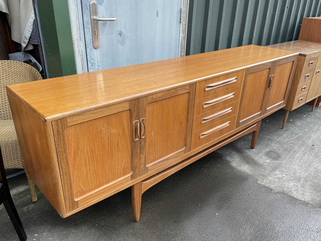 英国ミッドセンチュリーを代表するG-PLANシリーズ。その中でも高い人気を誇るフレスコのサイドボードは、普遍的な美しさとデザインの魅力があり、長年愛されて来た逸品であります。伸びやかでスマートな印象は実にモダンでありつつ、チークの無垢材が表現する質感は、ヴィンテージらしい奥深さがあります。近年、流通も少なくなりつつあり、今後も希少性が増していくと推測されるモデルです。