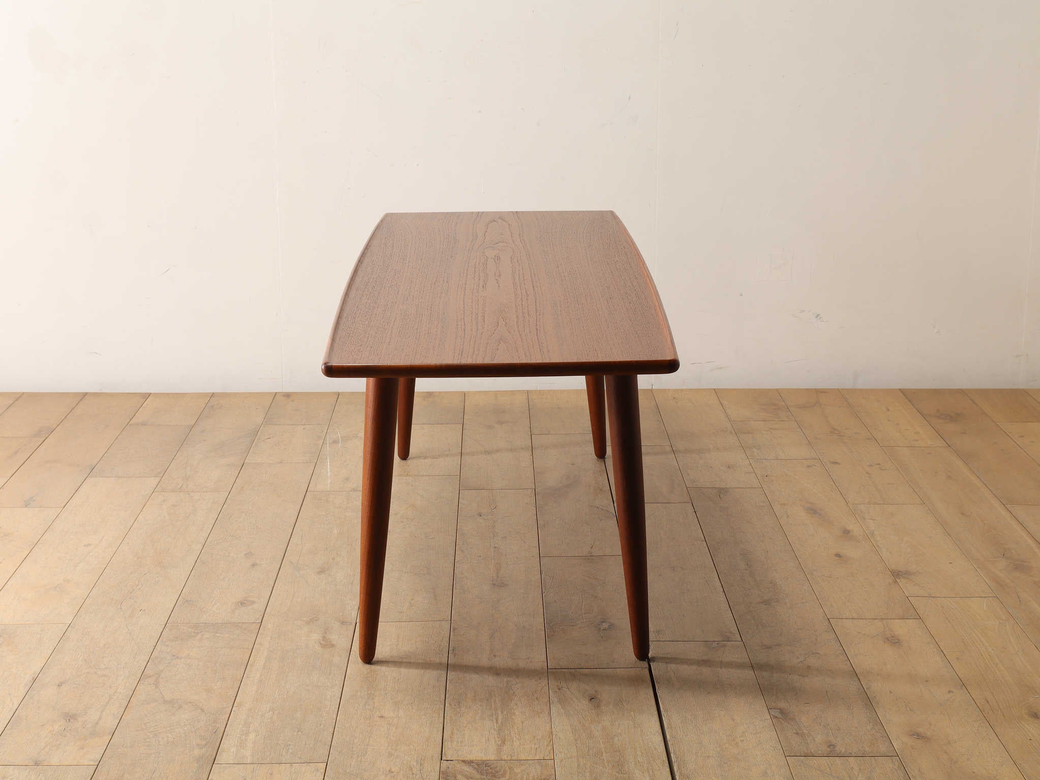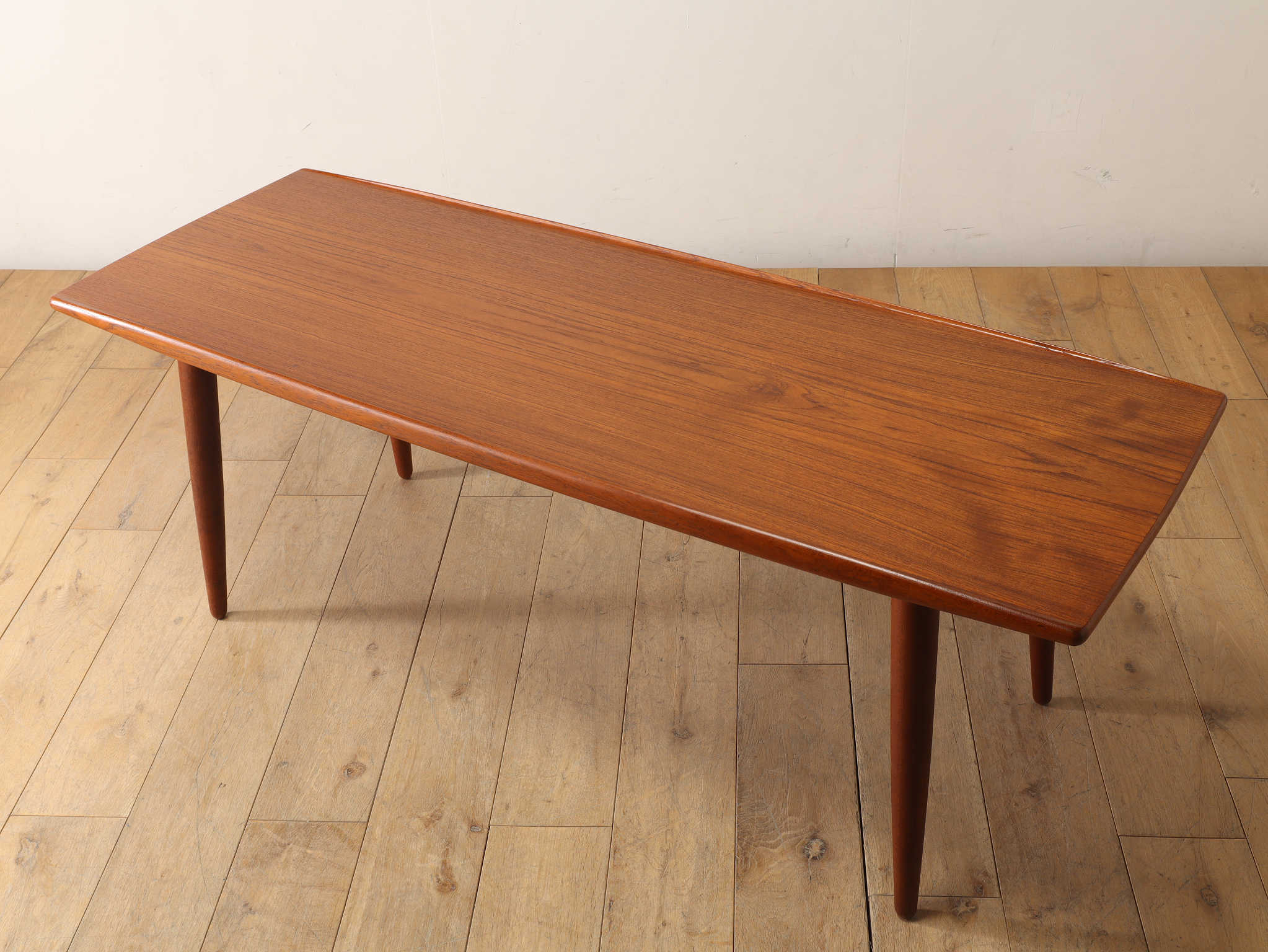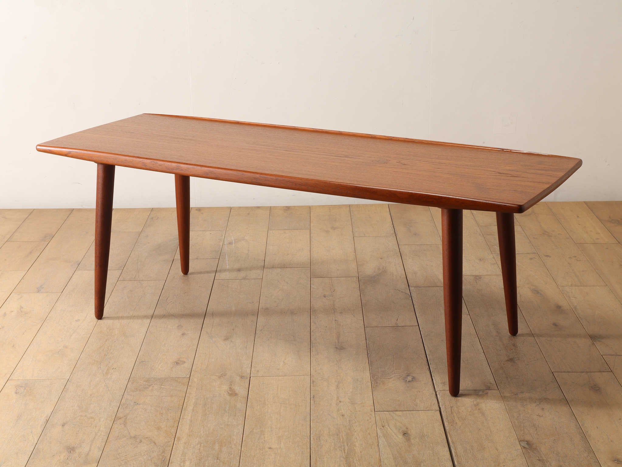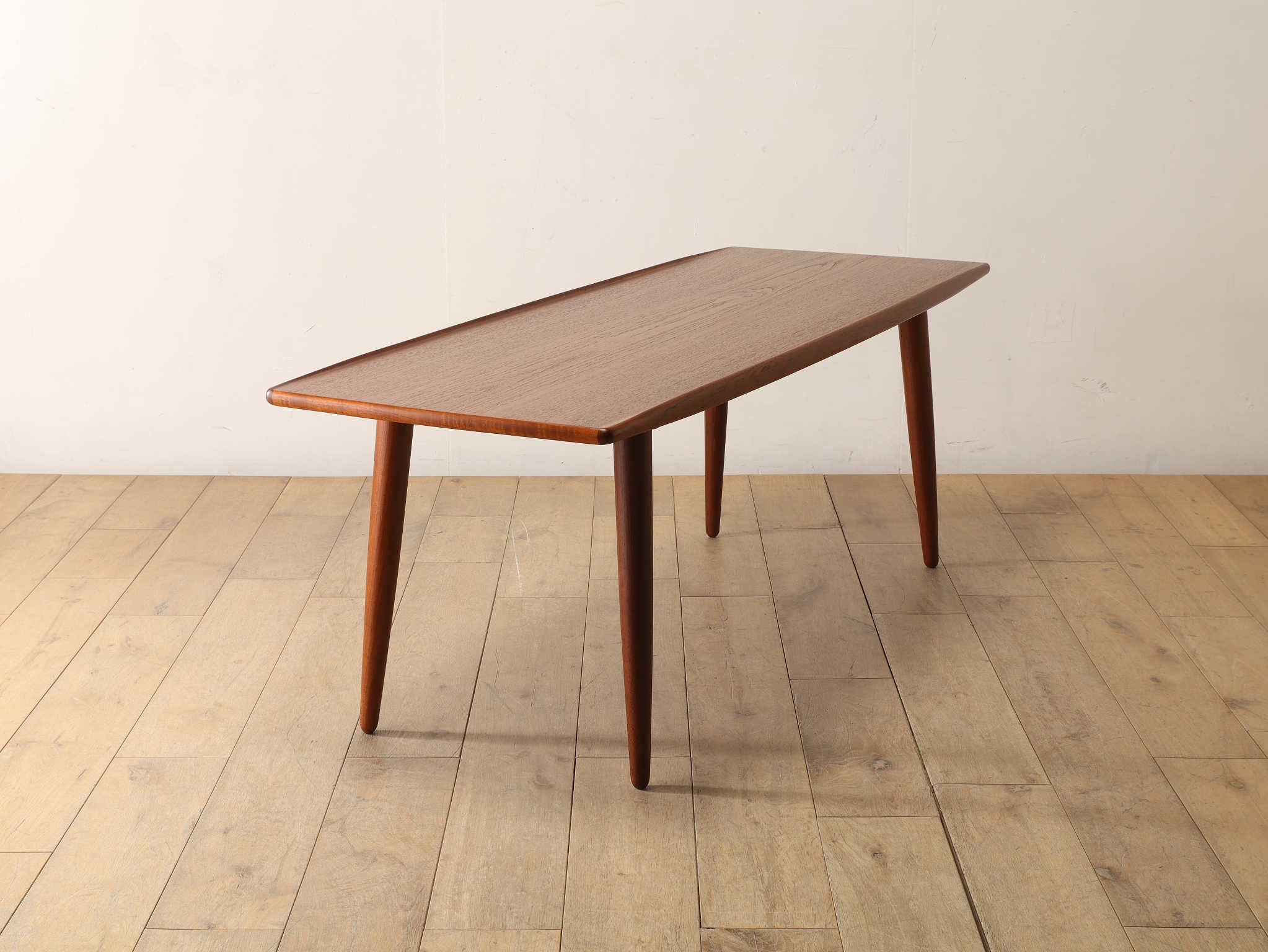 チーク材の温かみある色合いと、滑らかできめ細やかな木材の質感が美しい、北欧ヴィンテージのコーヒーテーブル。かなりシンプルなフォルムではありながら、天板の左右の丸みのついたシェイプや縁のたちあがりなど、細かい作りが北欧らしく、こだわりの詰まったプロダクトであることが感じられるます。シンプルモダンの現代のソファとも、ヴィンテージソファとも相性が良く、リビングの主役として活躍しそうなテーブルです。
