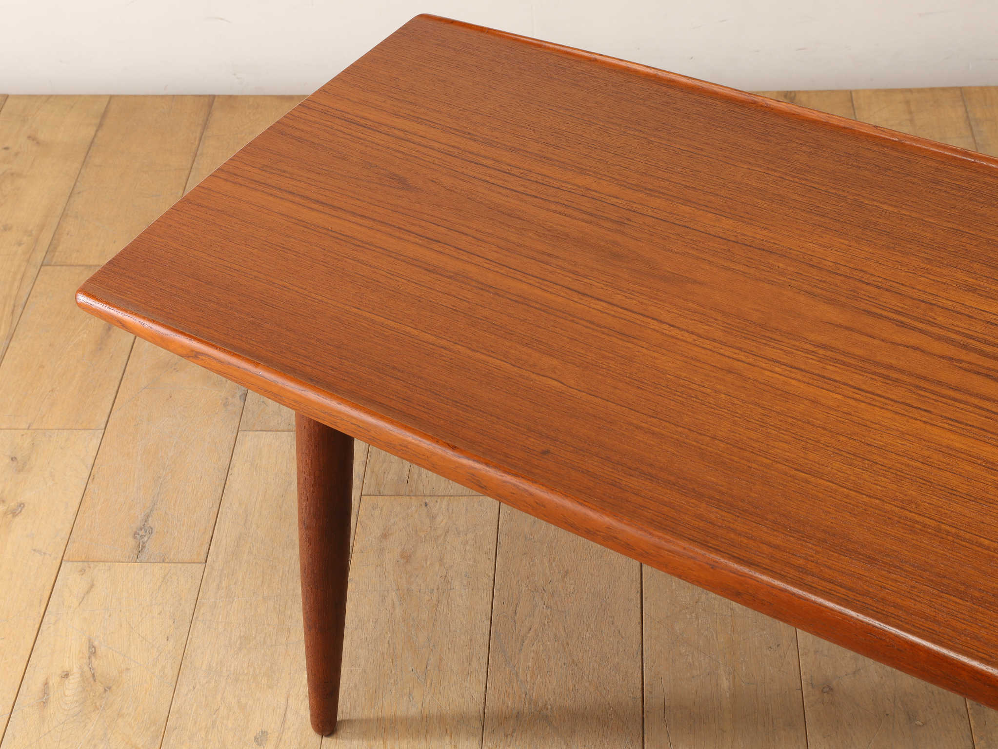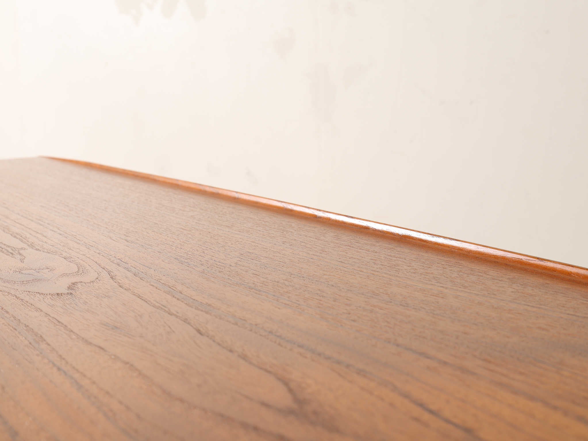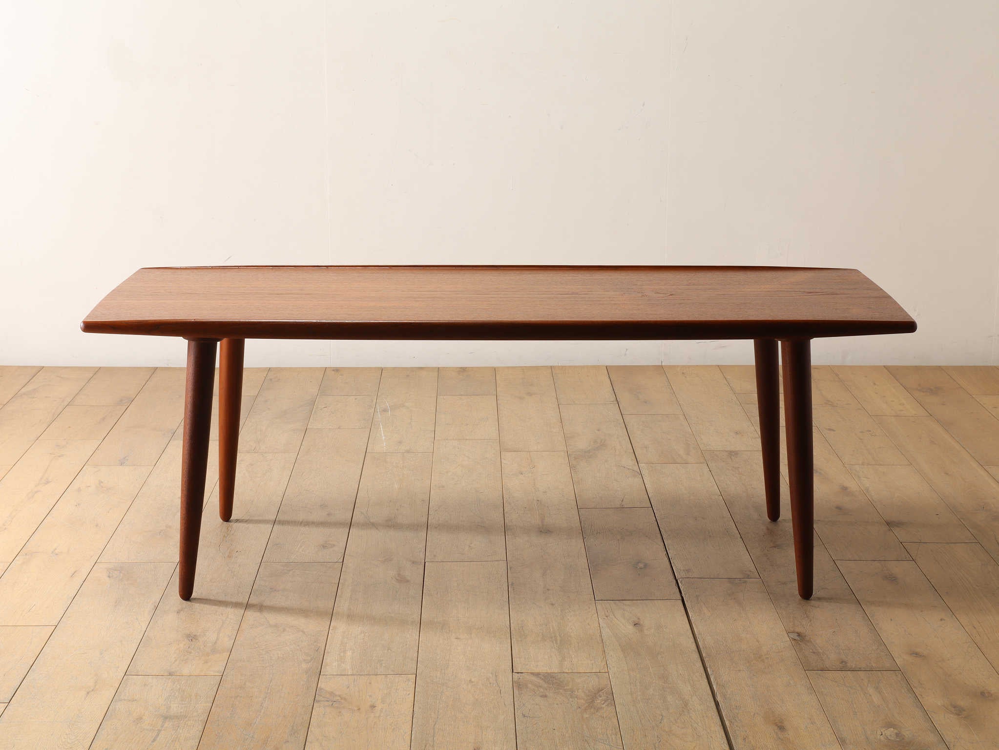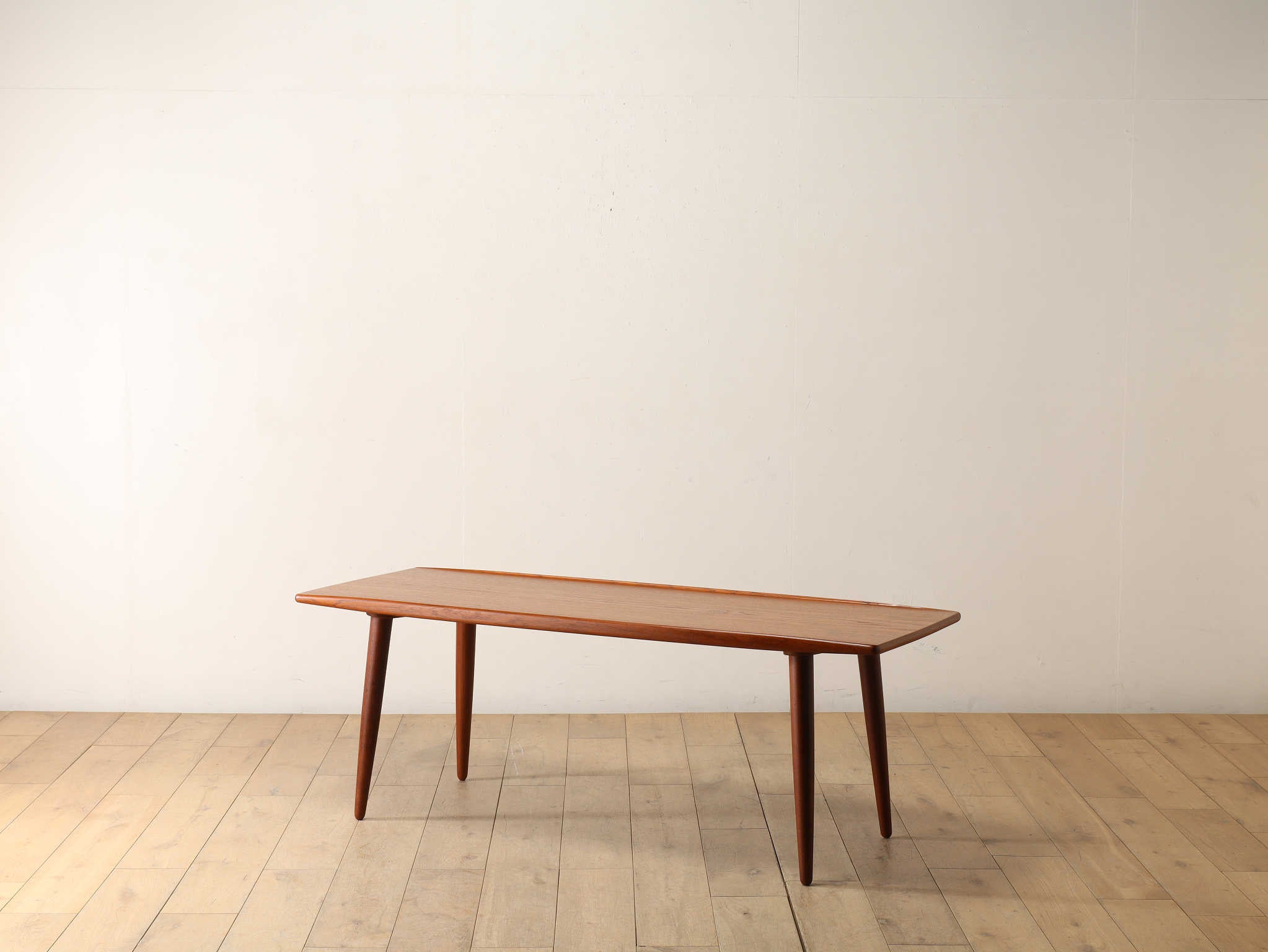 チーク材の温かみある色合いと、滑らかできめ細やかな木材の質感が美しい、北欧ヴィンテージのコーヒーテーブル。かなりシンプルなフォルムではありながら、天板の左右の丸みのついたシェイプや縁のたちあがりなど、細かい作りが北欧らしく、こだわりの詰まったプロダクトであることが感じられるます。シンプルモダンの現代のソファとも、ヴィンテージソファとも相性が良く、リビングの主役として活躍しそうなテーブルです。