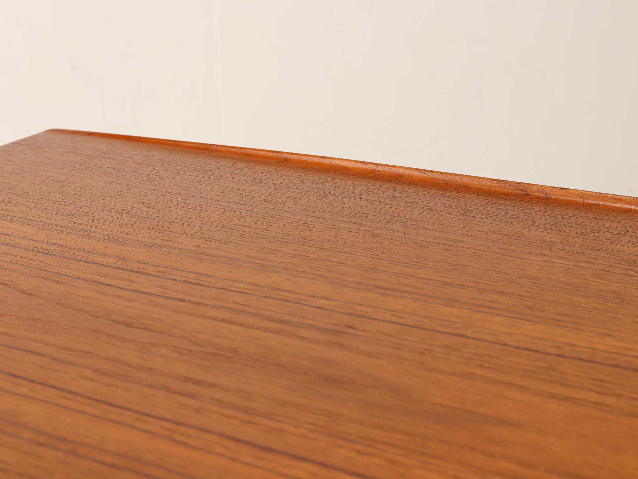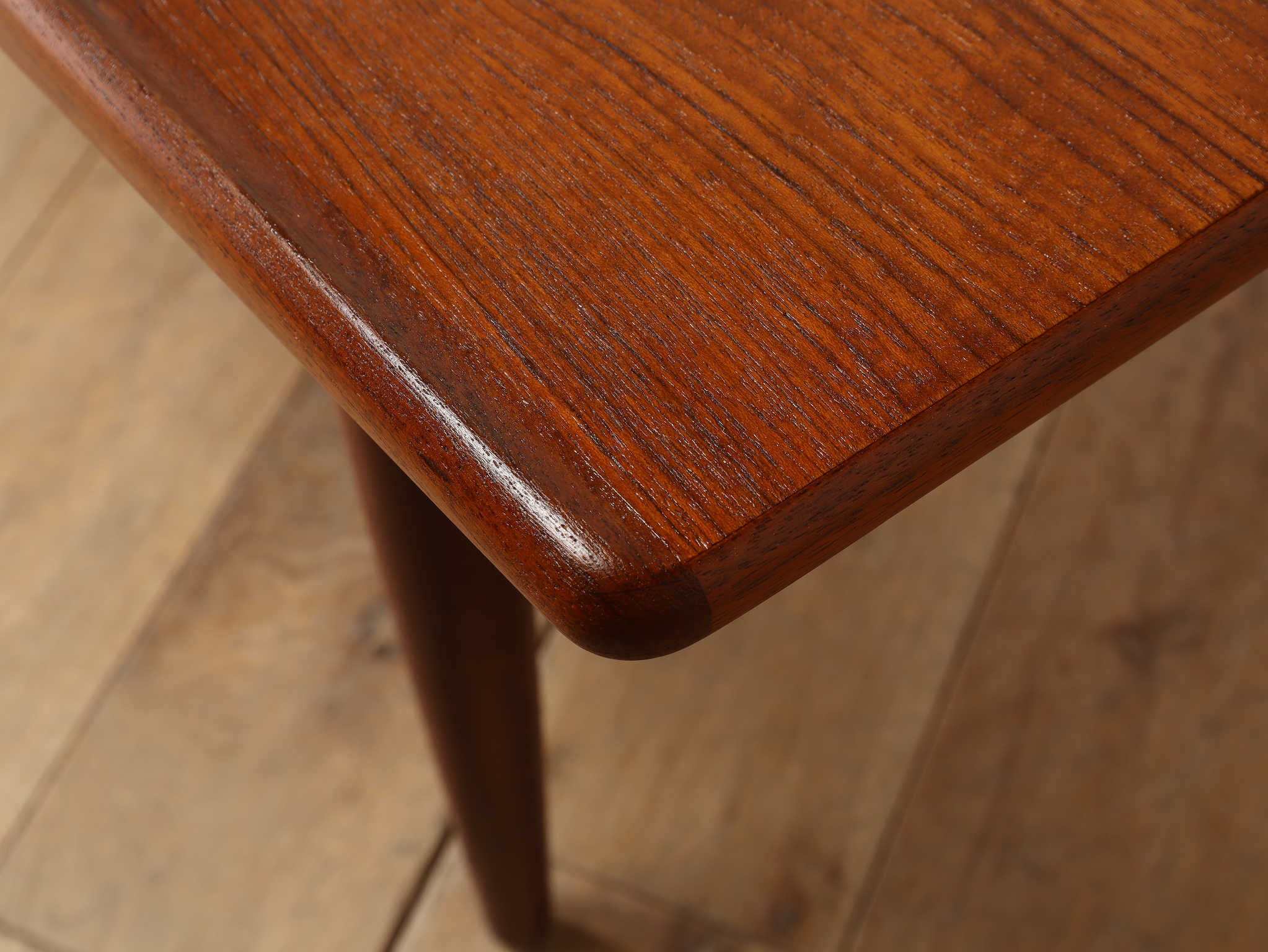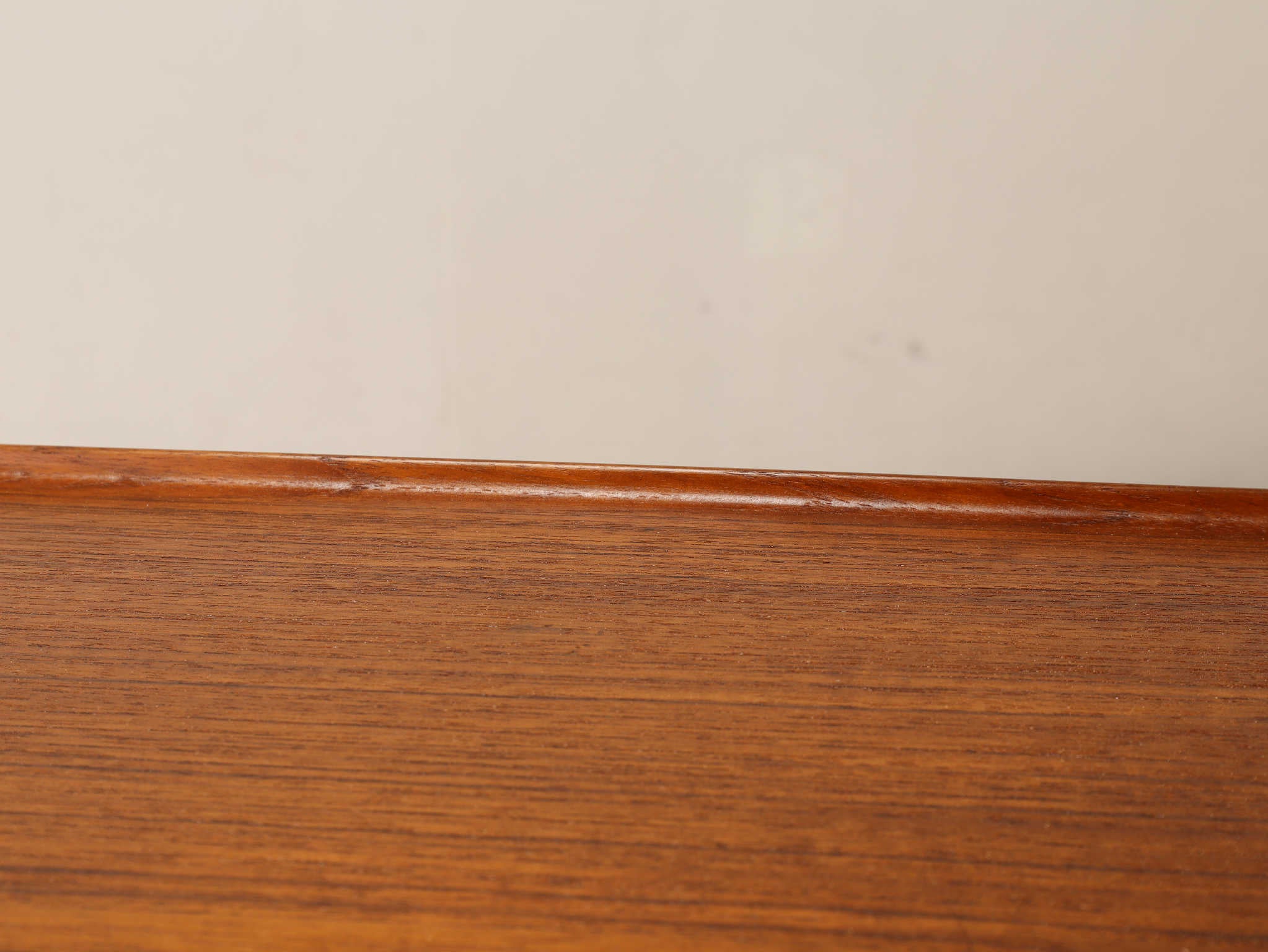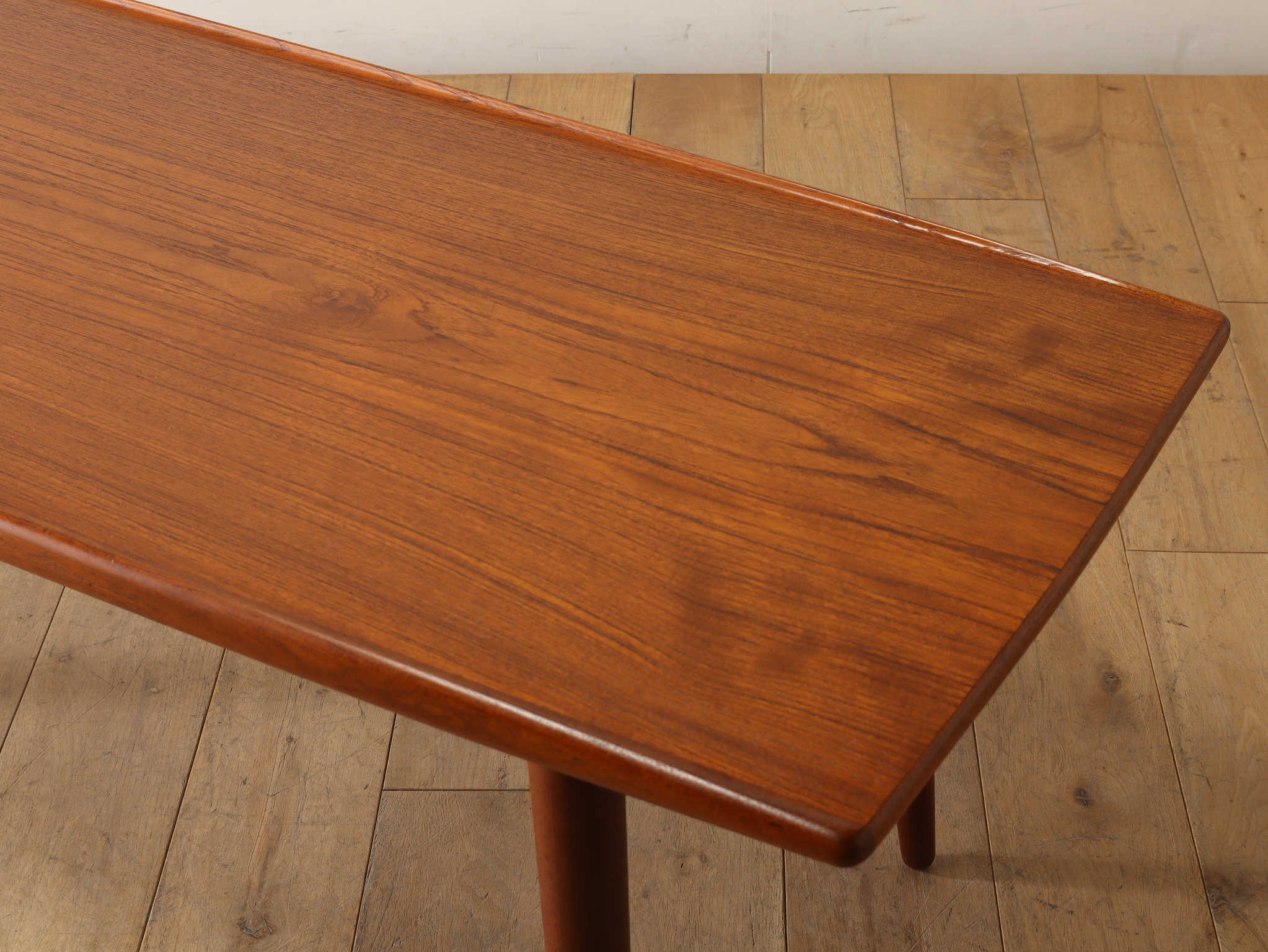 チーク材の温かみある色合いと、滑らかできめ細やかな木材の質感が美しい、北欧ヴィンテージのコーヒーテーブル。かなりシンプルなフォルムではありながら、天板の左右の丸みのついたシェイプや縁のたちあがりなど、細かい作りが北欧らしく、こだわりの詰まったプロダクトであることが感じられるます。シンプルモダンの現代のソファとも、ヴィンテージソファとも相性が良く、リビングの主役として活躍しそうなテーブルです。