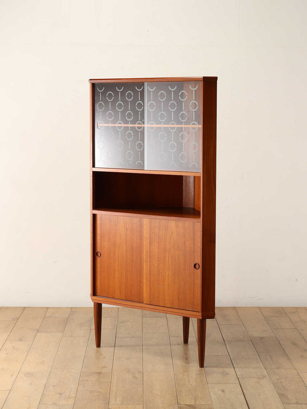 デンマークで買い付けられたガラスに特徴的なパターンが入ったチーク材のコーナーシェルフになります。経年により風合いの変化を楽しめる美しく流れる杢目は、北欧ヴィンテージらしい温もりをお部屋にもたらしてくれることでしょう。省スペースにピッタリとフィットし圧迫感を感じずにお部屋に収まり、戸棚はスライド式のため扉の開閉にスペースを取らないのも魅力の一つです。食器棚、飾り棚、本棚としてなど様々な用途での活躍が期待できる人気の高いおすすめの家具です。