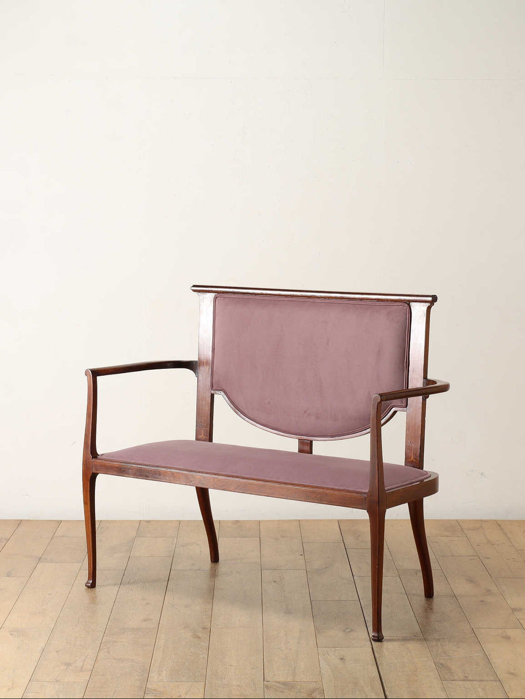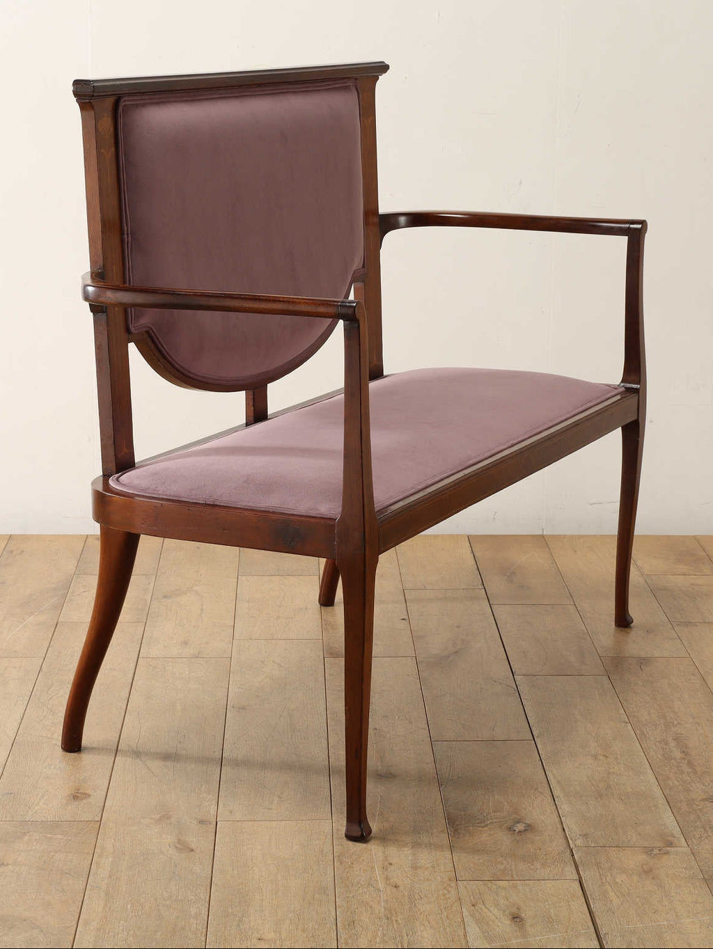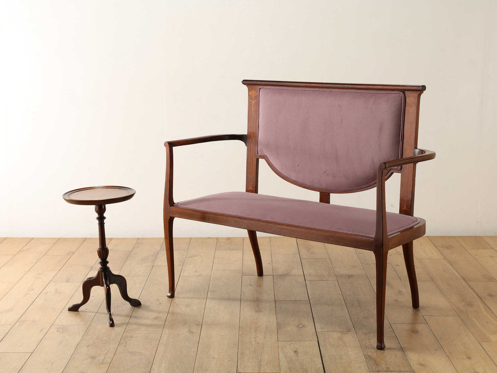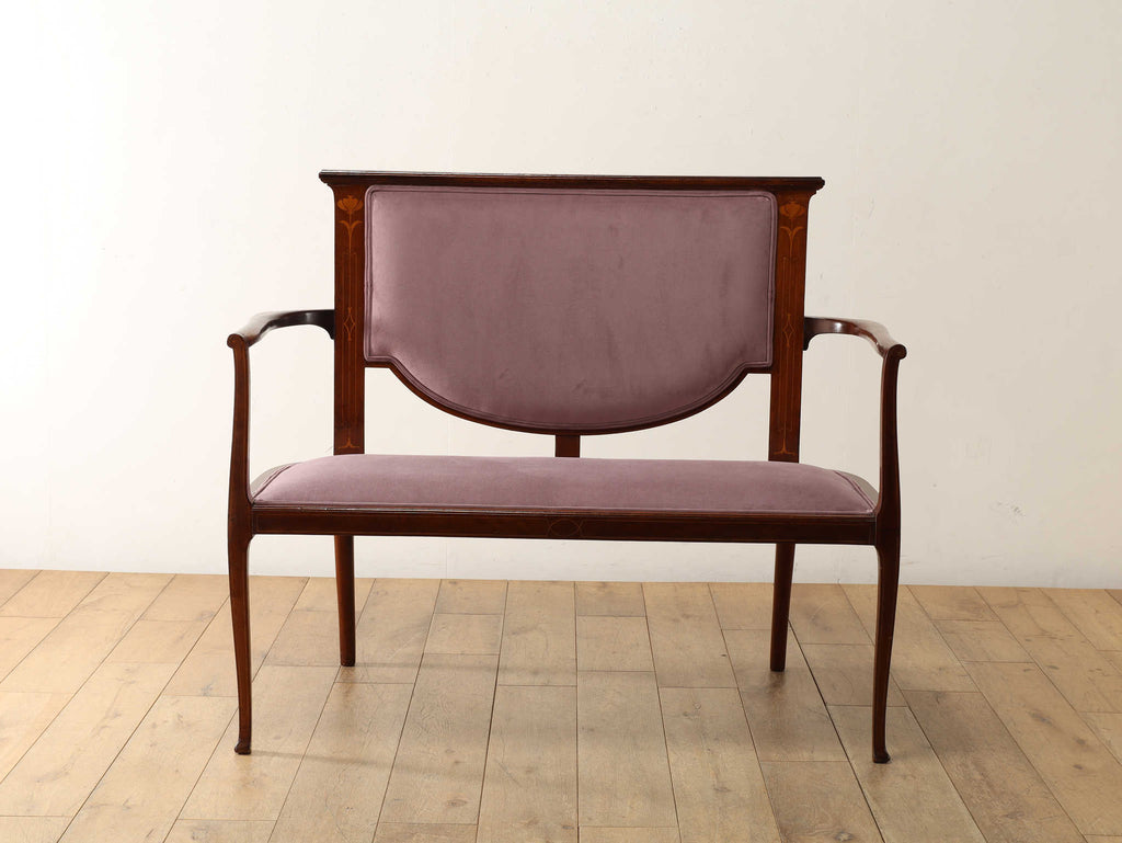 背もたれの繊細なインレイが上品で大変高貴な印象を与えるアールヌーヴォーセティ。アールヌーヴォーとは、19世紀末から20世紀初頭にかけてヨーロッパを中心に開花した国際的な美術運動を指し「新しい芸術」を意味します。花や植物などの有機的なモチーフや自由曲線の組み合わせによる従来の様式に囚われない装飾性が特徴です。こちらのセティも線が細く、華奢で女性らしいデザインです。【ファブリック】