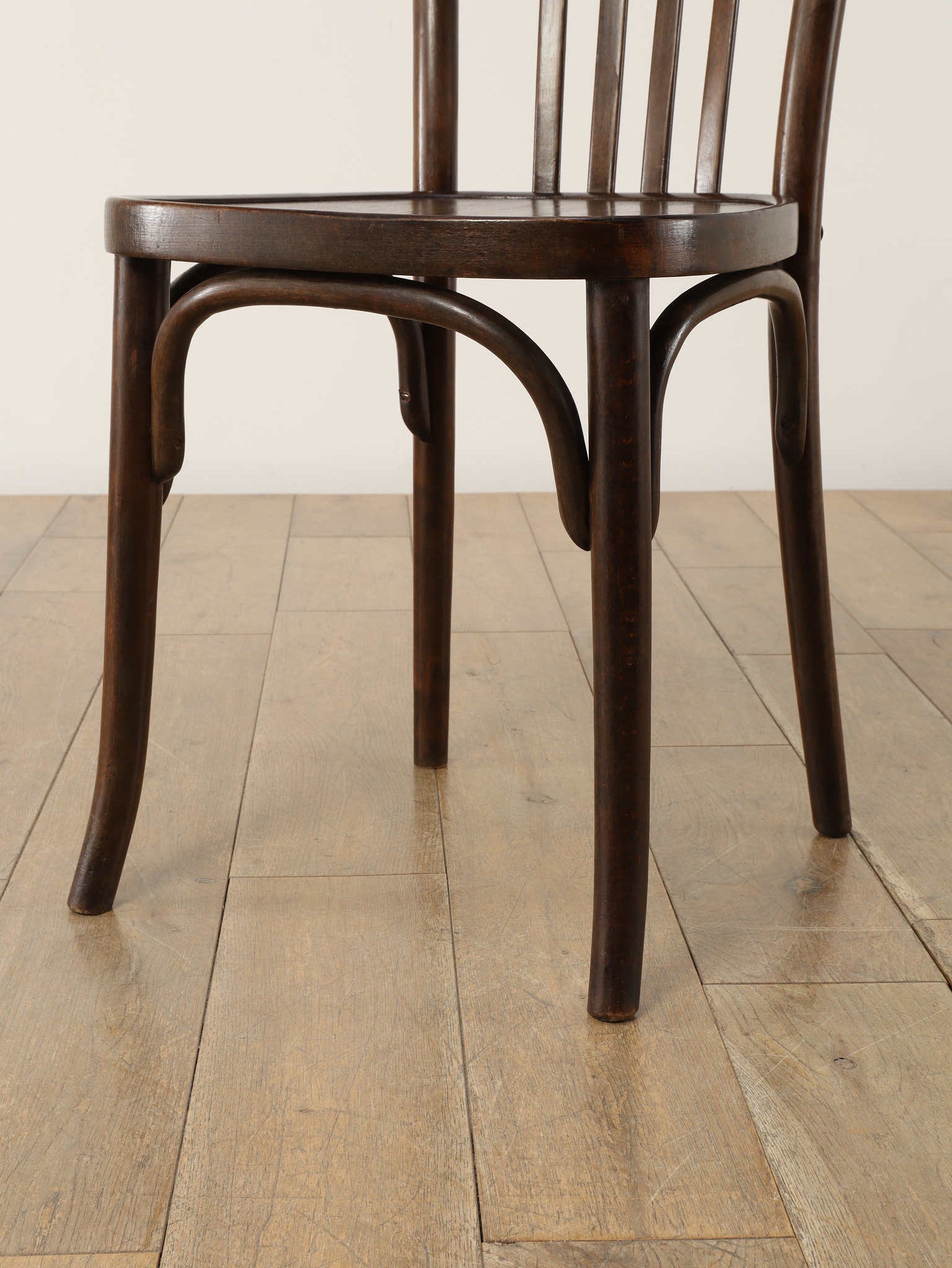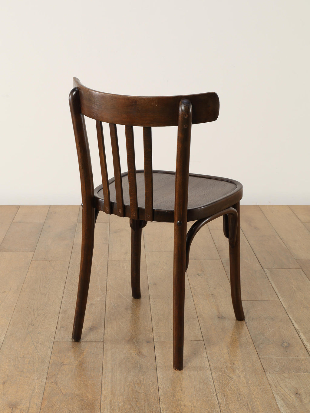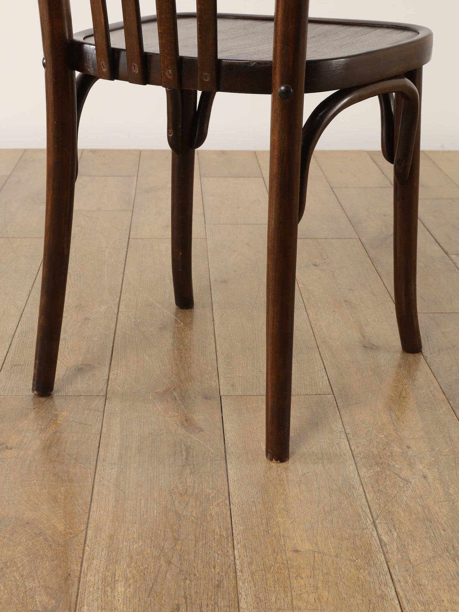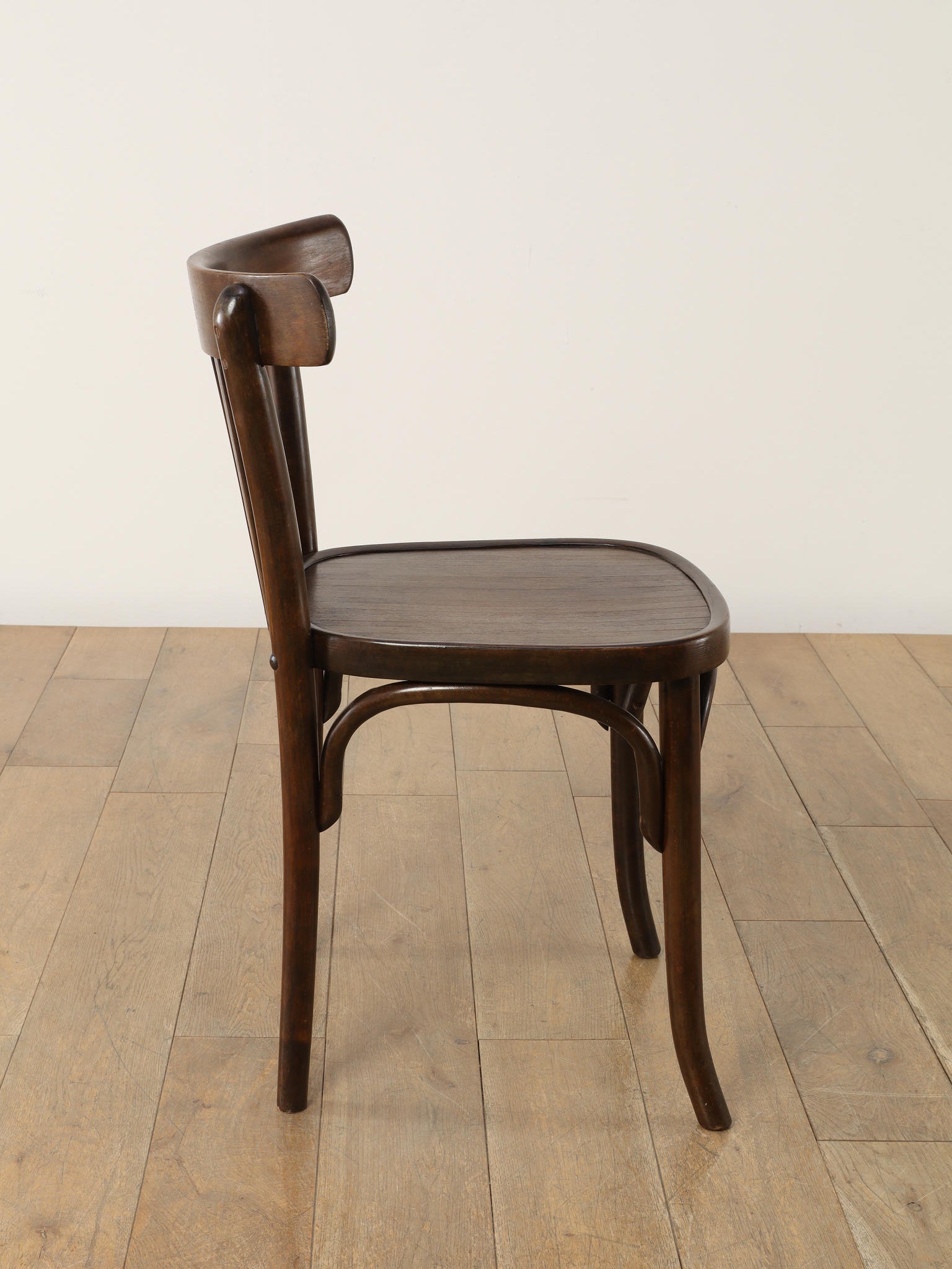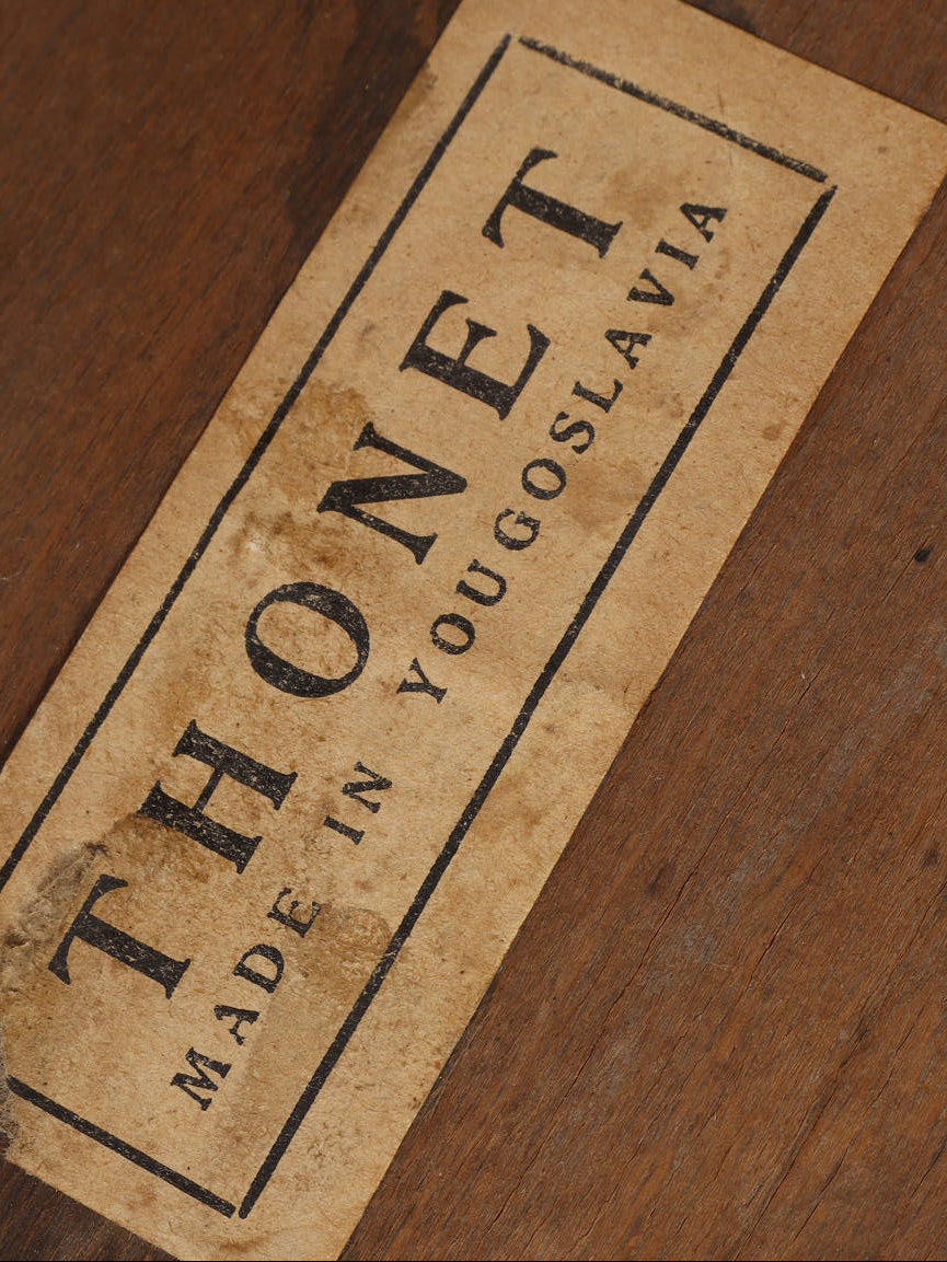 100年の時を重ねた希少なTHONET社のベントウッドチェア。1920年代、ユーゴスラビアで製作された伝統的な曲木家具です。座面にストライプ模様がプレスされ、湾曲した背もたれが低めに設計されています。曲木(ベントウッド)技法による滑らかな曲線美と、長年の使用による木の経年変化が織りなす深い色合いは、ヴィンテージ家具ならではの味わい深さを醸し出しています。カフェやダイニング、書斎など、どんな空間にも馴染むデザインは、現代のインテリアに温かみのあるアクセントを添えてくれることでしょう。