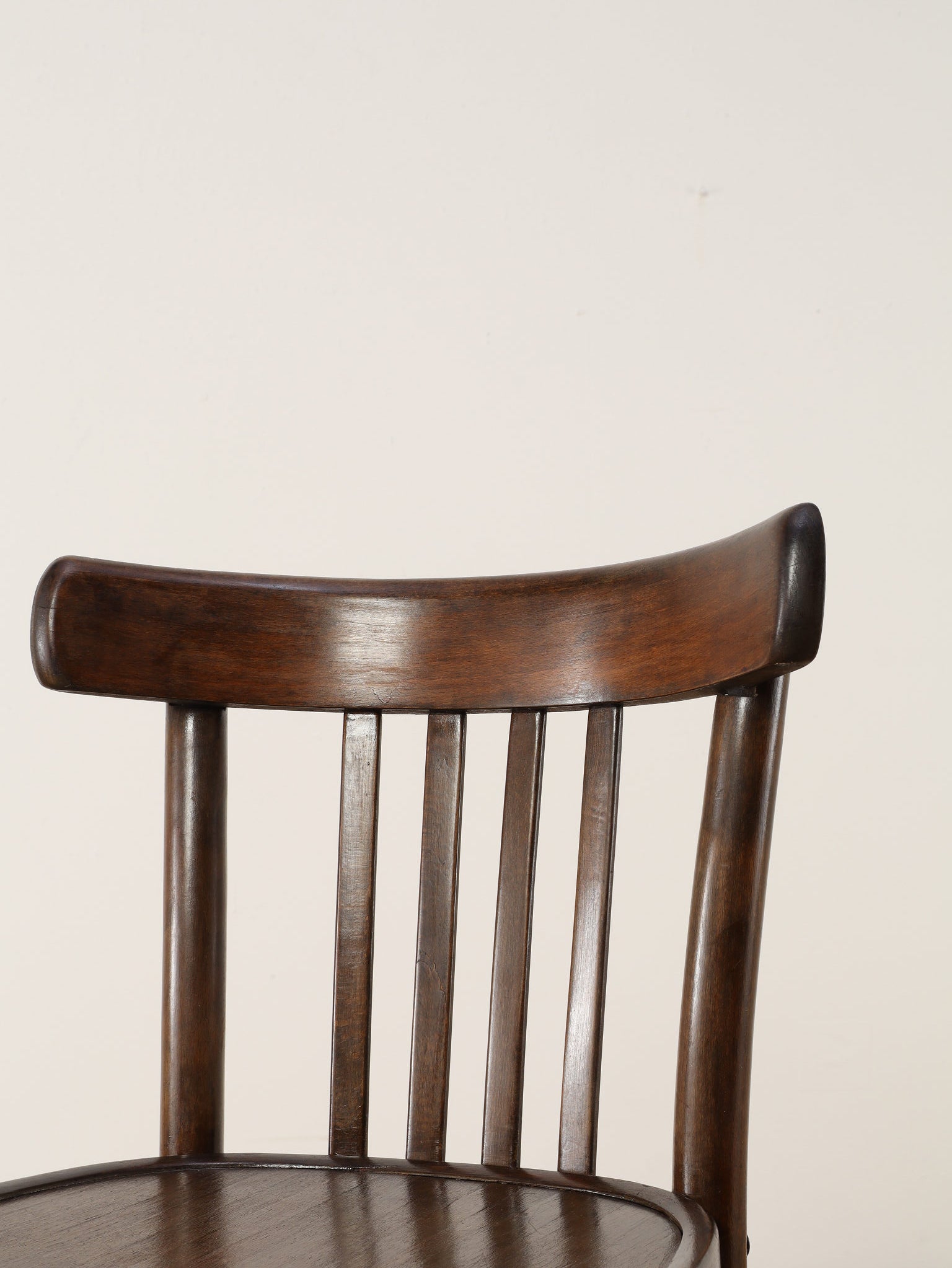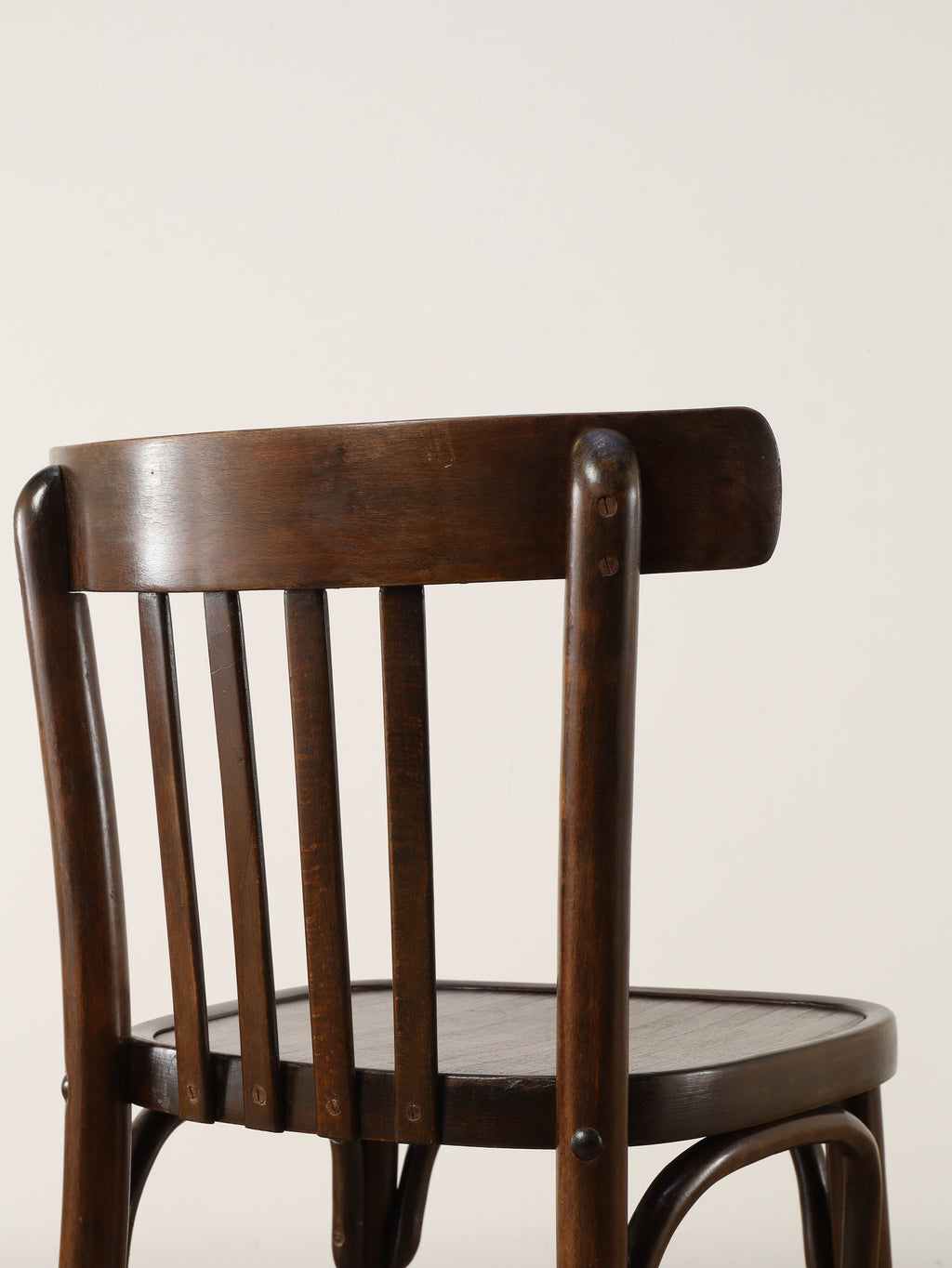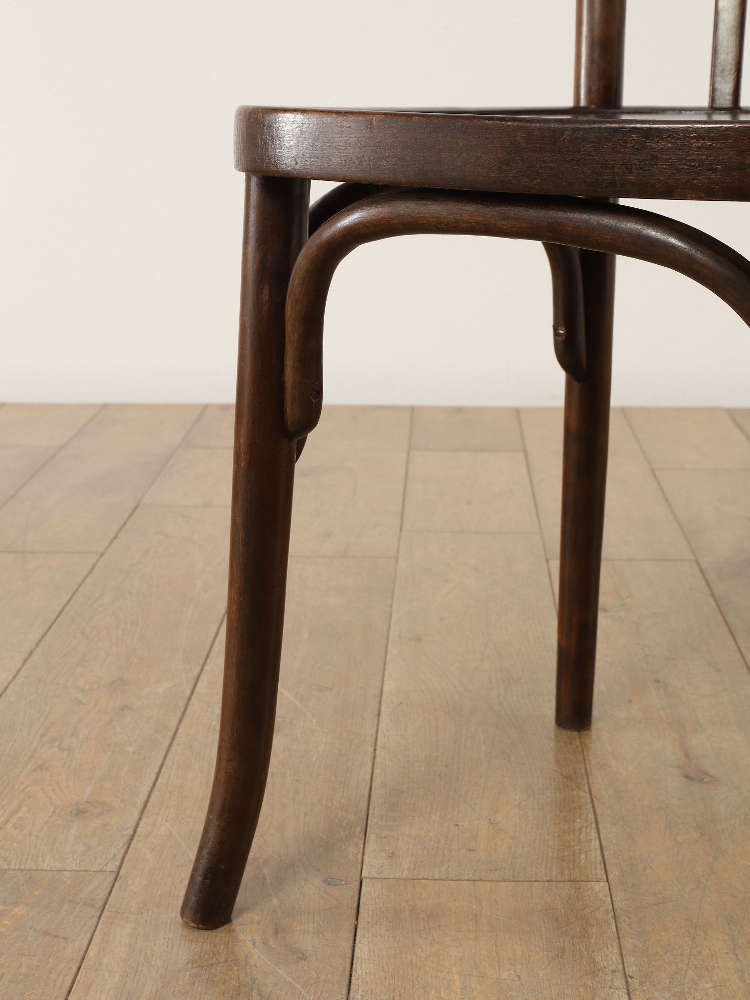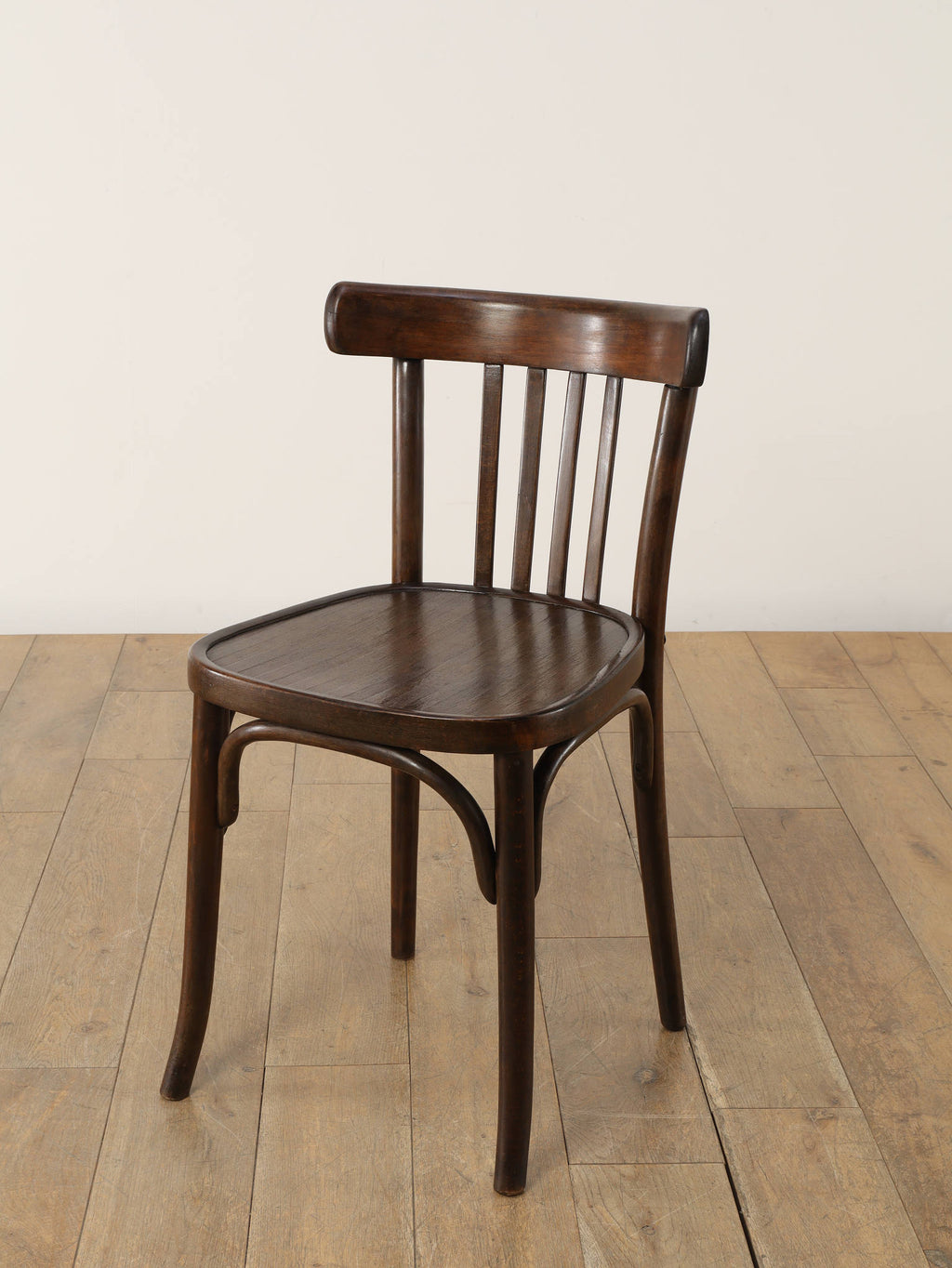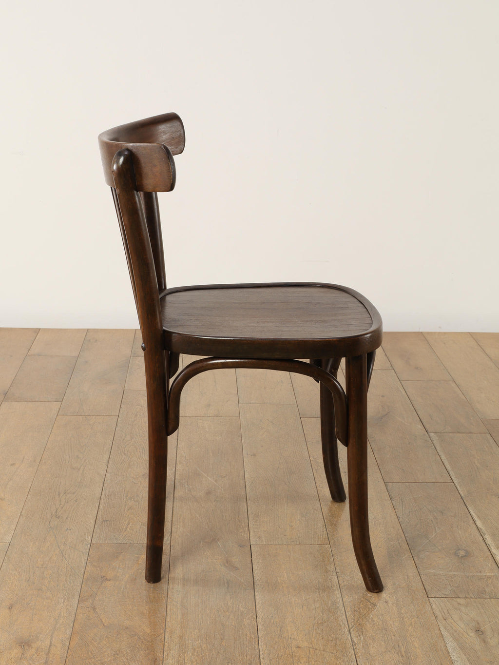 100年の時を重ねた希少なTHONET社のベントウッドチェア。1920年代、ユーゴスラビアで製作された伝統的な曲木家具です。座面にストライプ模様がプレスされ、湾曲した背もたれが低めに設計されています。曲木(ベントウッド)技法による滑らかな曲線美と、長年の使用による木の経年変化が織りなす深い色合いは、ヴィンテージ家具ならではの味わい深さを醸し出しています。カフェやダイニング、書斎など、どんな空間にも馴染むデザインは、現代のインテリアに温かみのあるアクセントを添えてくれることでしょう。