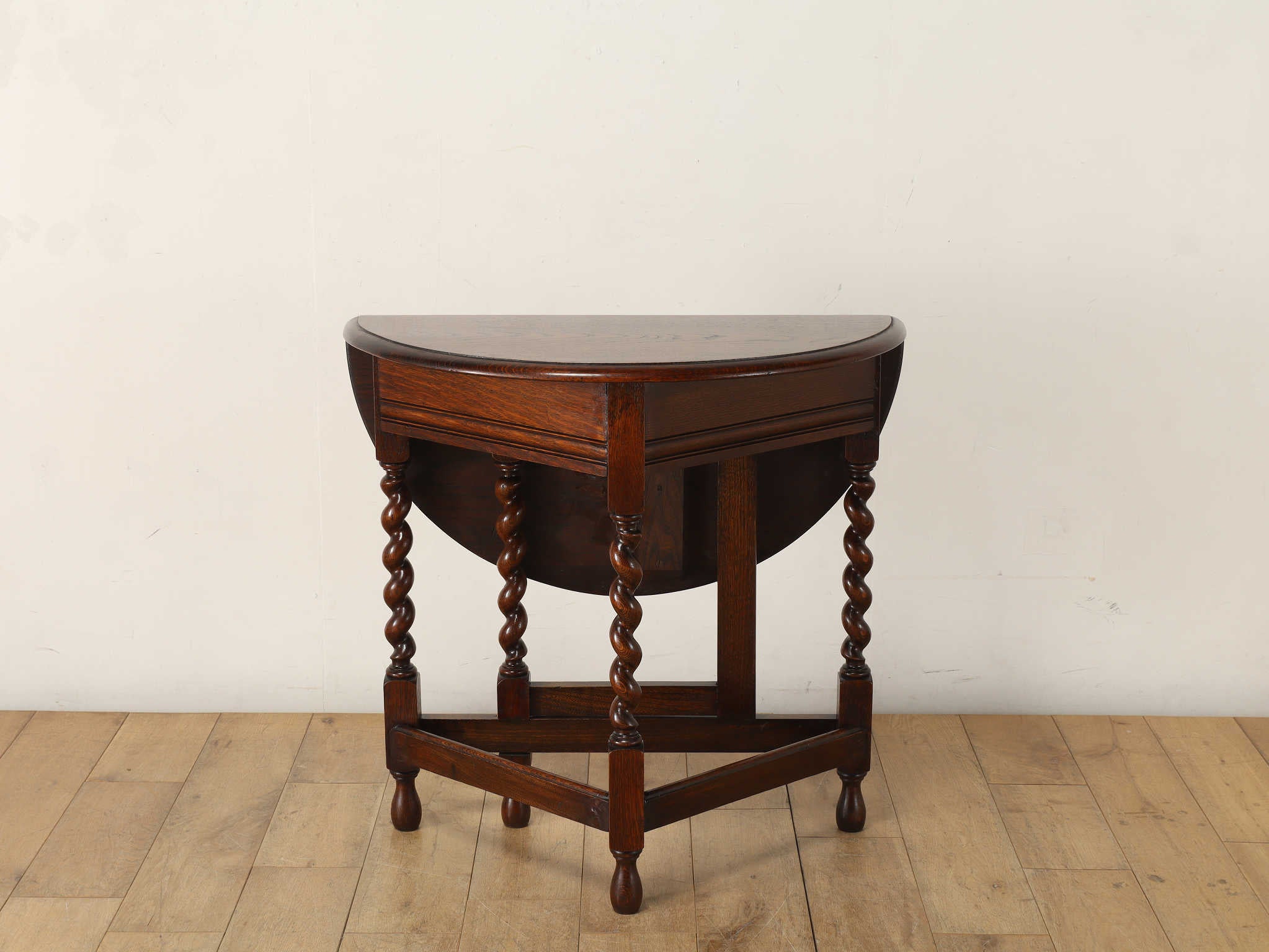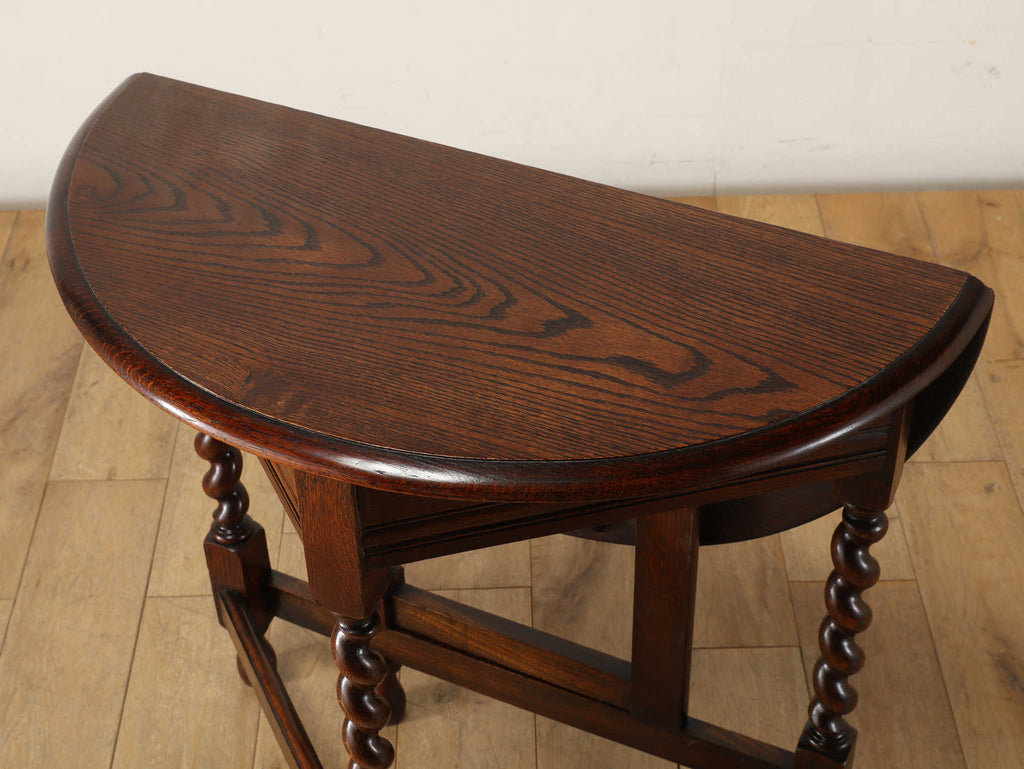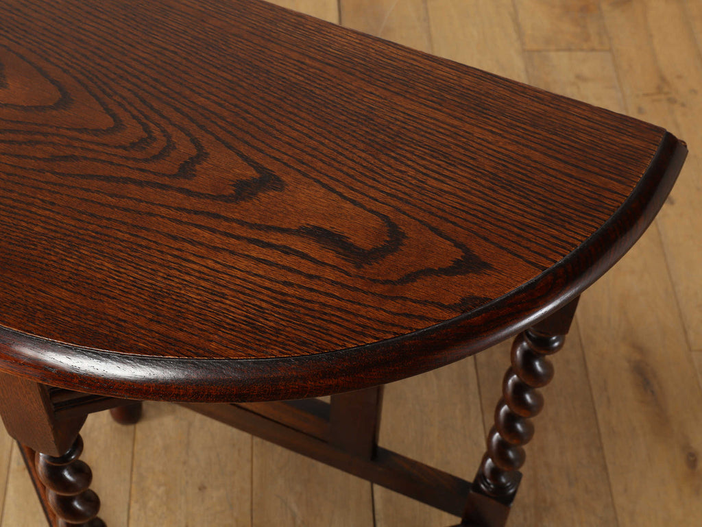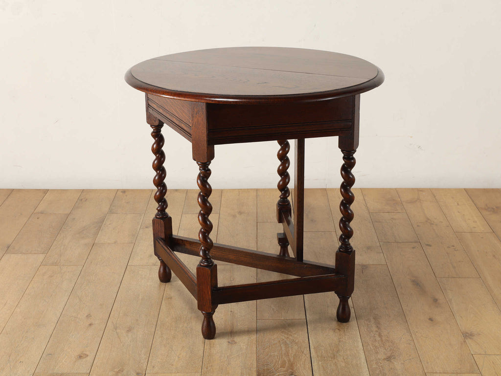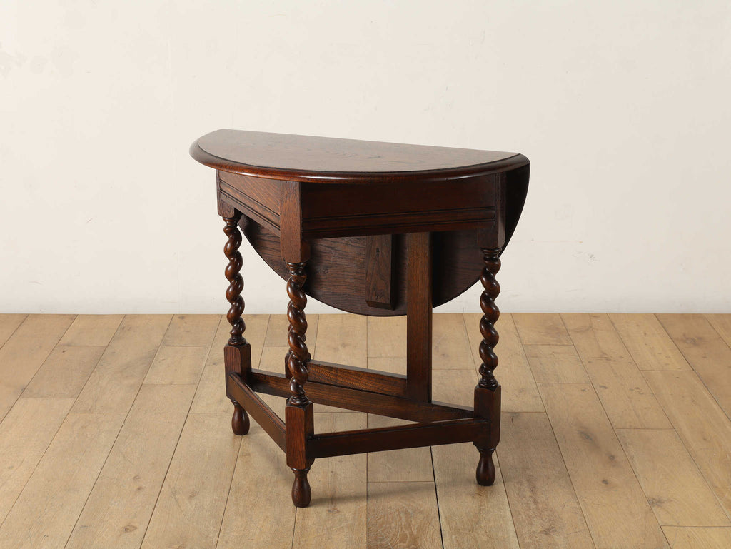 味わいのある質感が魅力的な、ラウンドドロップリーフテーブル。可動式の脚を内側に動かすと天板が半分に折りたためるタイプでございます。ラウンド型ではサイドテーブルとして、ハーフサイズではコンソールとして、幅広い用途でお使いいただけます。2通りの形とサイズで楽しめるラウンドドロップリーフテーブル。ぜひ、アンティークならではの構造と佇まいをご堪能ください。