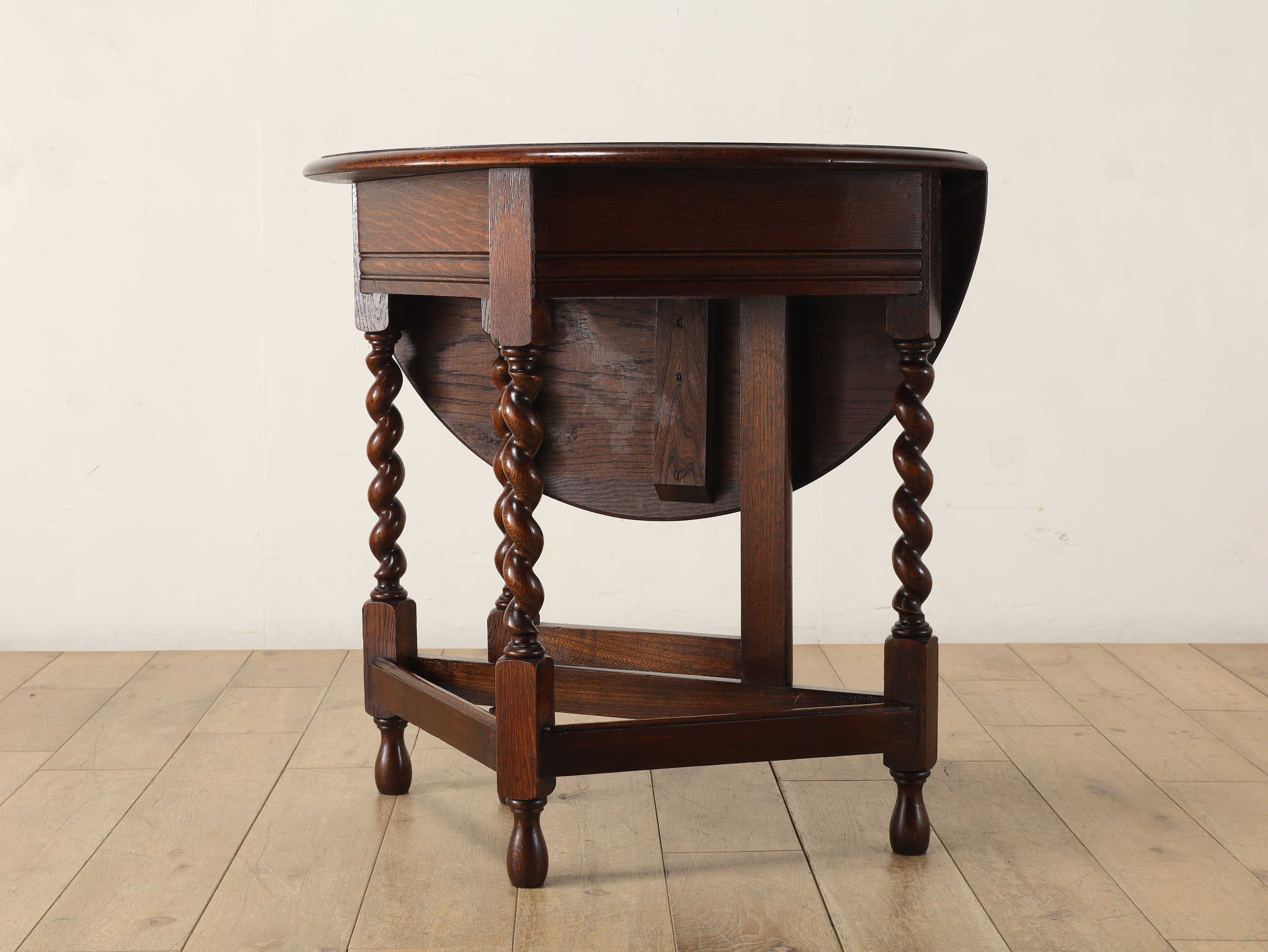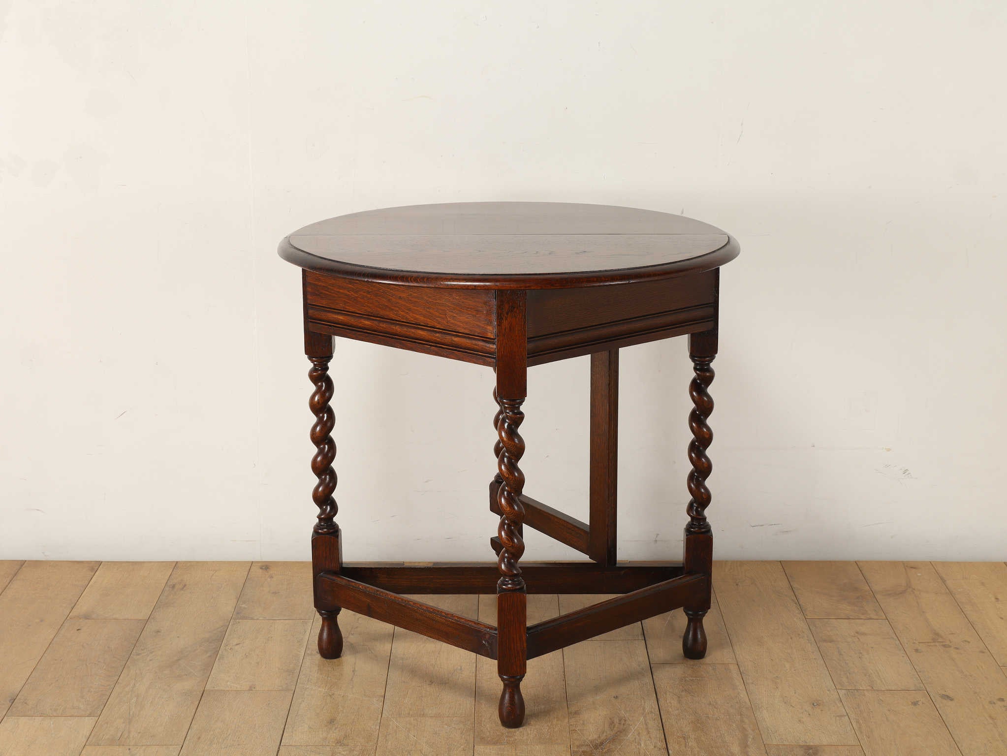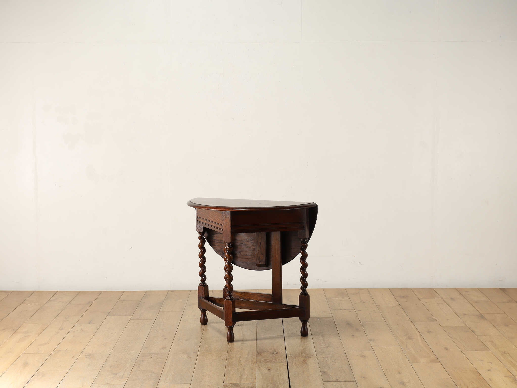 味わいのある質感が魅力的な、ラウンドドロップリーフテーブル。可動式の脚を内側に動かすと天板が半分に折りたためるタイプでございます。ラウンド型ではサイドテーブルとして、ハーフサイズではコンソールとして、幅広い用途でお使いいただけます。2通りの形とサイズで楽しめるラウンドドロップリーフテーブル。ぜひ、アンティークならではの構造と佇まいをご堪能ください。