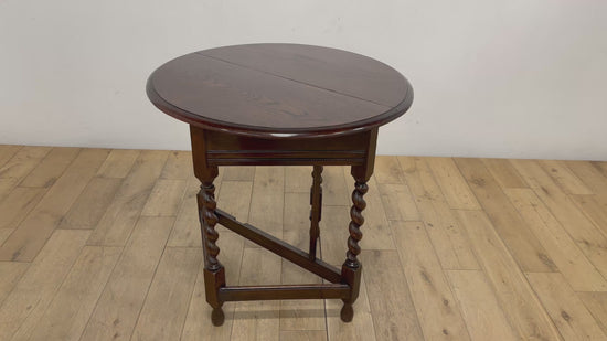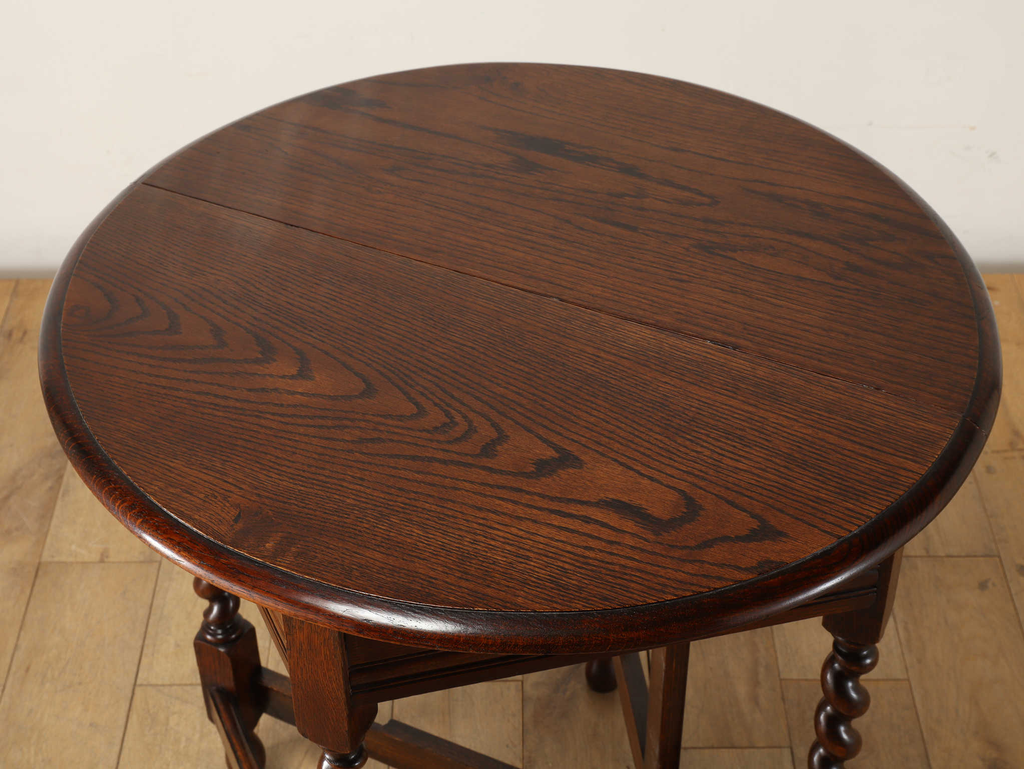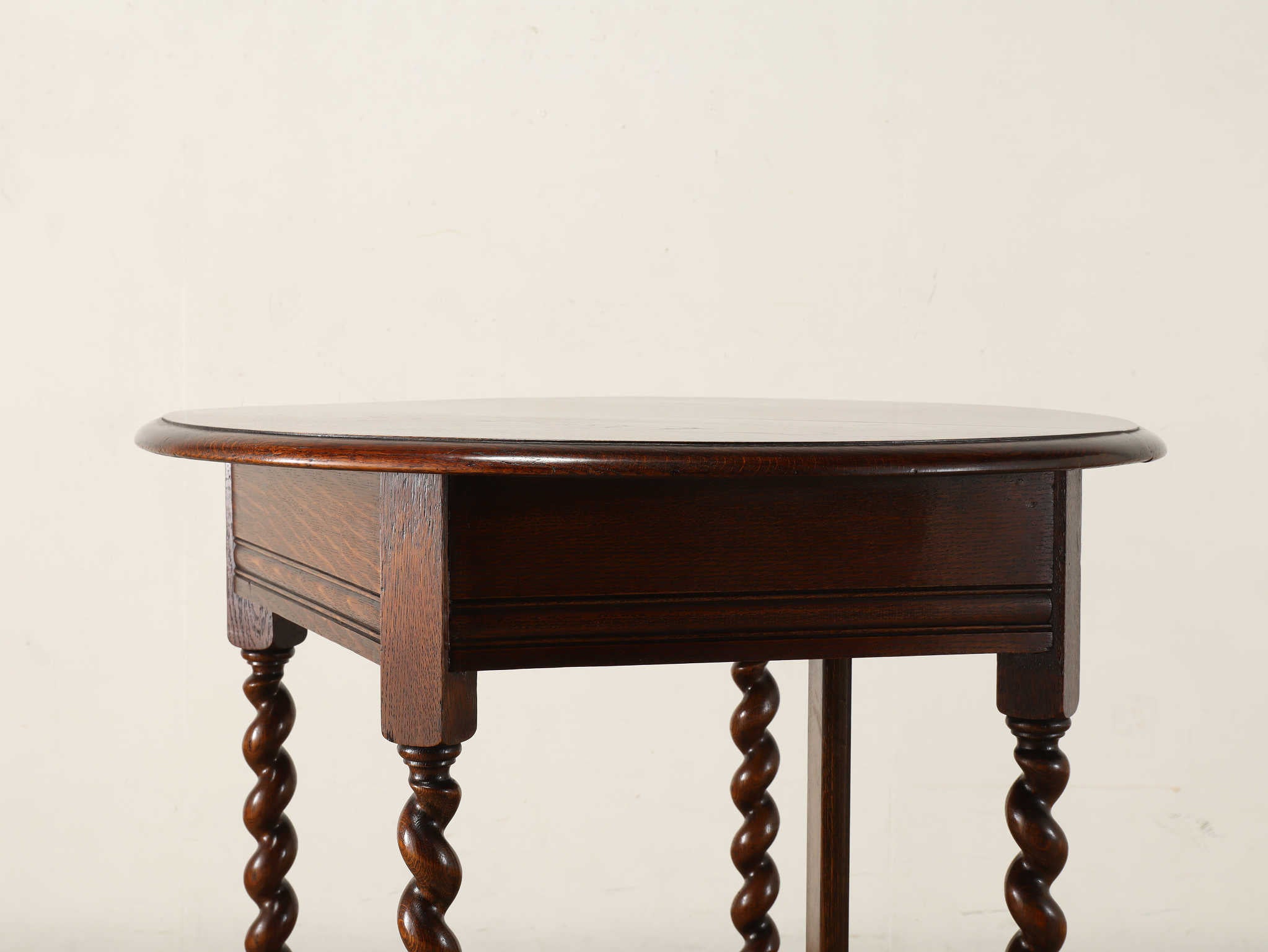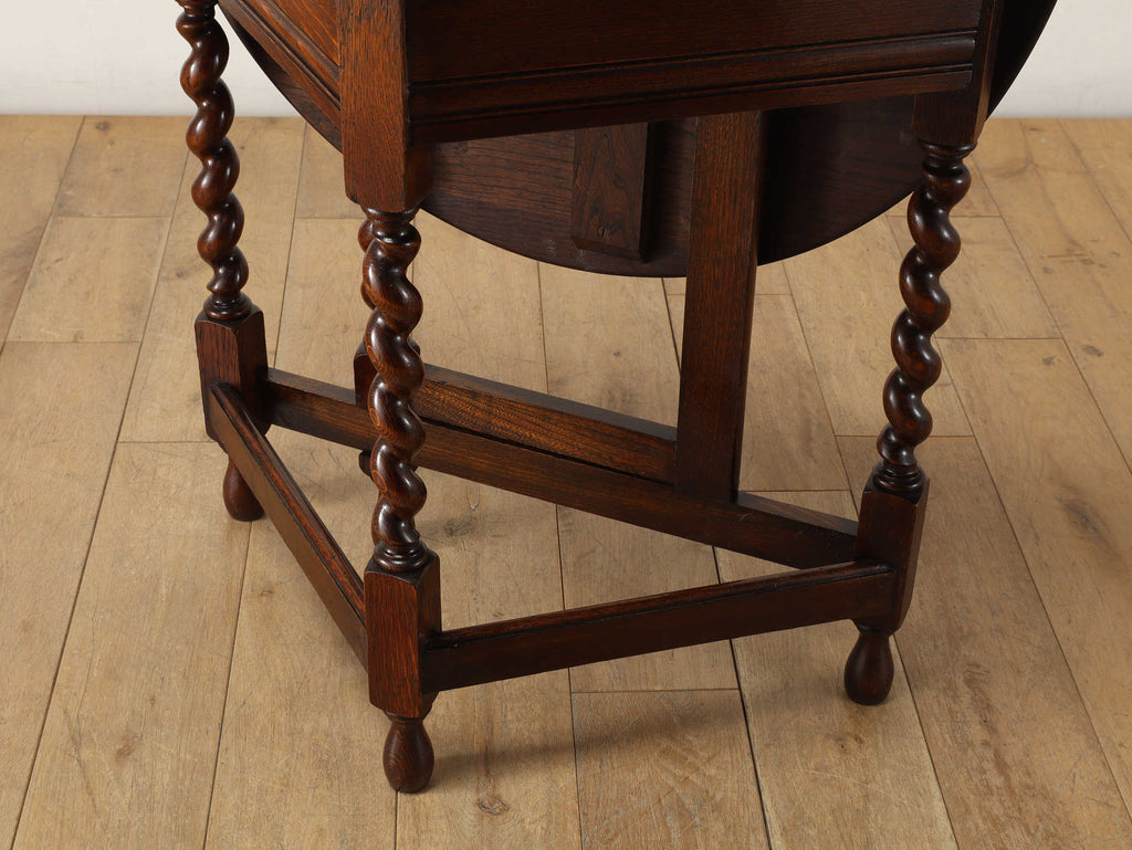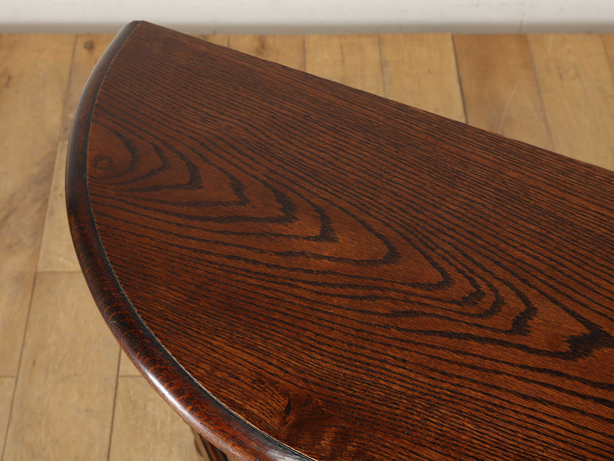 味わいのある質感が魅力的な、ラウンドドロップリーフテーブル。可動式の脚を内側に動かすと天板が半分に折りたためるタイプでございます。ラウンド型ではサイドテーブルとして、ハーフサイズではコンソールとして、幅広い用途でお使いいただけます。2通りの形とサイズで楽しめるラウンドドロップリーフテーブル。ぜひ、アンティークならではの構造と佇まいをご堪能ください。