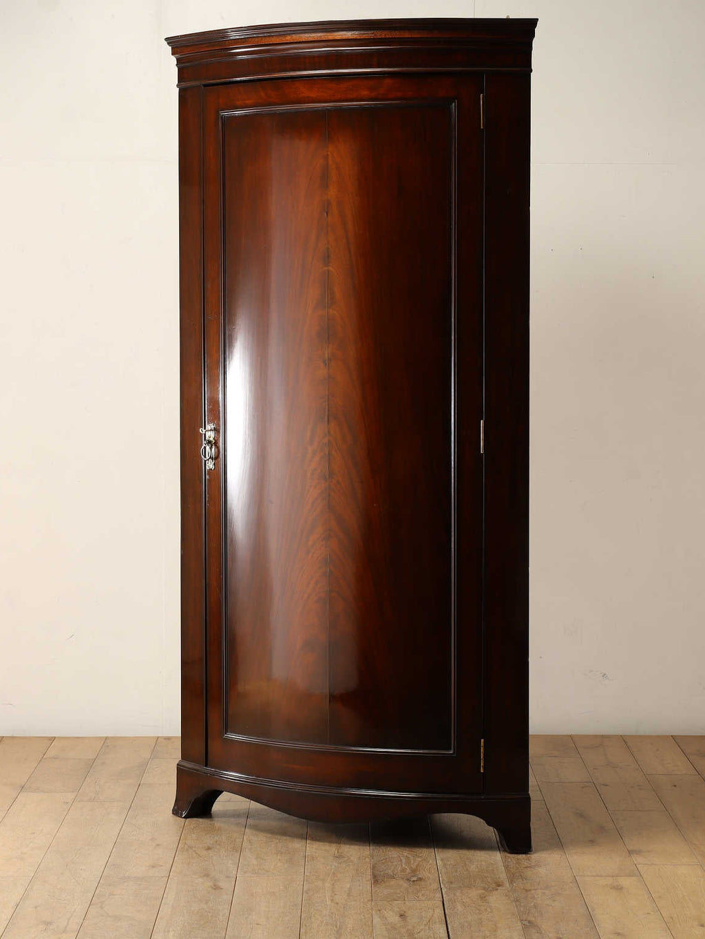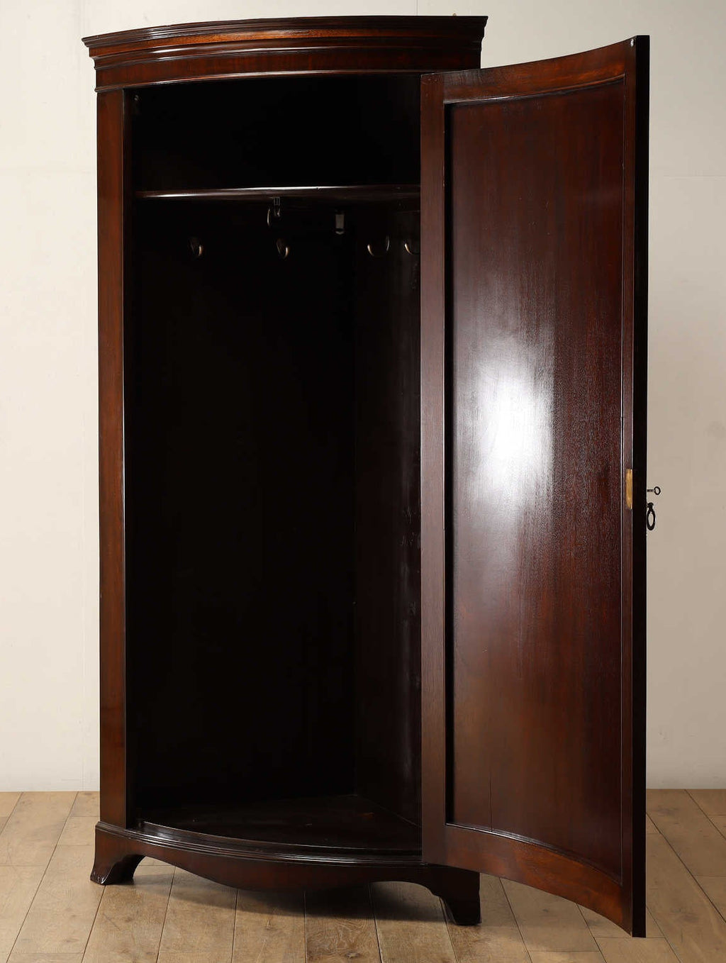 部屋の隅にぴったりと納まるワードローブです。空間を有効活用してくれるコーナー家具は、場所も取らずに機能的で、暗くなりがちな部屋の角を楽しく演出してくれます。マホガニーの艶やかな扉を開けると中には衣類をかけられる取手が現れます。お気に入りのアイテムをかけるもよし、日常づかいの洋服をかけるもよし、毎日の身支度も楽しくなりそうですね。