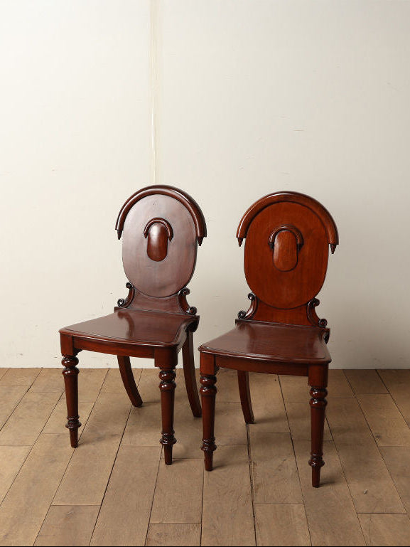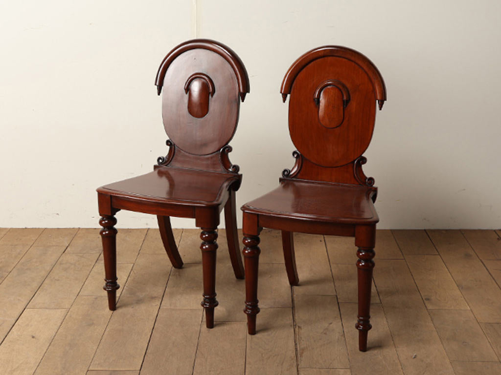 ホールチェアとは、お客様をお迎えする場所に置き、豪華な空間演出をするため、カービングやインレイが施された芸術性に優れたチェアのことです。玄関ホールなどに1脚もしくはテーブルを間に置きシンメトリーに2脚並べたりします。美しいアンティークのチェアは、豪華な空間を演出するためにも欠かせない家具の一つといえます。座るという機能を持ったチェアはくつろぎや安らぎを連想させます。また、座面がフラットに作られているので、現代では花台等にお使い頂くのもお勧めです。