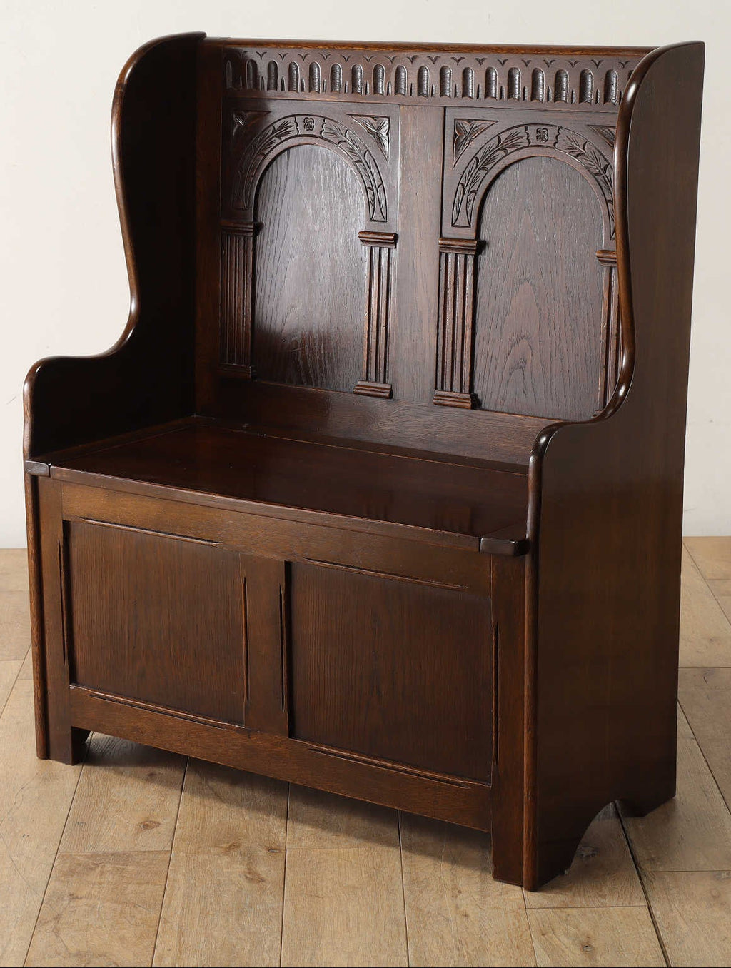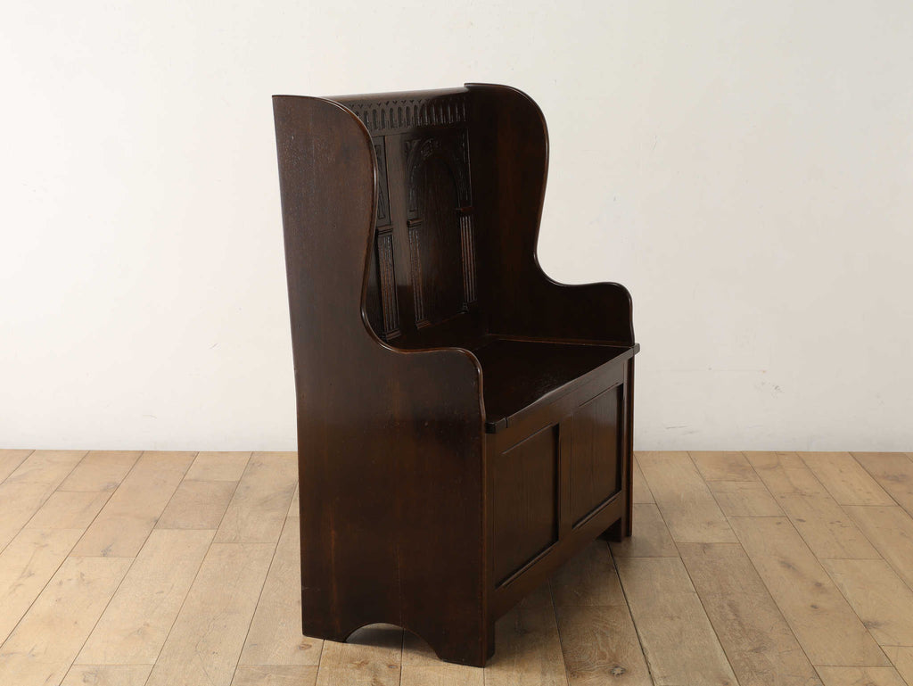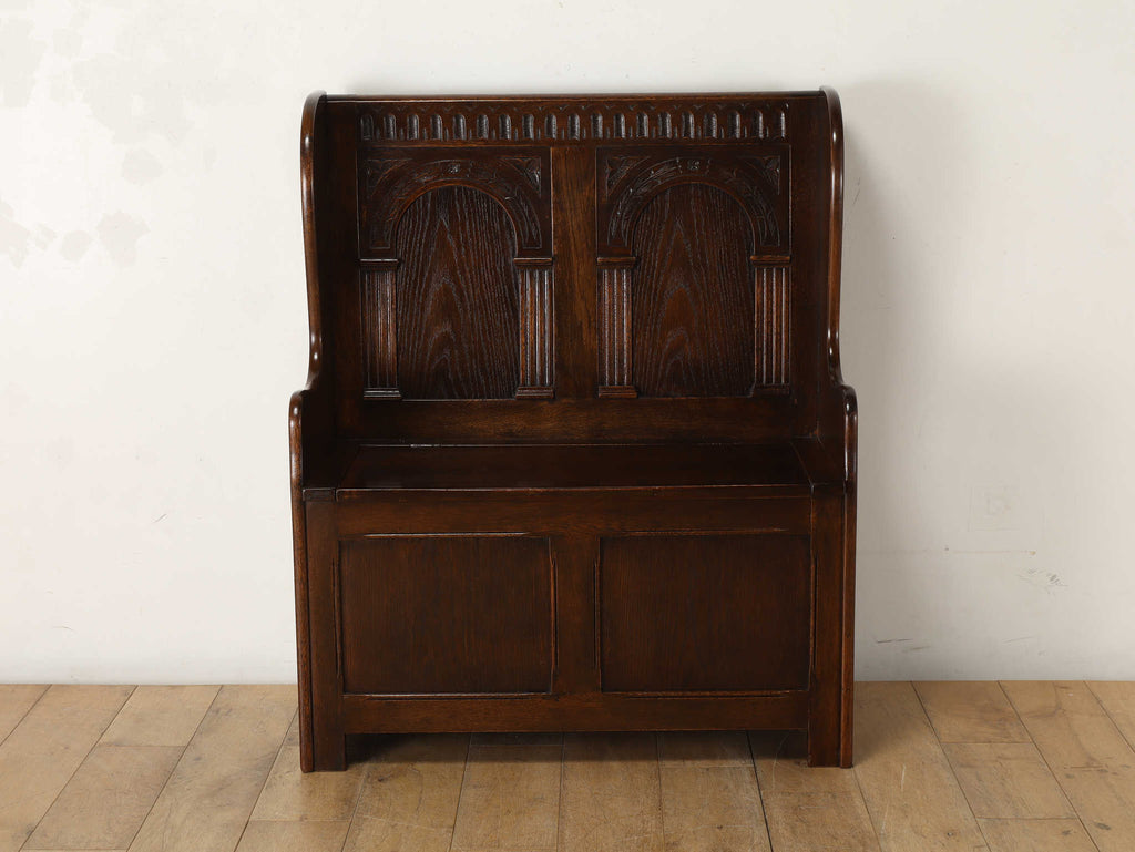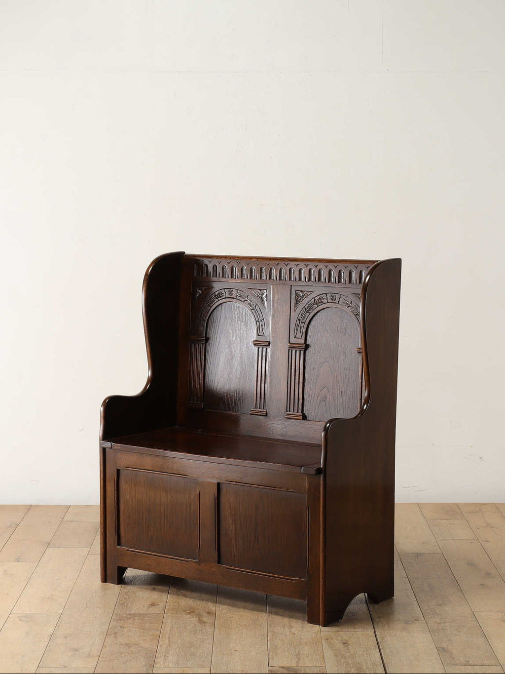 もともと玄関ホールや廊下などに設置する家具としてつくられたチャーチベンチ。シート部分の天板を開くと、中が収納スペースとなっていて、玄関をすっきりと見せてくれる、機能的な家具でもあります。エントランスは最初にお客様をお迎えする大切な場所として、装飾的な家具が置かれることが多かったといいます。こちらのホールシートは、背面に半円のアーチ型が連なったデザインが浅浮き彫りで施された、クラシックな雰囲気のアイテムとなっています。