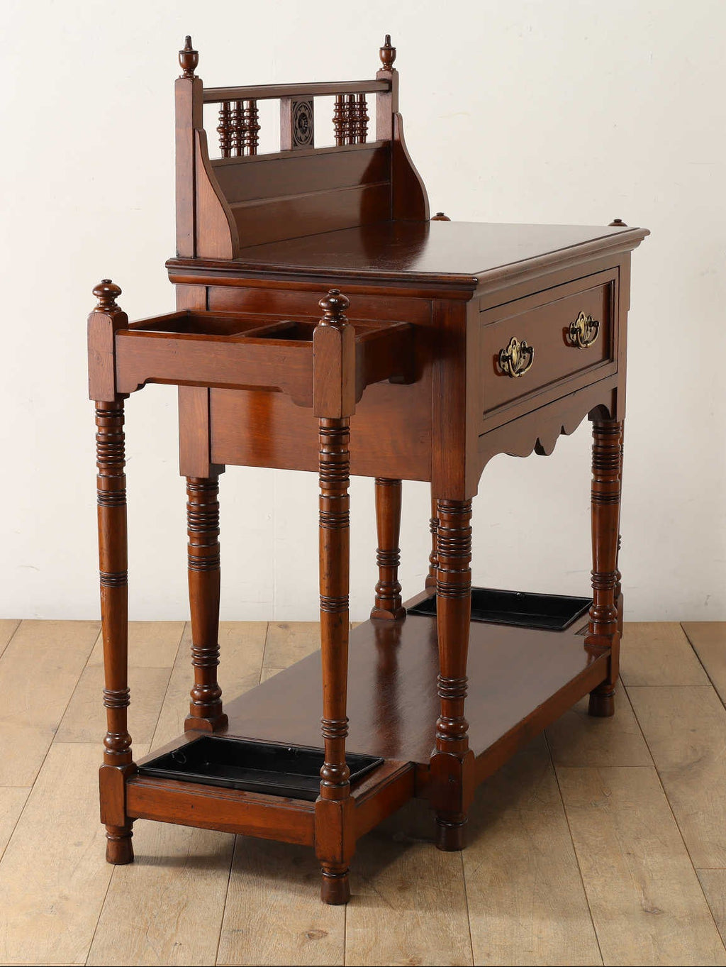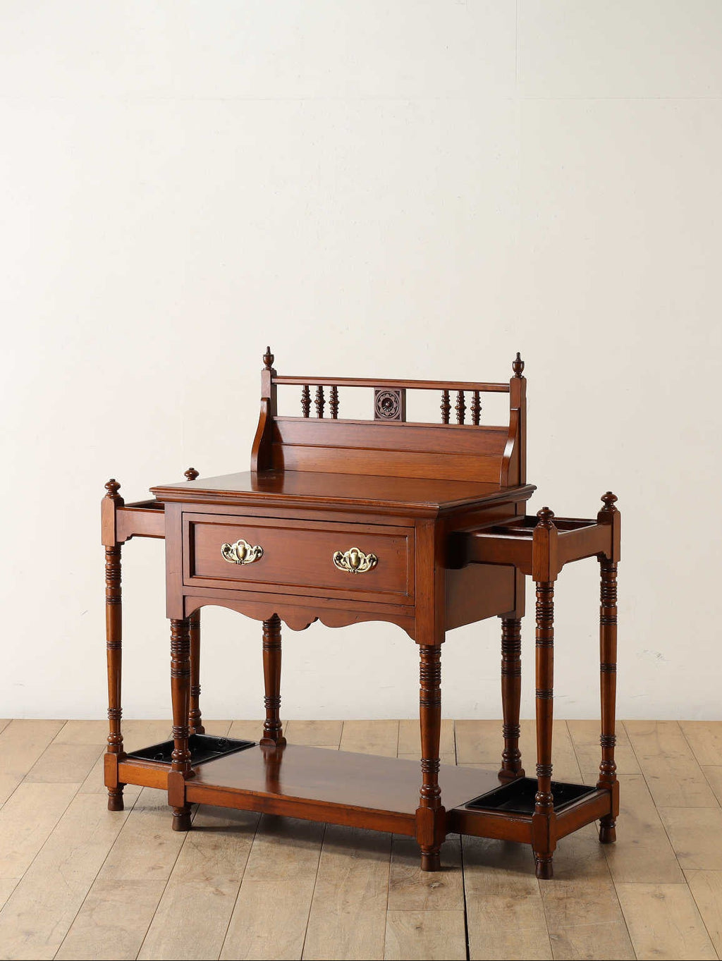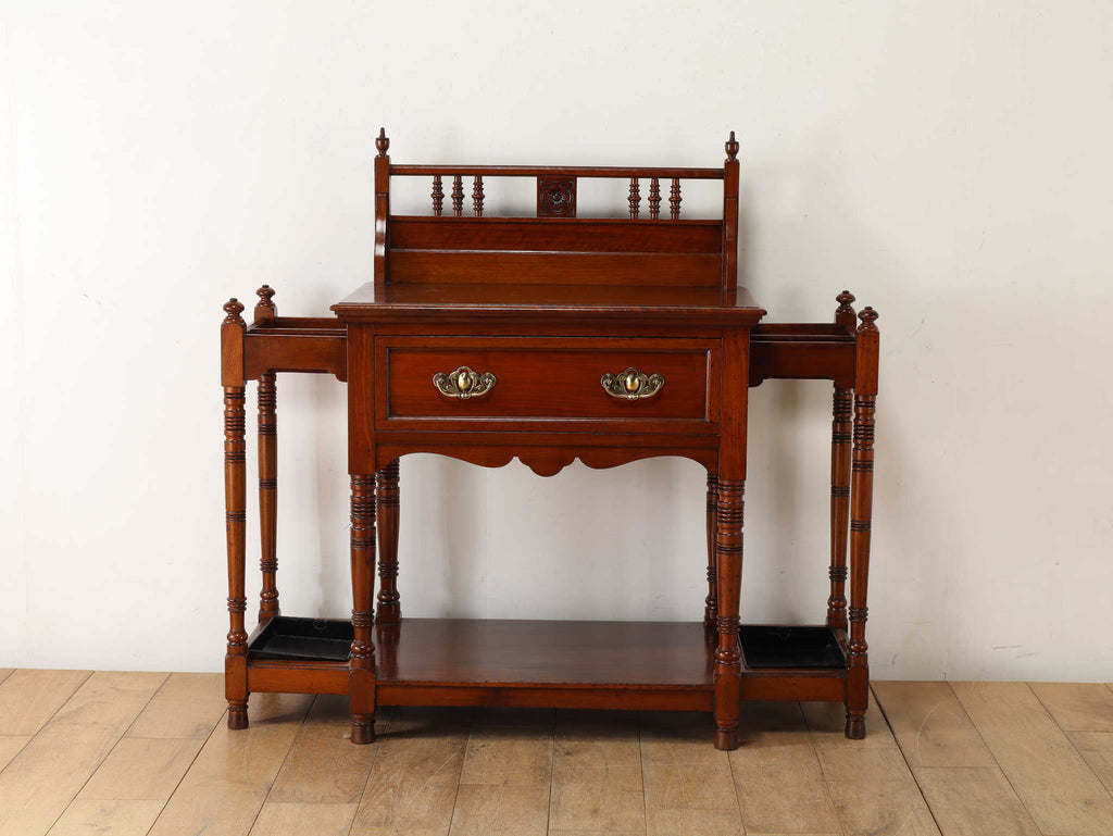 美しいマホガニーの光沢と、全体に施された丁寧な装飾が目を引くスティックスタンド。マホガニーの深みのある赤茶色が年月を経たことによる風格を感じさせます。スカラップ状の曲線を用いたカットや、スピンドルの装飾が取り入れられており、芸術的な価値をその細部に感じられます。正面には2つの抽斗があり、ブラスの把手が良いアクセントになっています。抽斗のほか、両サイドには傘や杖を収納するためのスペースがあり、実用性と美しさを兼ね備えている点も魅力の1つです。歴史と職人技を感じさせる逸品をぜひお手元でお楽しみ下さい。