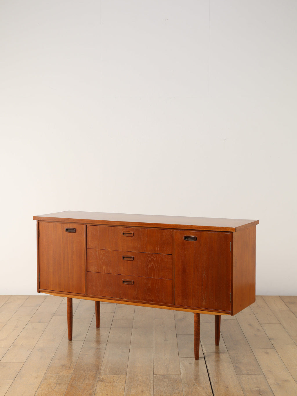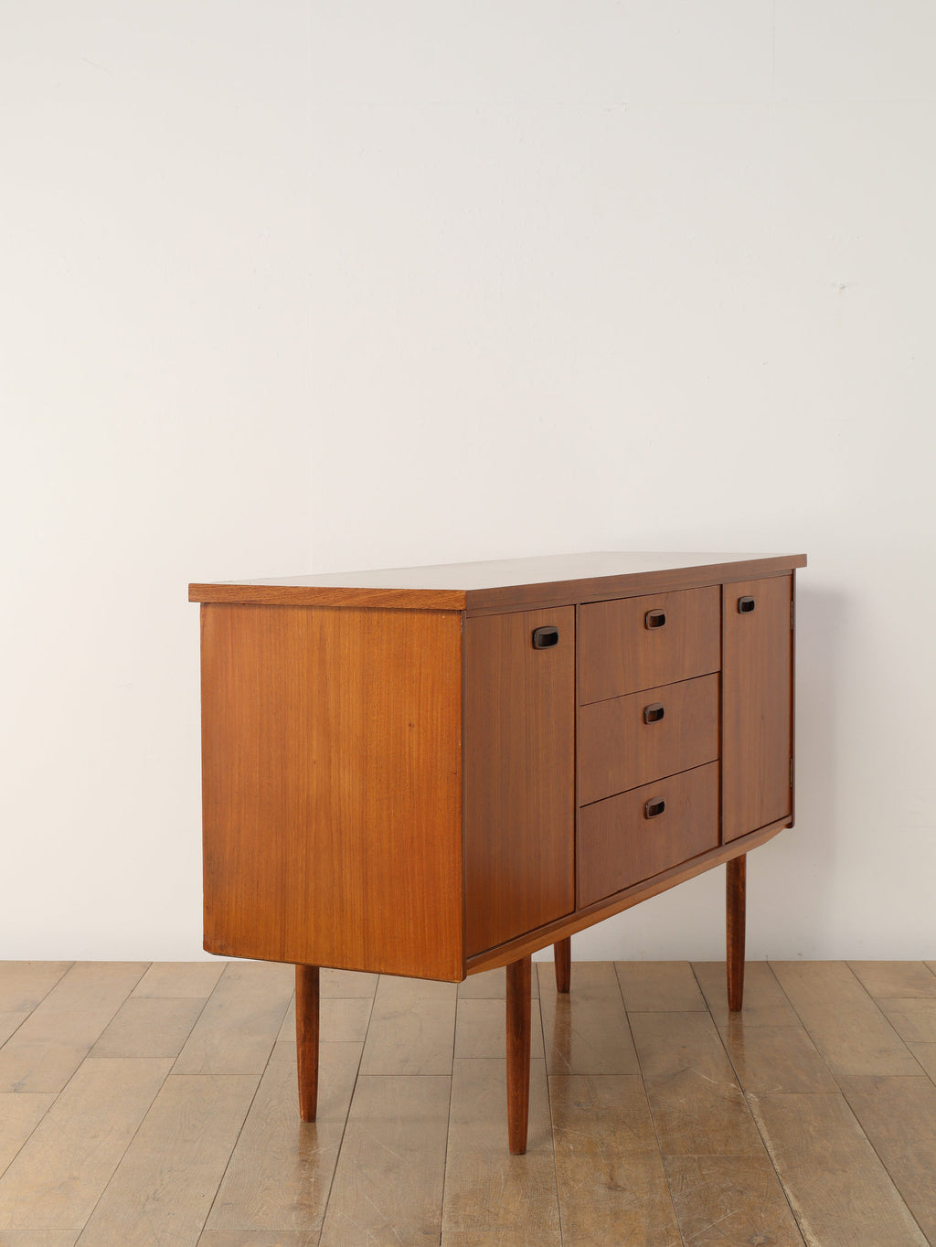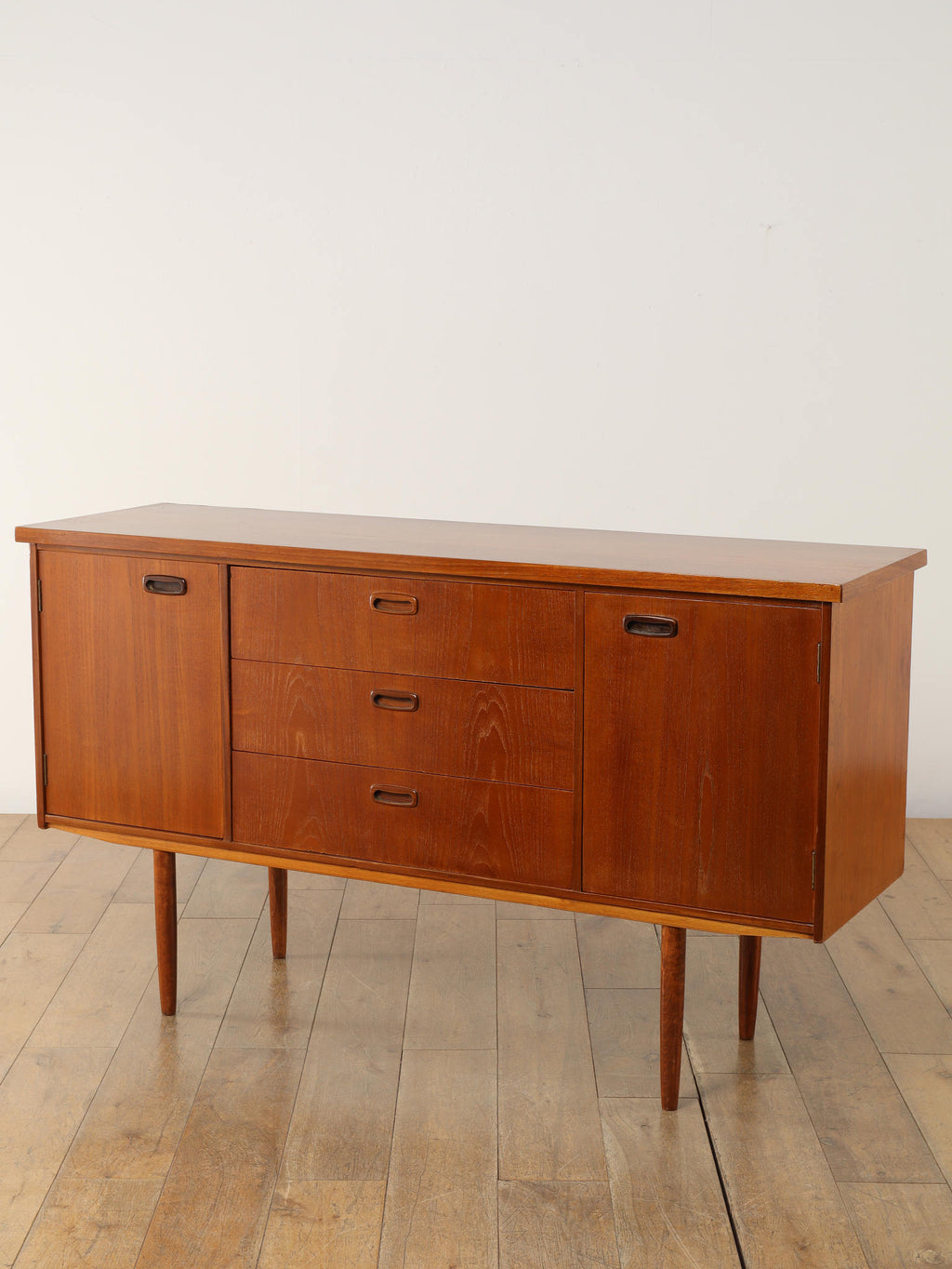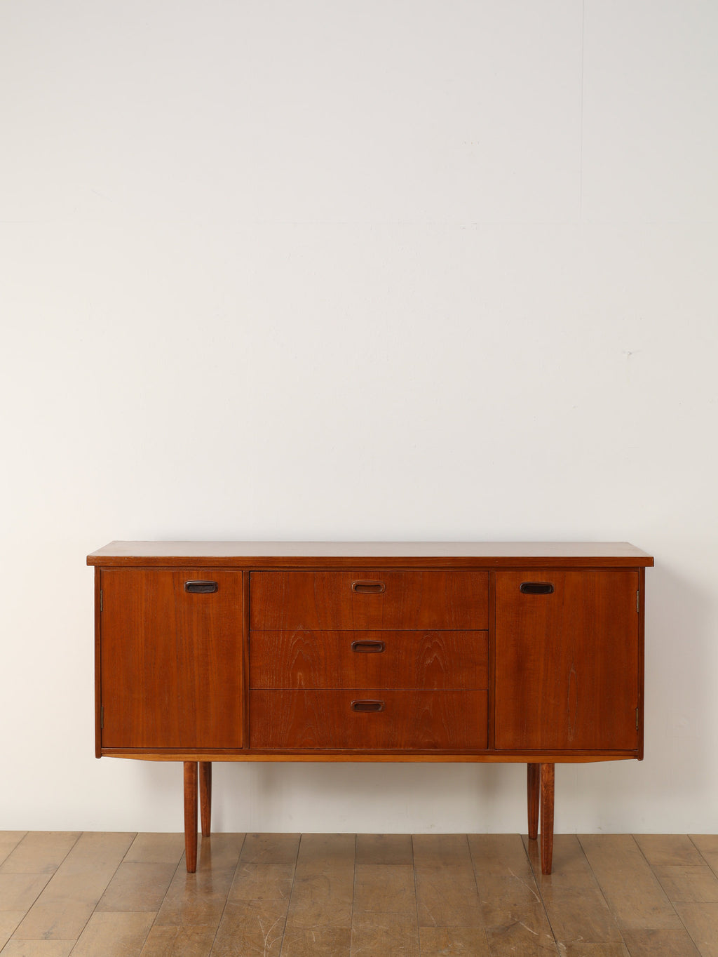 チーク材のきめ細やかな杢目も美しいサイドボード。無駄な装飾を一切削ぎ落としたスマートな佇まいが魅力です。幅1400mmと比較的コンパクトなサイズ感ながら、3段の抽斗のほか左右には戸棚があることから、収納として十分にご活用いただけます。絵画やミラー、グリーンなどと合わせてディスプレイを楽しんでみてはいかがでしょうか。