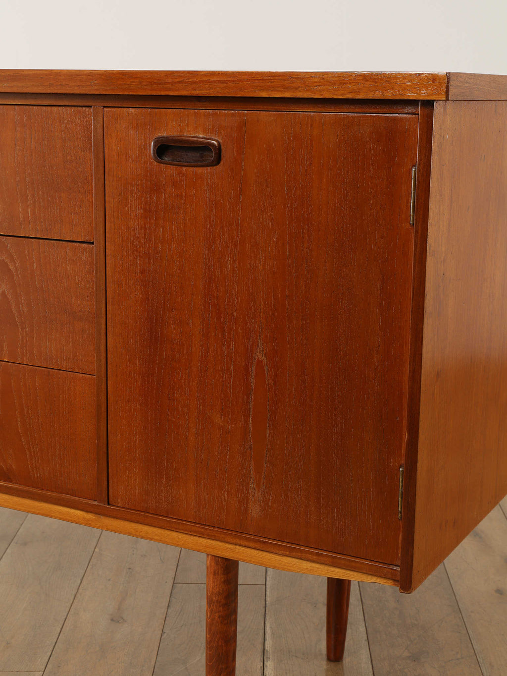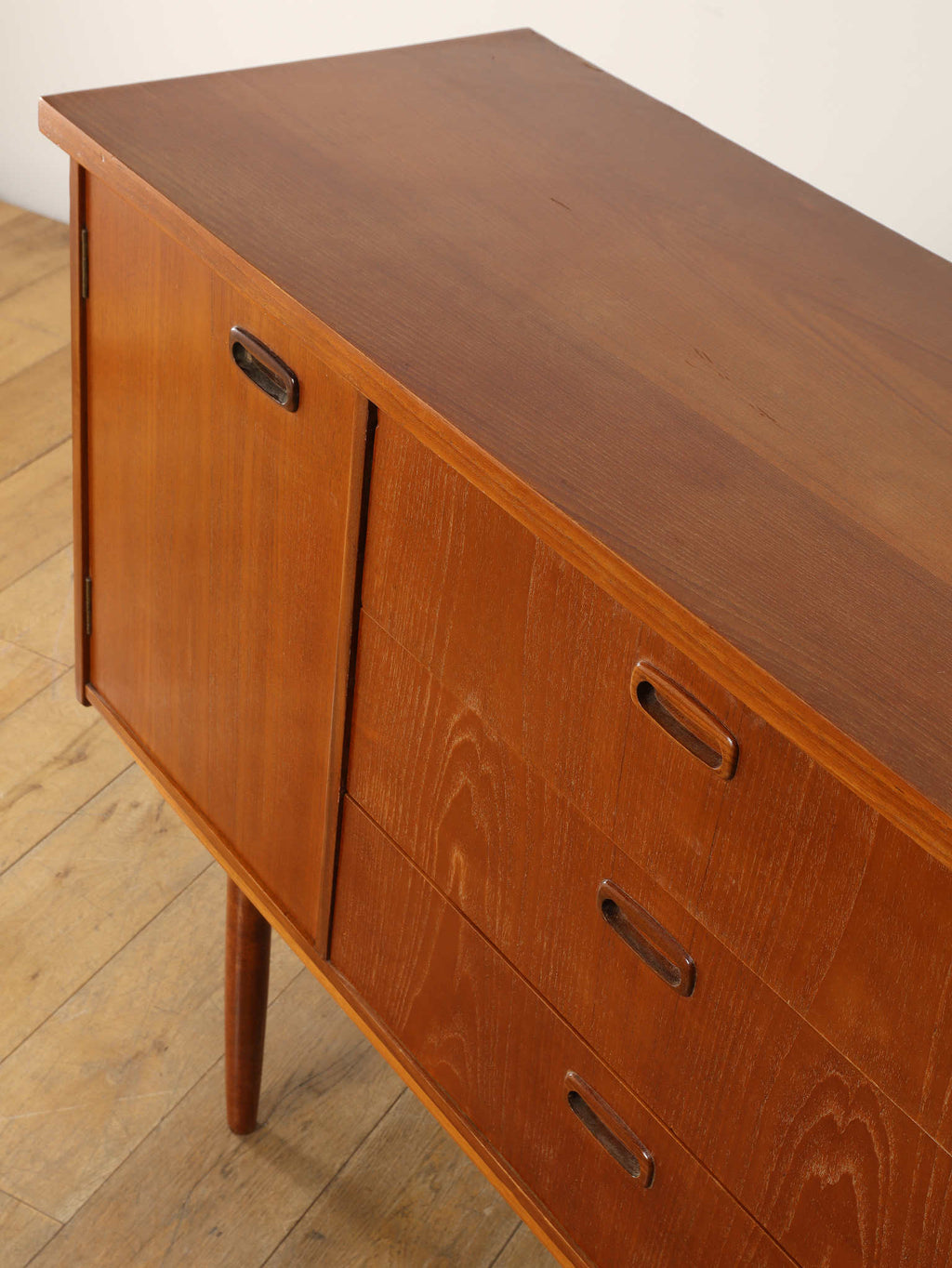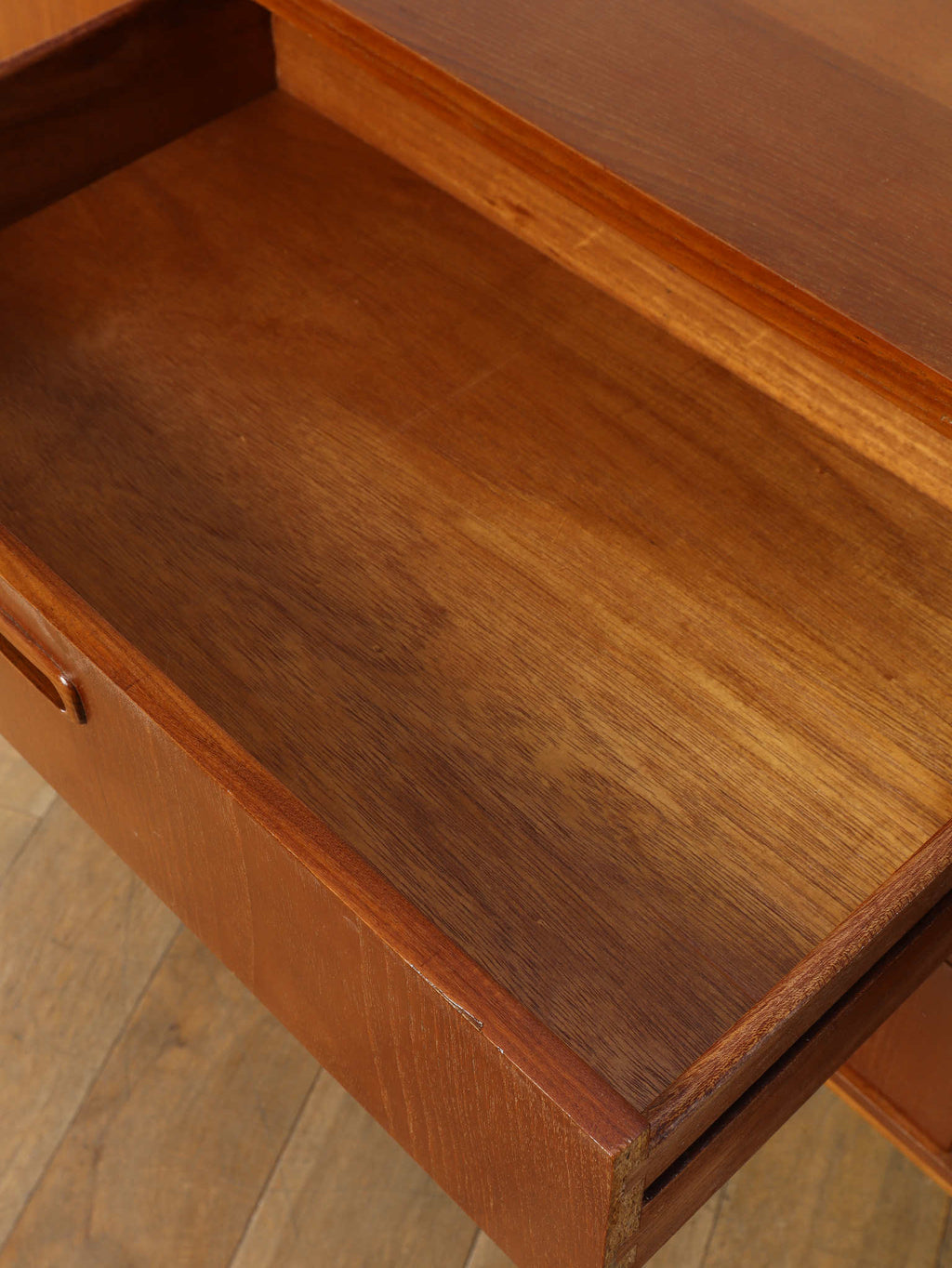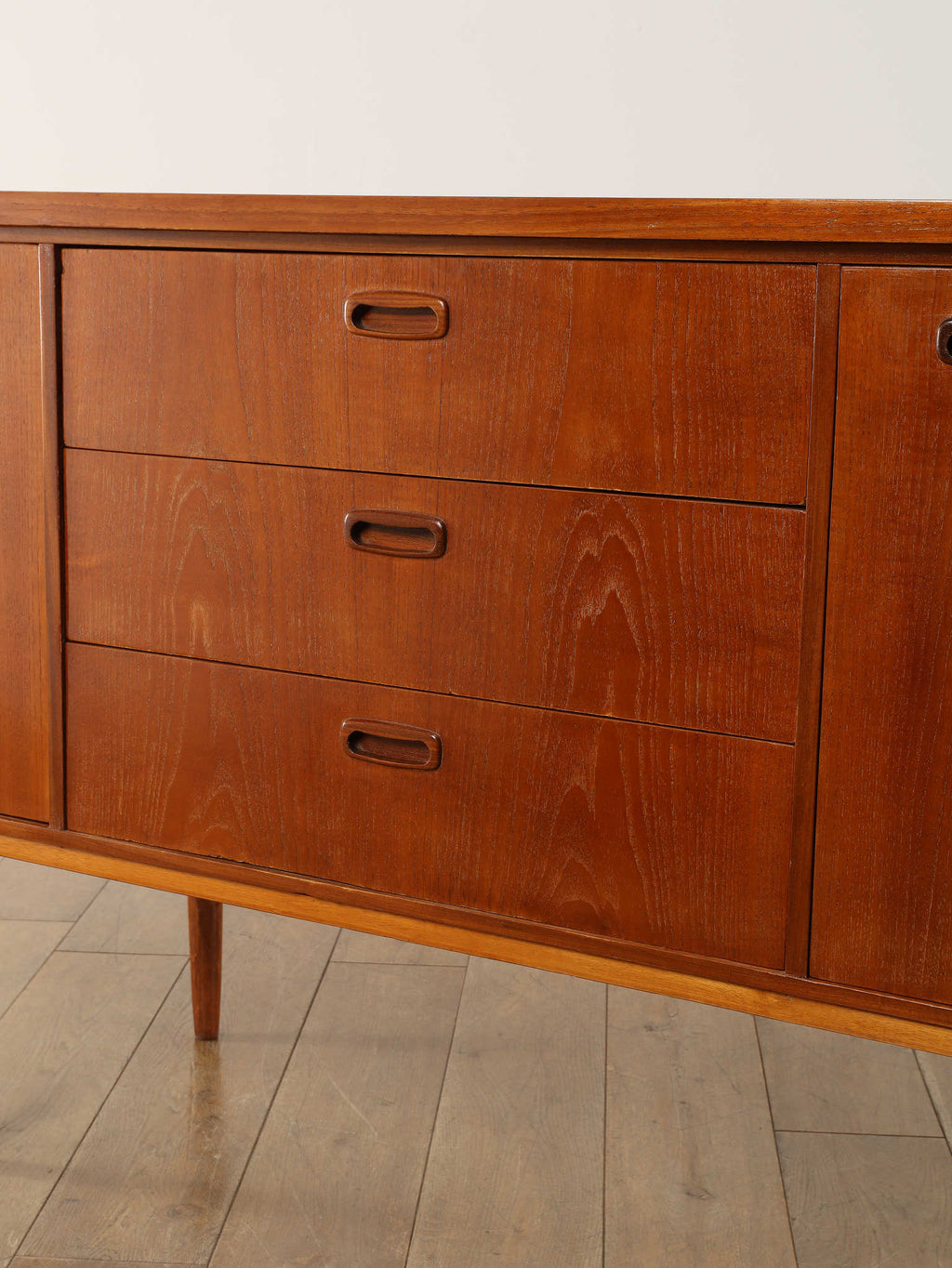 チーク材のきめ細やかな杢目も美しいサイドボード。無駄な装飾を一切削ぎ落としたスマートな佇まいが魅力です。幅1400mmと比較的コンパクトなサイズ感ながら、3段の抽斗のほか左右には戸棚があることから、収納として十分にご活用いただけます。絵画やミラー、グリーンなどと合わせてディスプレイを楽しんでみてはいかがでしょうか。