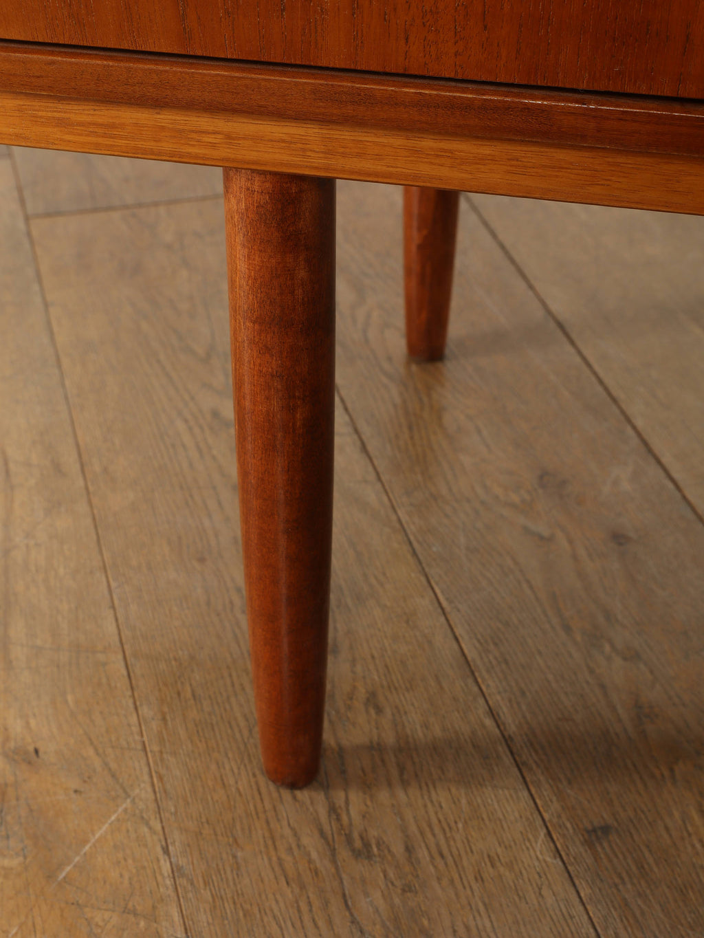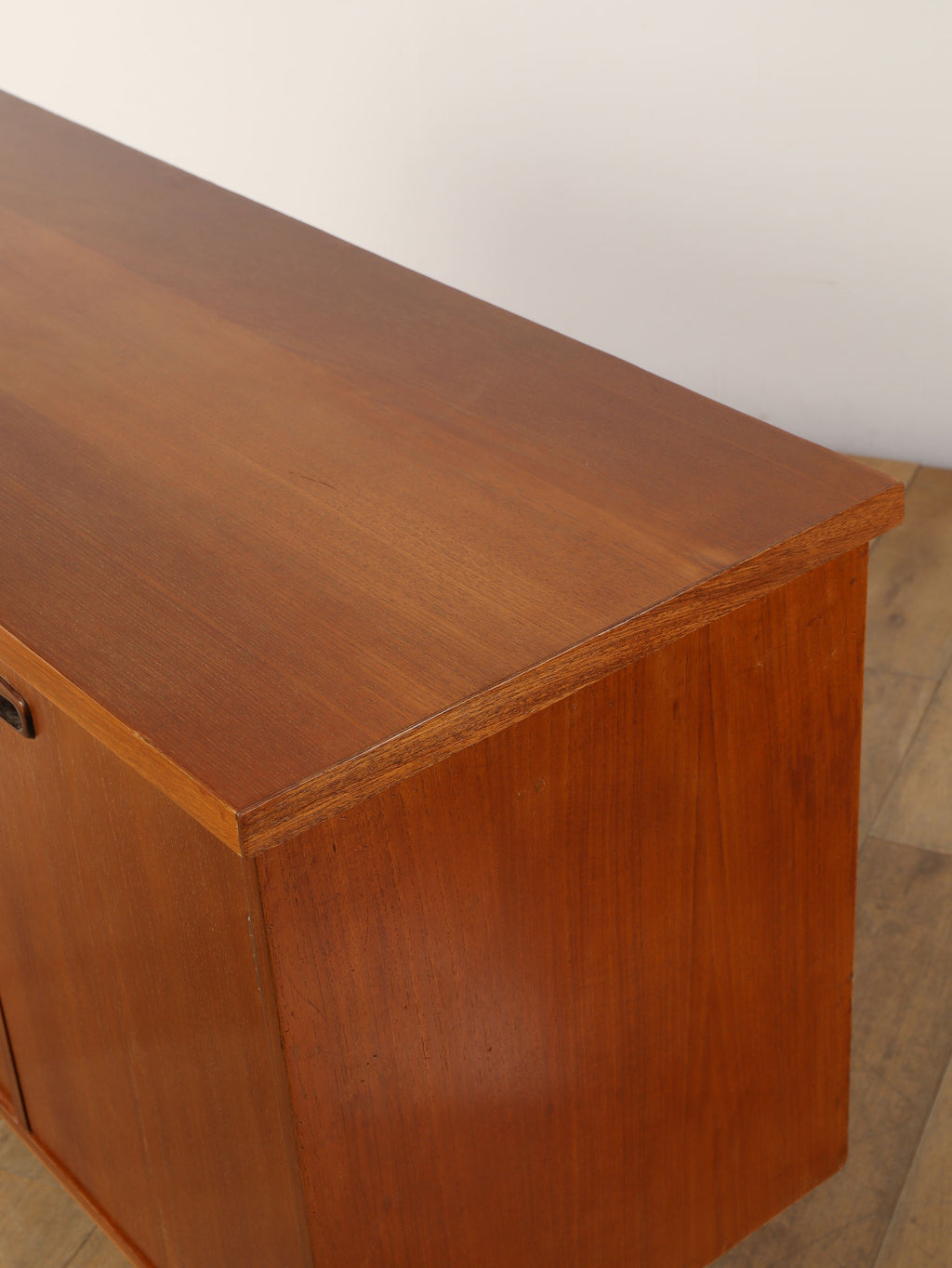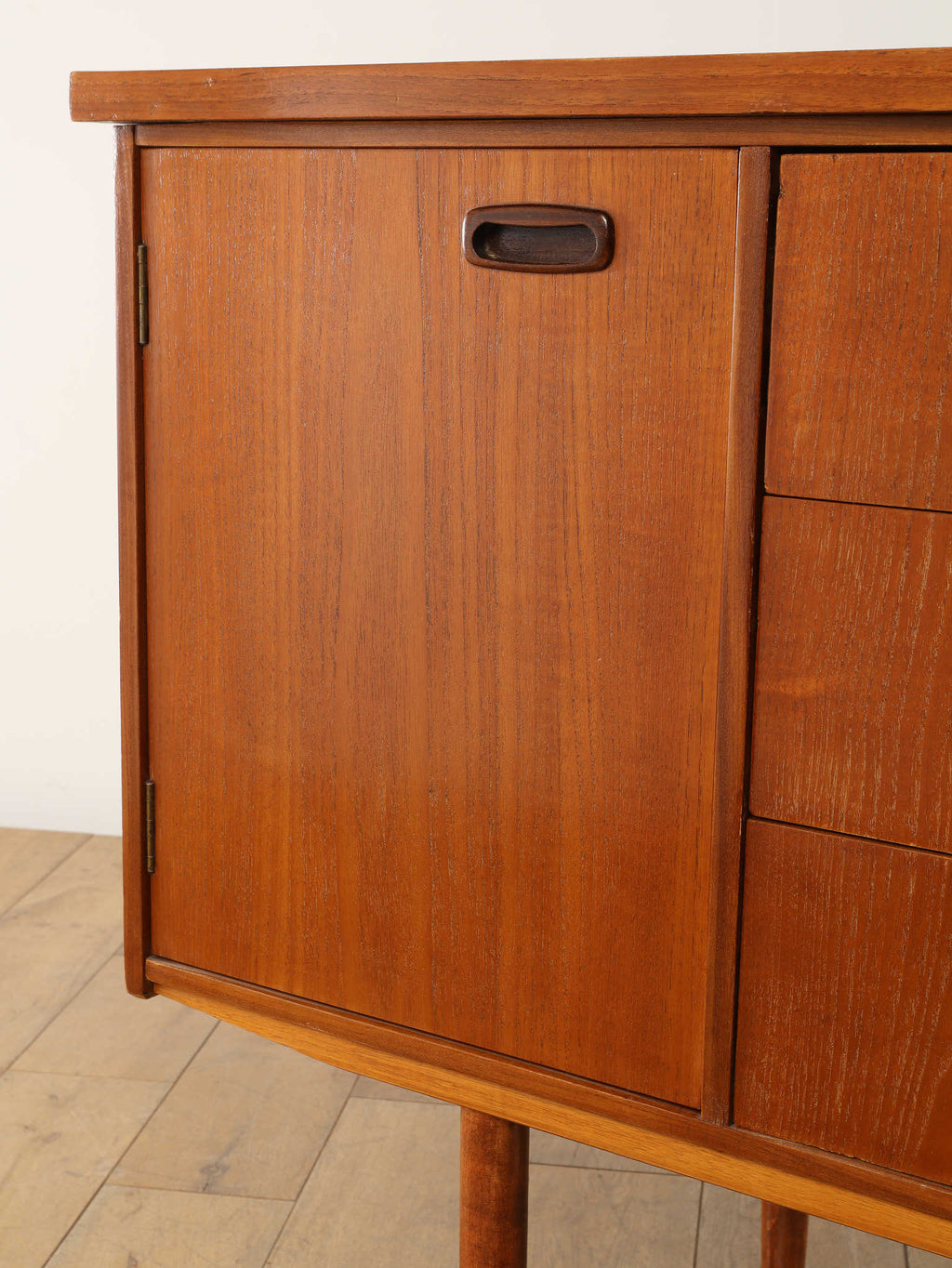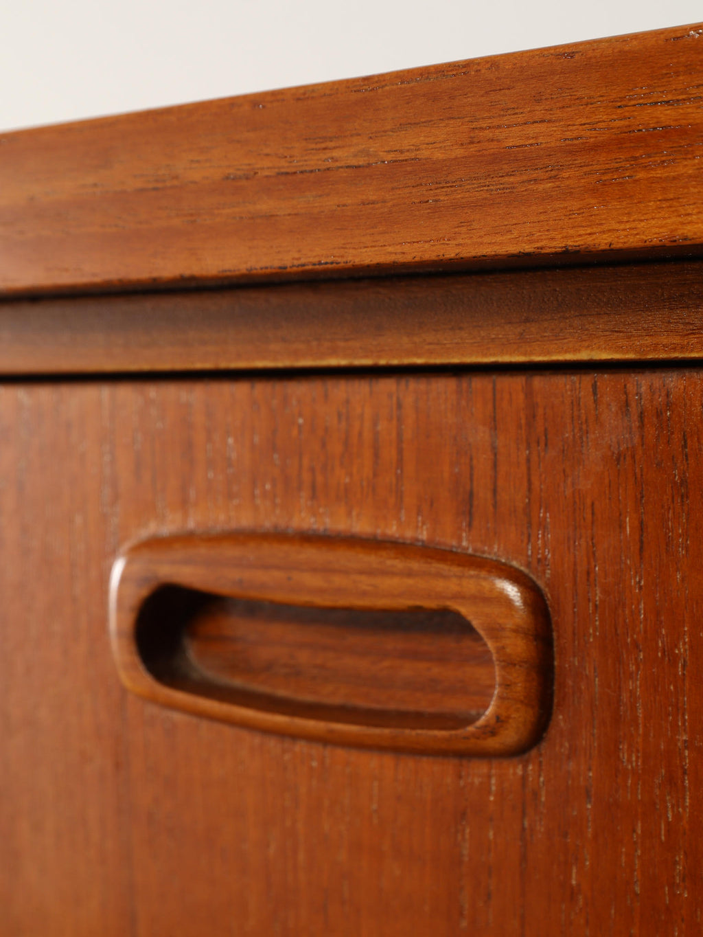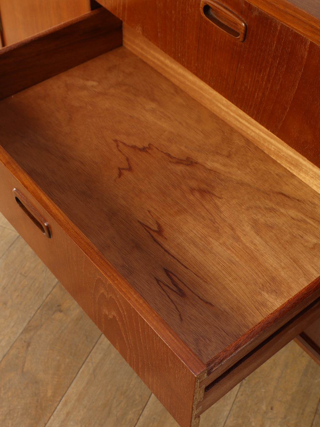 チーク材のきめ細やかな杢目も美しいサイドボード。無駄な装飾を一切削ぎ落としたスマートな佇まいが魅力です。幅1400mmと比較的コンパクトなサイズ感ながら、3段の抽斗のほか左右には戸棚があることから、収納として十分にご活用いただけます。絵画やミラー、グリーンなどと合わせてディスプレイを楽しんでみてはいかがでしょうか。
