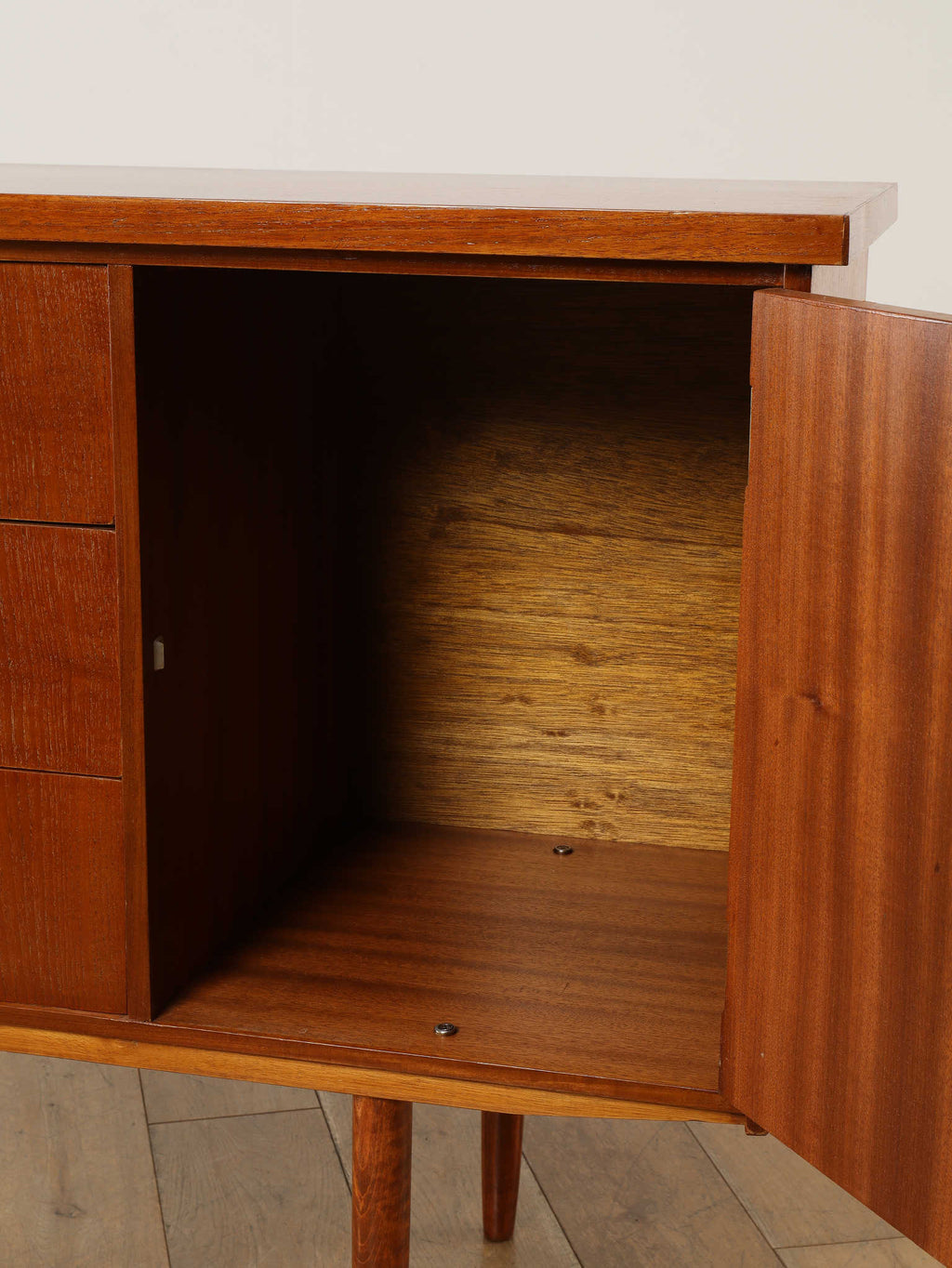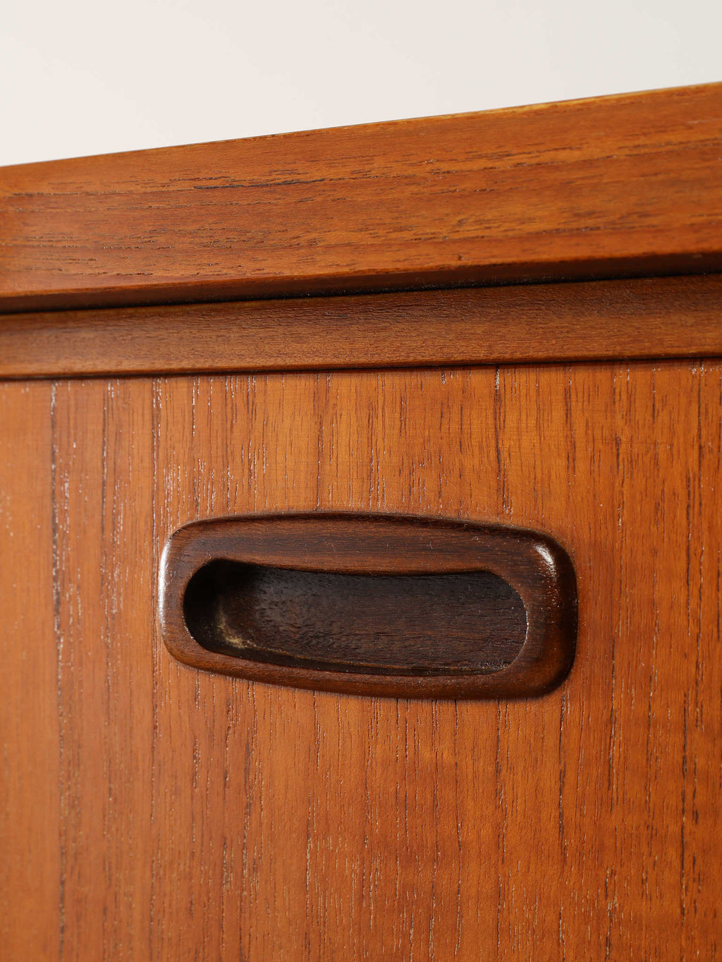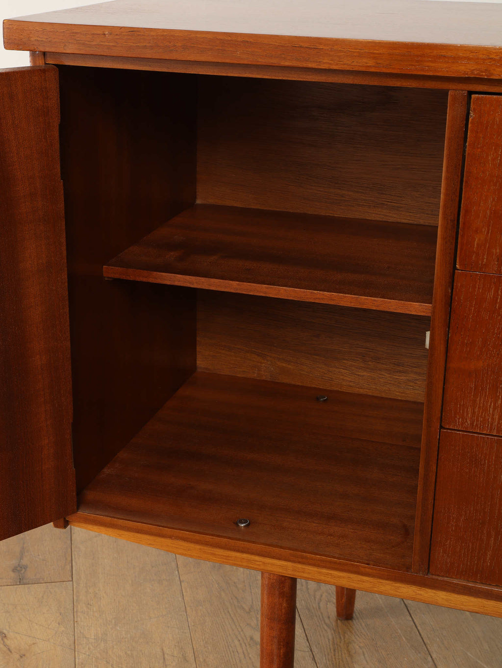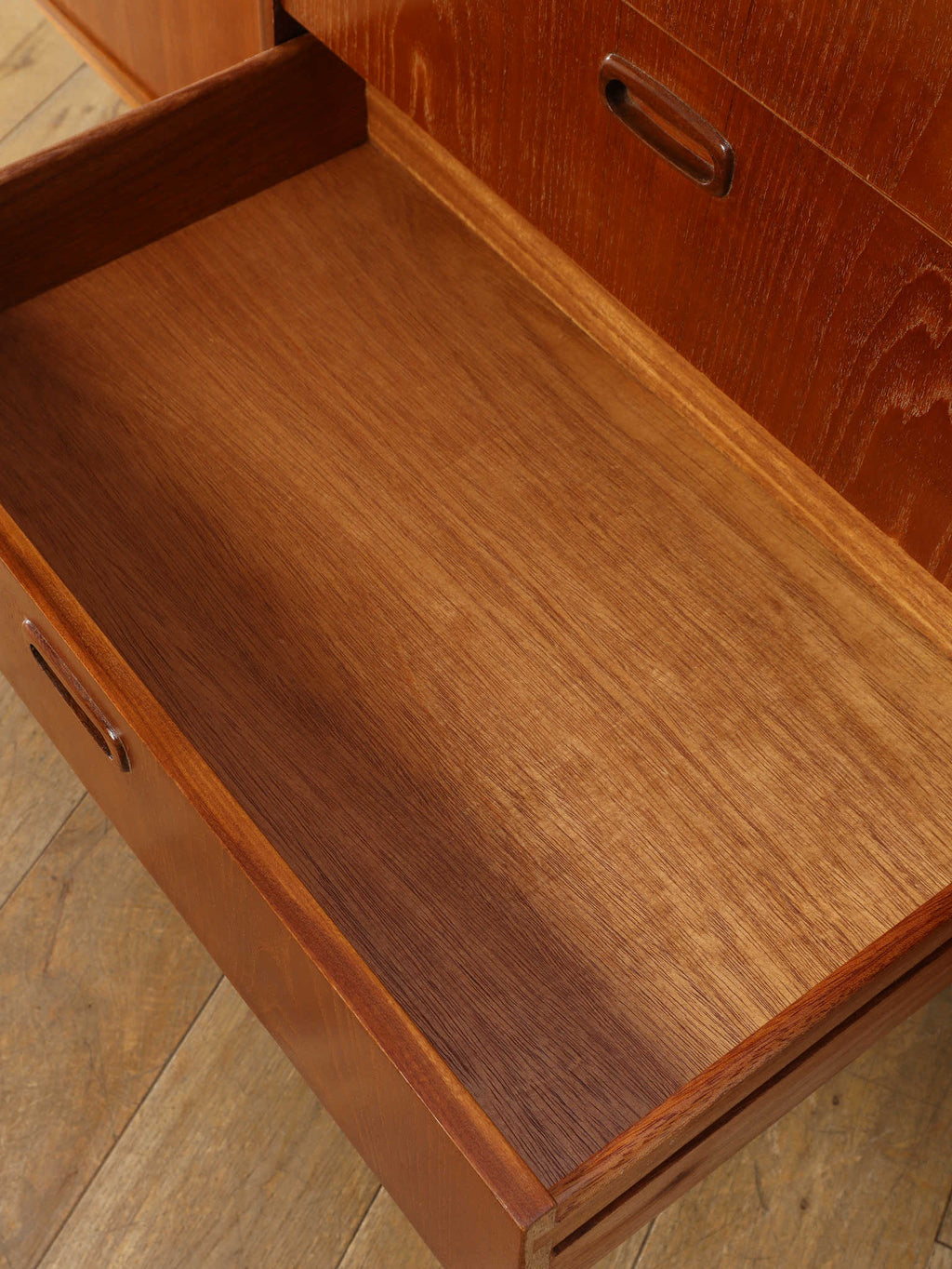 チーク材のきめ細やかな杢目も美しいサイドボード。無駄な装飾を一切削ぎ落としたスマートな佇まいが魅力です。幅1400mmと比較的コンパクトなサイズ感ながら、3段の抽斗のほか左右には戸棚があることから、収納として十分にご活用いただけます。絵画やミラー、グリーンなどと合わせてディスプレイを楽しんでみてはいかがでしょうか。