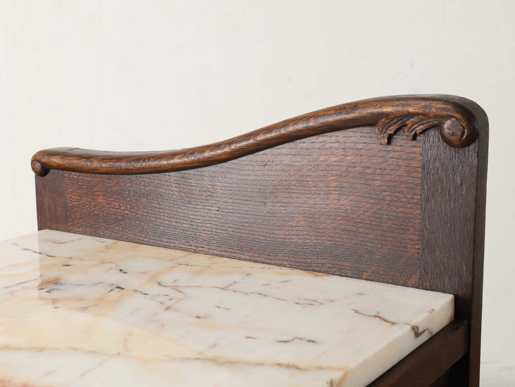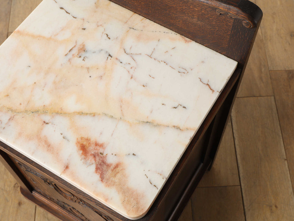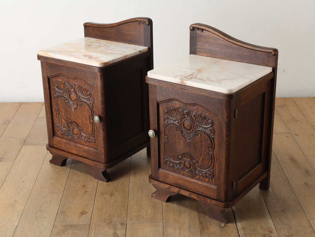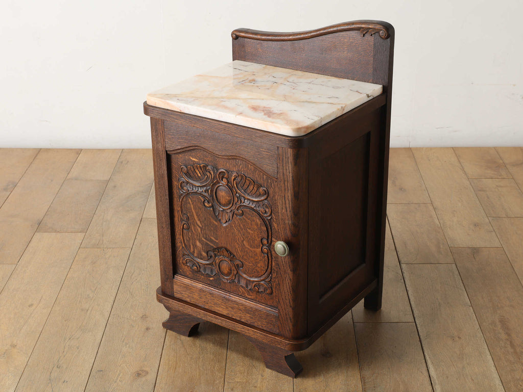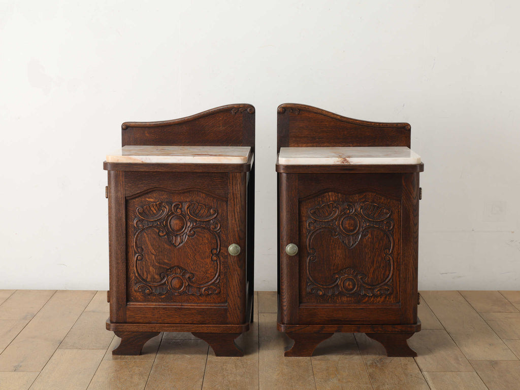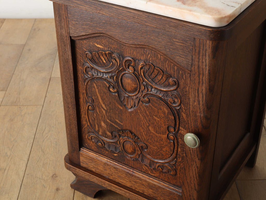 オーク材と上質なマーブル(大理石)天板のベッドサイドキャビネット。目を惹くのは、優雅な曲線を描く彫刻。繊細でありながら、全体を流れるアール・デコ様式の流麗なデザインが、重厚感の中に洗練されたモダンな印象を与えます。この緻密な造りこそベルギーヴィンテージならではの魅力。長い時を経たオーク材の深い味わいと、柔らかな色合いのマーブル天板の相性は抜群。天板にはランプを置いても安定し、一日の終わりを迎える寝室に、落ち着く特別な空間を演出します。
