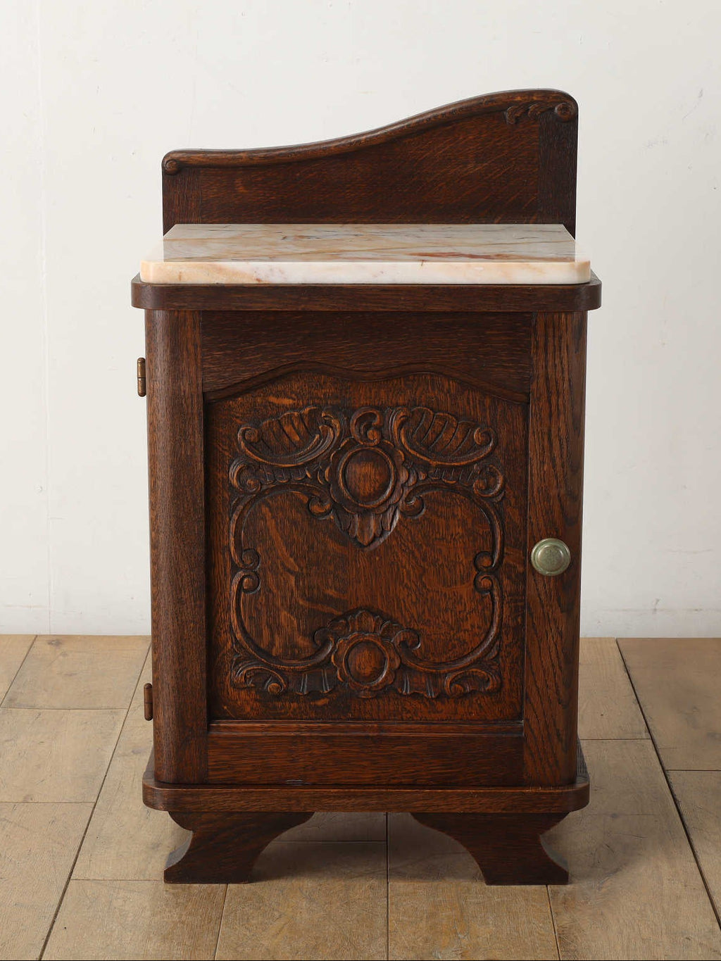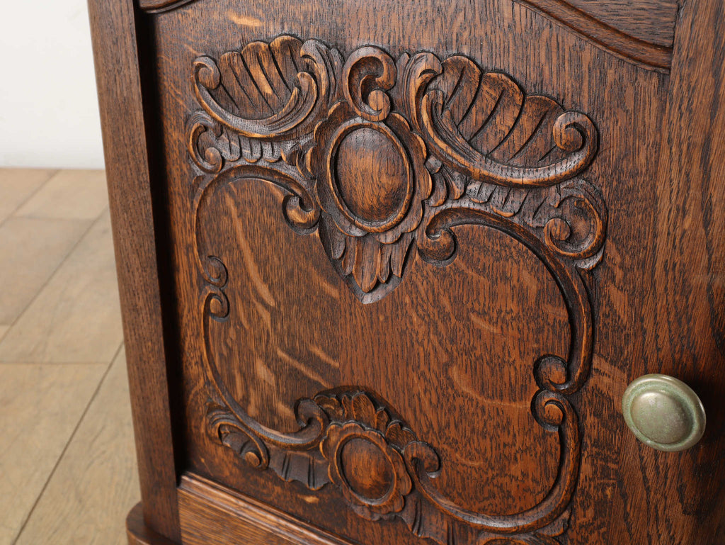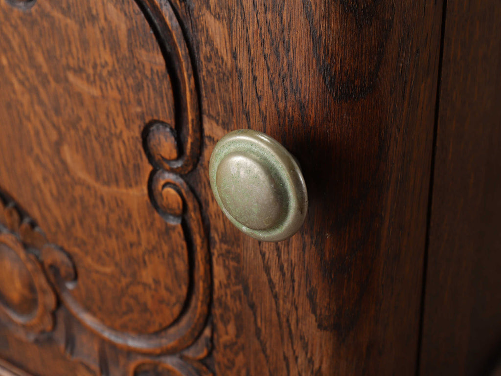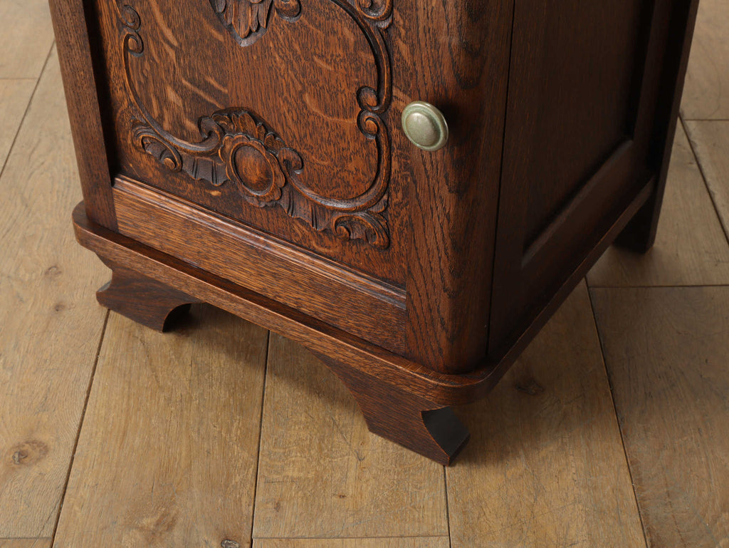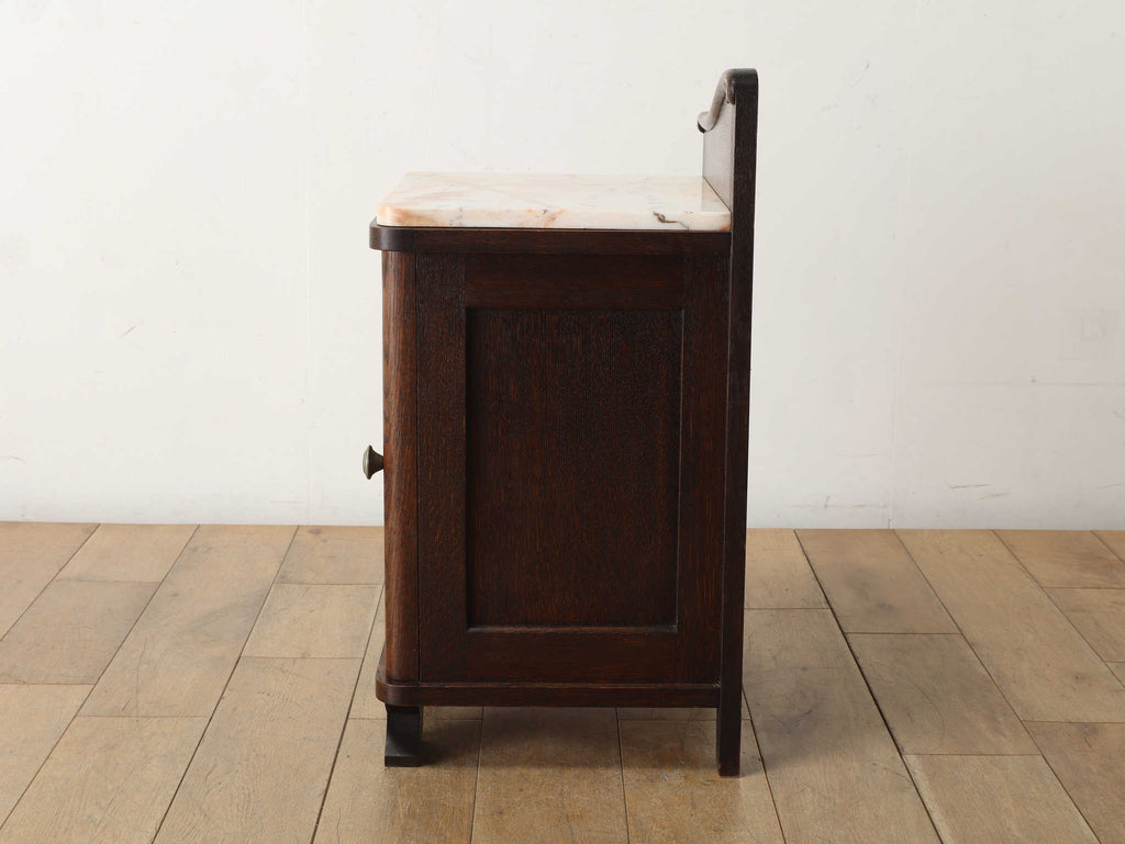 オーク材と上質なマーブル(大理石)天板のベッドサイドキャビネット。目を惹くのは、優雅な曲線を描く彫刻。繊細でありながら、全体を流れるアール・デコ様式の流麗なデザインが、重厚感の中に洗練されたモダンな印象を与えます。この緻密な造りこそベルギーヴィンテージならではの魅力。長い時を経たオーク材の深い味わいと、柔らかな色合いのマーブル天板の相性は抜群。天板にはランプを置いても安定し、一日の終わりを迎える寝室に、落ち着く特別な空間を演出します。