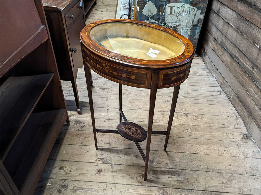 19世紀末(推定)のイギリスで製作された、希少なマホガニー製のジュエリーキャビネットです。その姿はまるで貴婦人のためにしつらえられた宝箱のよう。マホガニーの上質な色合いと、エレガントな細脚が、空間に洗練された雰囲気を添えます。最大の魅力は、天板や側面に散りばめられたインレイ(象嵌細工)。細かな花模様のインレイには、熟練の職人の技術がうかがえる繊細な手仕事が光り、この時代の家具に対するこだわりが凝縮されています。オーバル型のガラストップは、お気に入りのジュエリーや時計、コレクションを埃から守りながら美しくディスプレイできる「魅せる収納」を実現します。