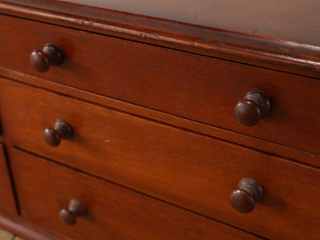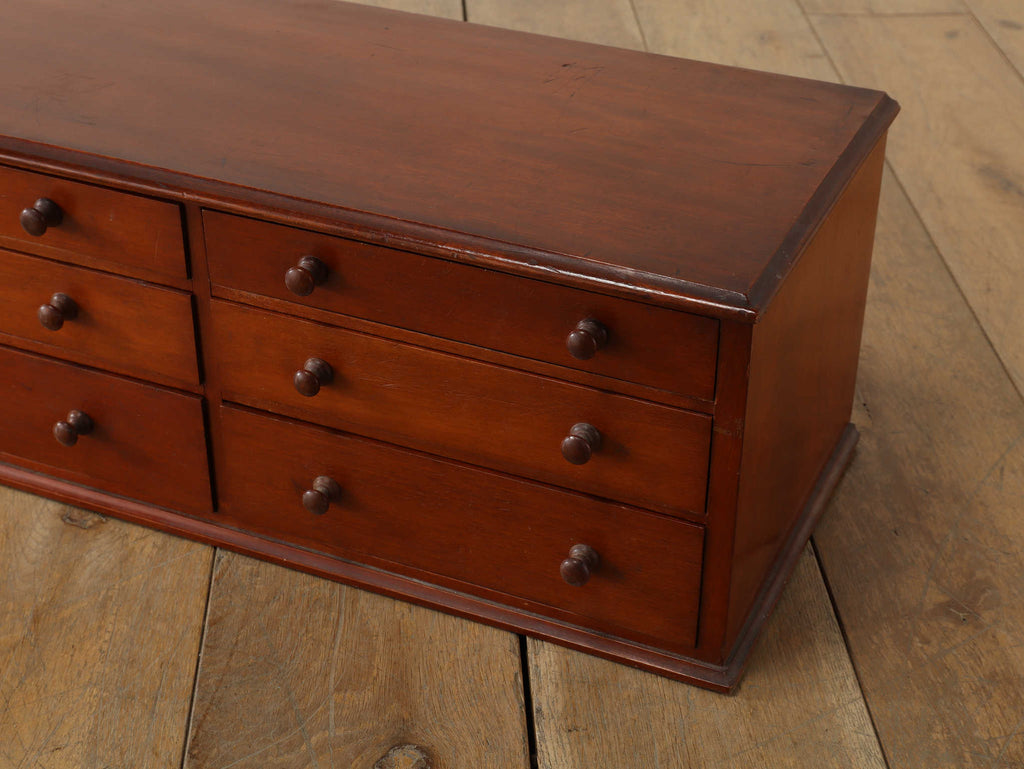 1890年代(推定)にイギリスで製造されたマホガニー材のバンクドロワーです。その名の通り、かつて銀行や店舗、あるいは精密な作業を行う工房などで、書類や道具を整理するために使用されていた、大変珍しい収納家具です。12個もの小さな引き出しが整然と並ぶその佇まいは、飾り気のない実用的な美しさを放っています。滑らかな質感のマホガニー材は、1世紀以上の時を経て深みを増し、美しい赤褐色に変化しています。この深い艶は、まさに100年の時を経てきた木の深い味わいを示すものです。W900mm、D240mm、H210mmという比較的コンパクトなサイズ感でありながら、12杯の引き出しによる高い収納力を持ちます。書斎での文具や趣味のコレクション整理、あるいはリビングで大切な小物を仕舞うための「秘密の引き出し」として、その役割は無限大です。現代の生活空間に、歴史と機能美を兼ね備えた唯一無二の存在感をもたらします。実用的な家具でありながら、空間の主役になる存在感を放つ、特別なアンティークです。