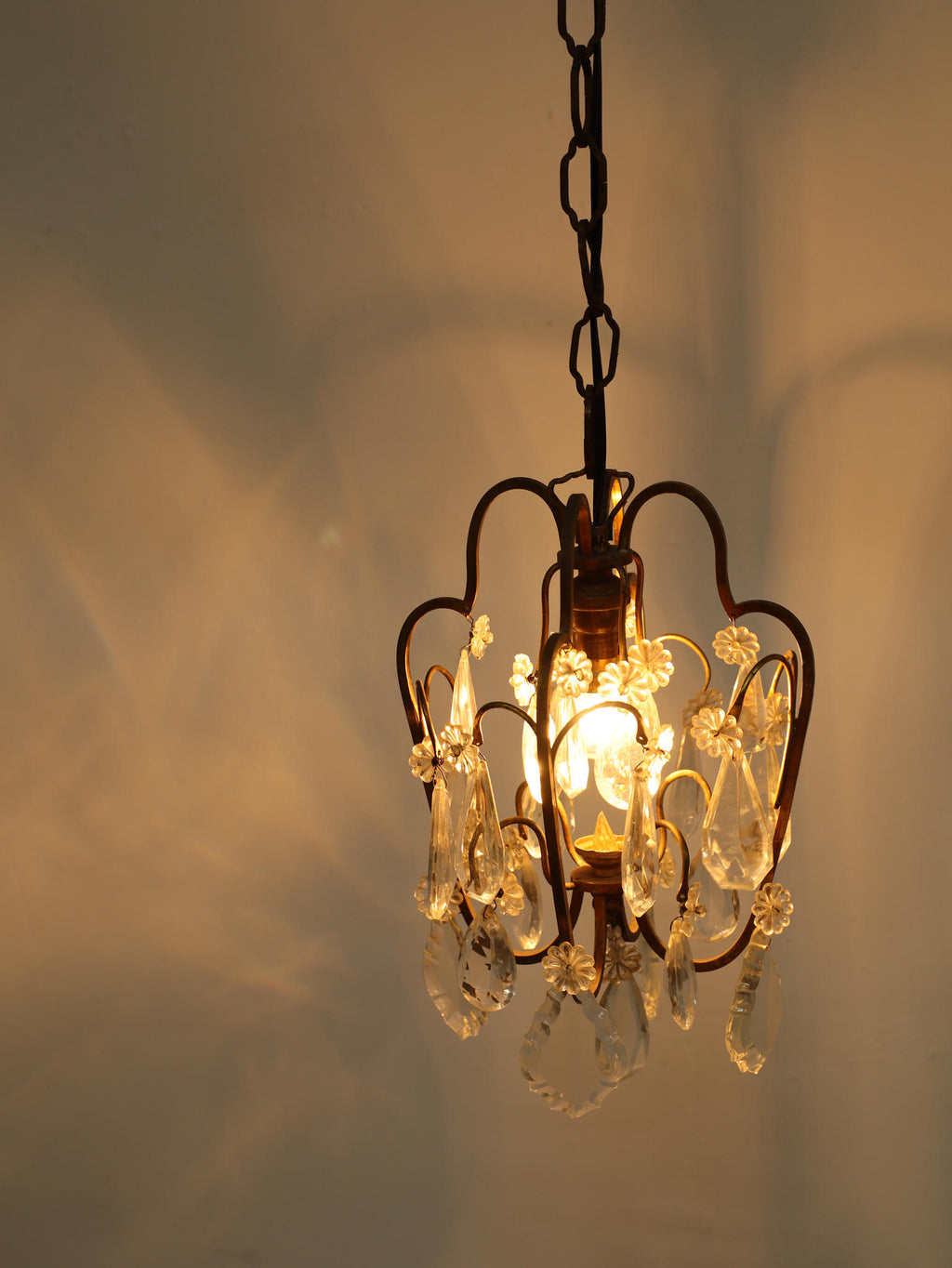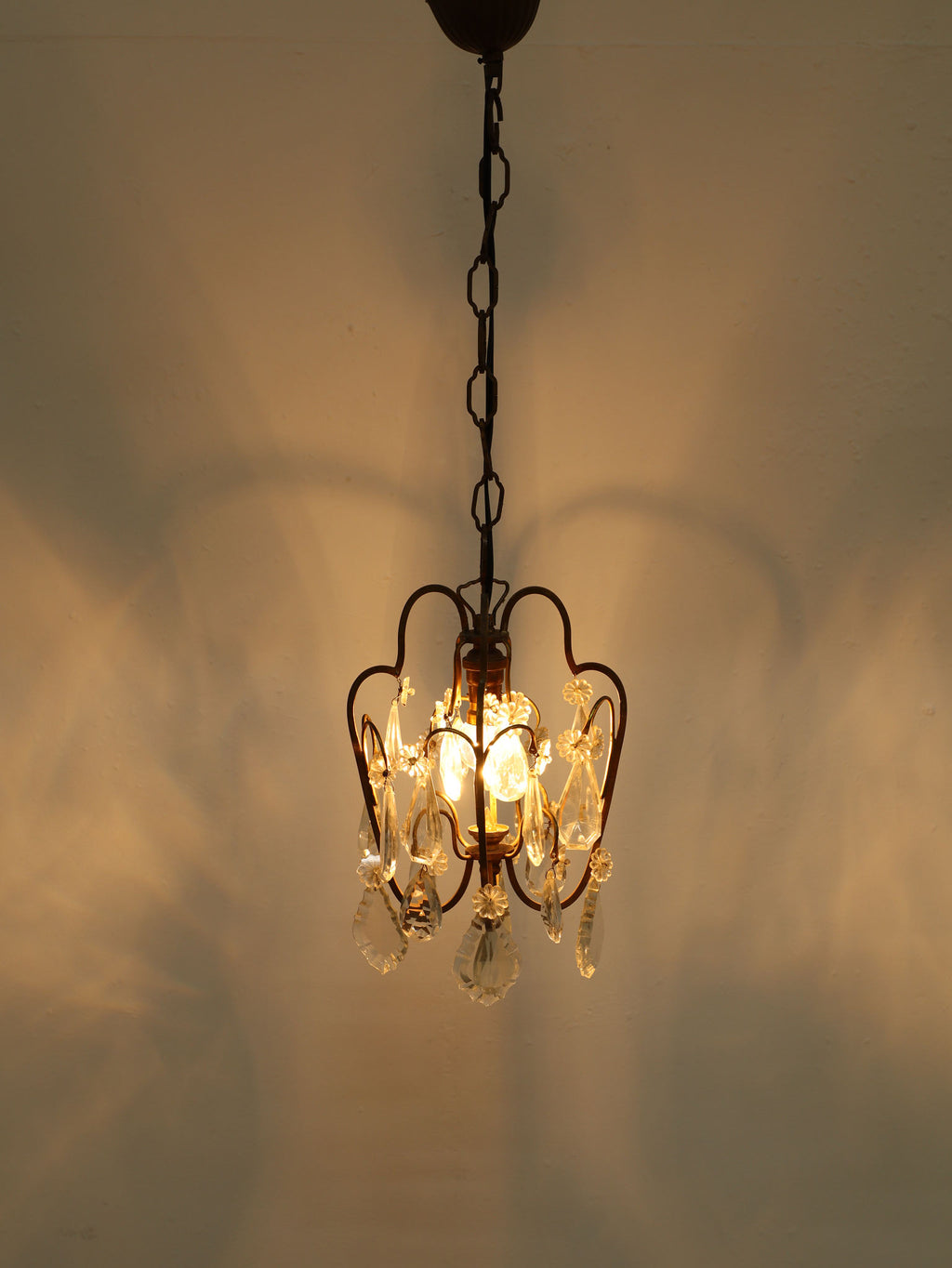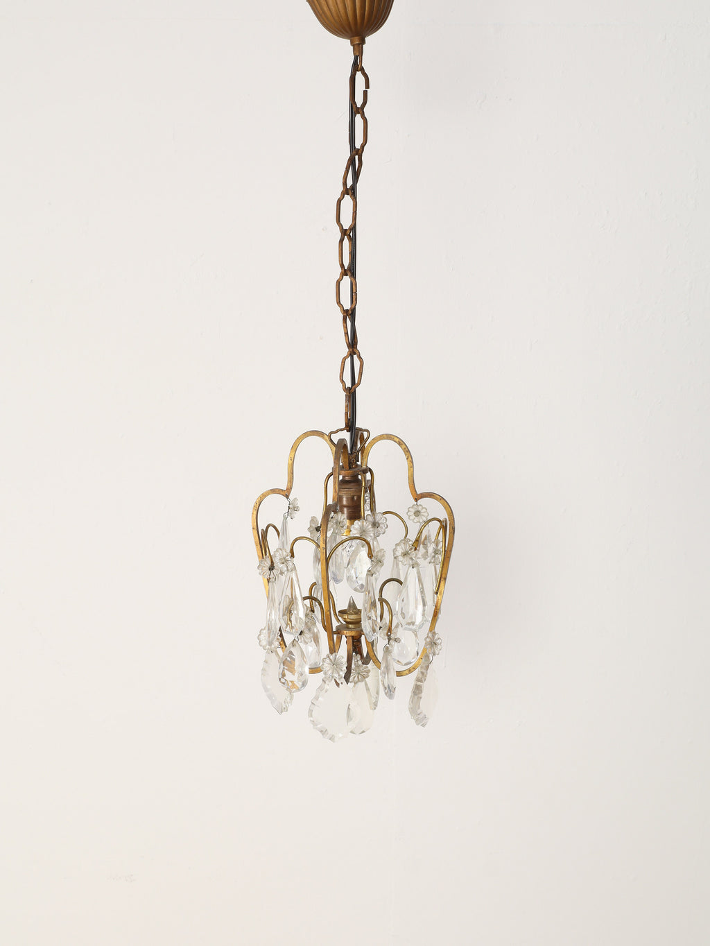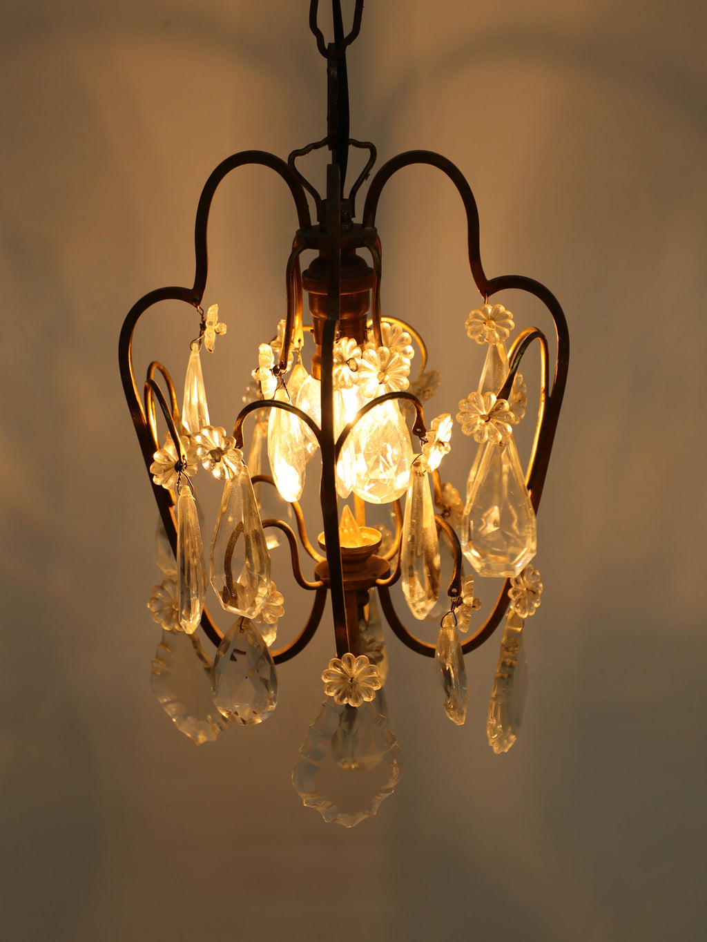 推定1920年代のイタリア製のシャンデリア。雫形の大ぶりなガラスパーツが上品かつ大胆に部屋に彩りを与えてくれます。フラワーモチーフのガラスパーツが程よいアクセントとなって、全体を引き立たせています。どの面からみても見る人たちを飽きさせない、そんなアイテムです。玄関やダイニングスペースなどで活躍してくれるでしょう。