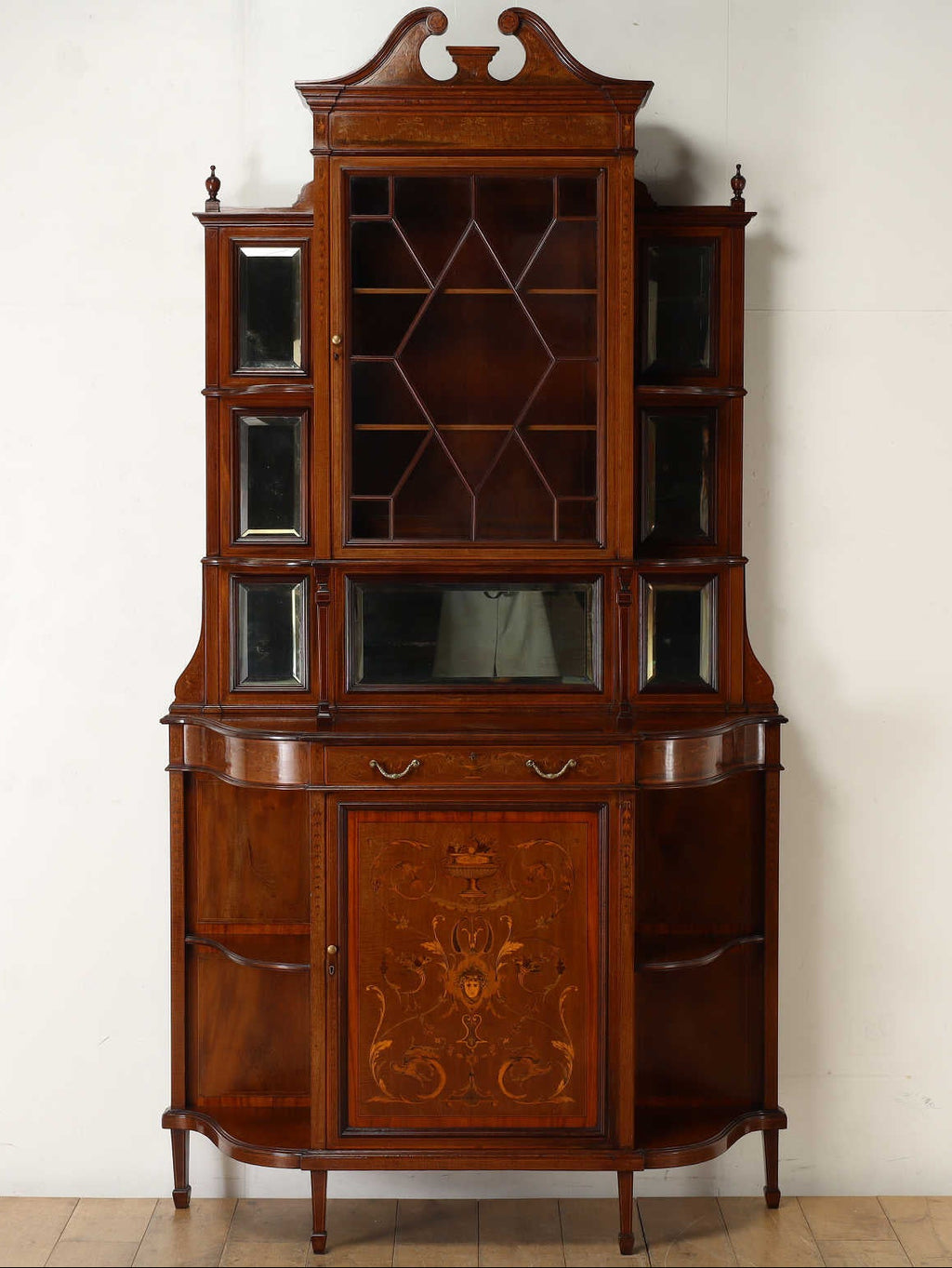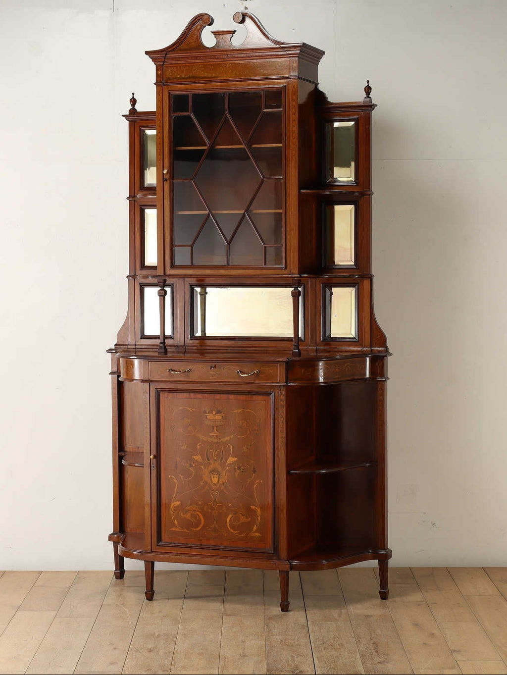 しなやかな曲線美と精緻な象嵌細工が目を奪う、およそ1900年代ごろの英国アンティークのディスプレイキャビネット。上部のガラス扉にはお気に入りのコレクションをを収納でき、下部の扉には美しい装飾が施されています。ミラーや棚も配され、空間を華やかに彩りながら、実用性も兼ね備えた逸品です。リビングや書斎に、唯一無二の存在感を放ちます。