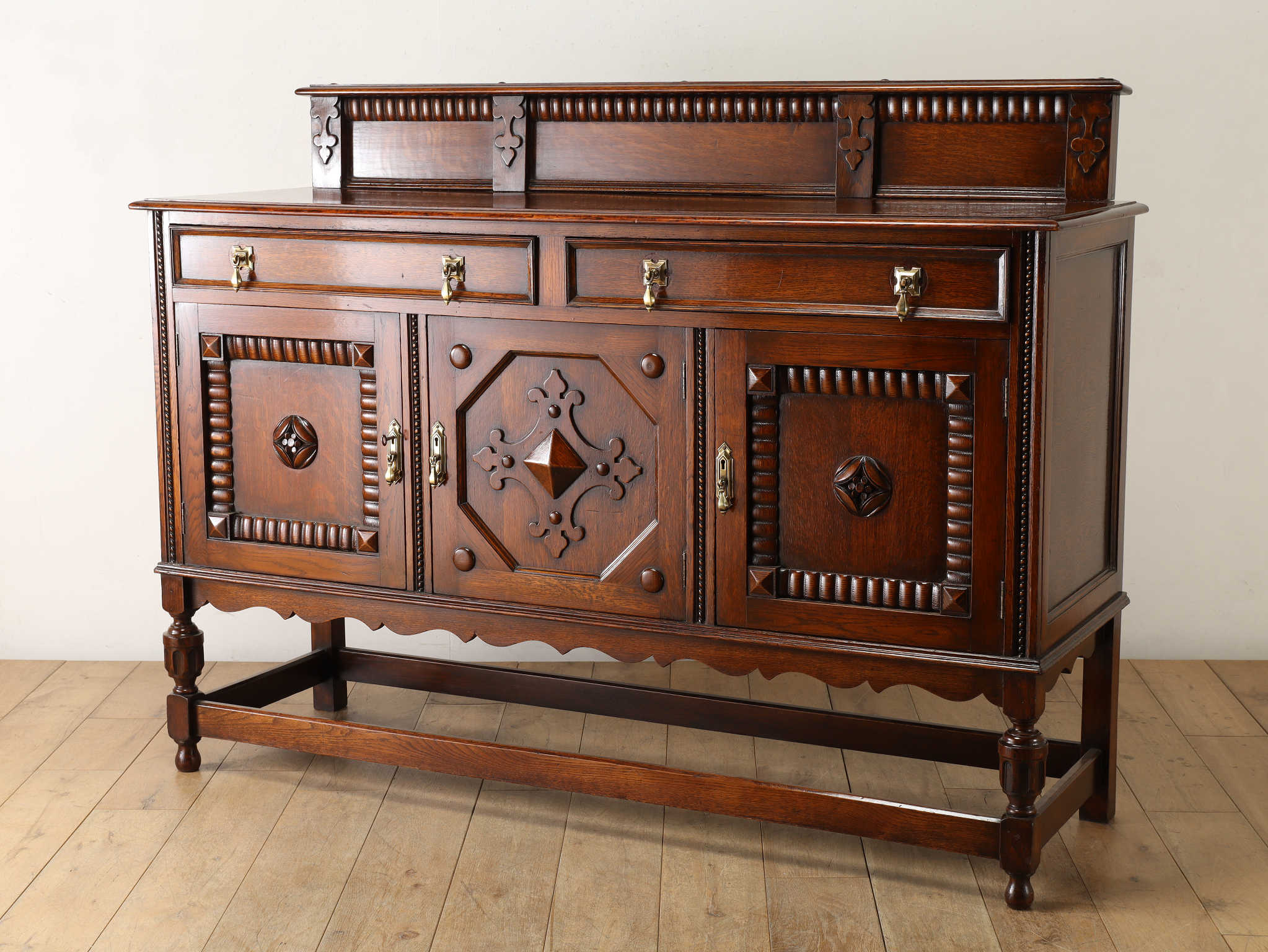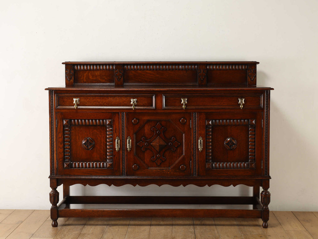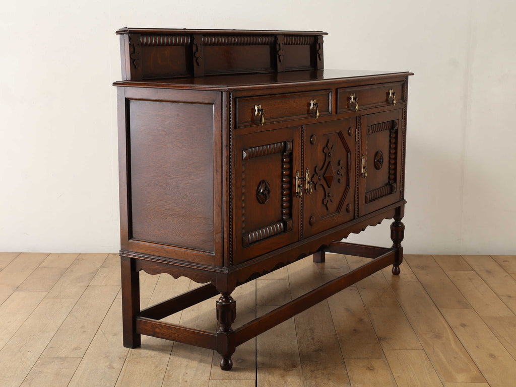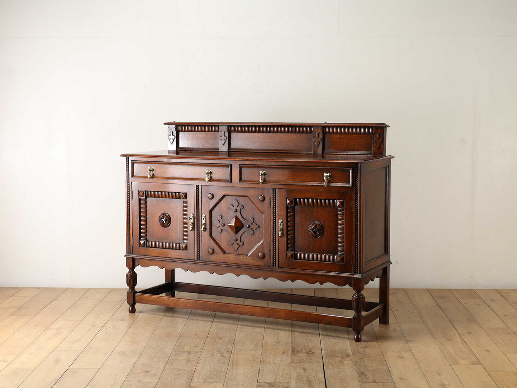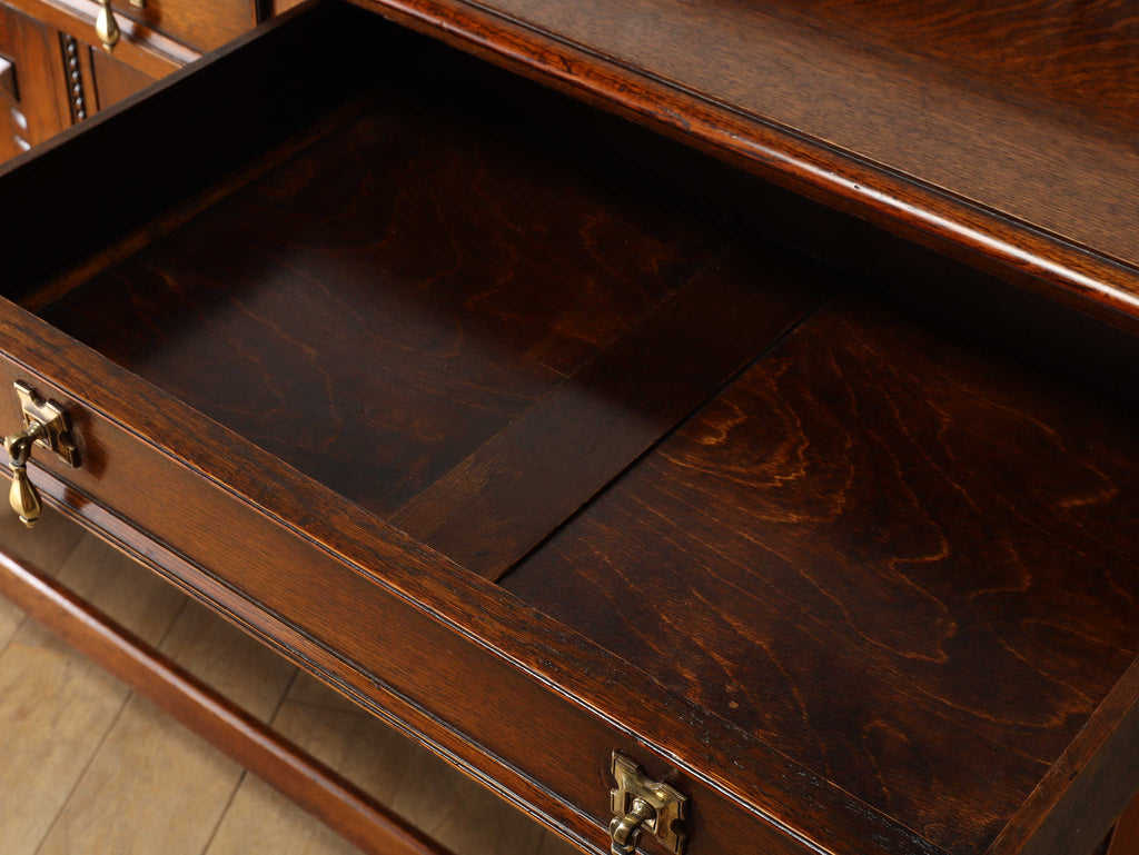 経年変化したオーク材の風合いや、笠木部分と扉や脚など、随所に施された繊細な彫刻が非常に味わい深い一品です。オーク材ならではの力強い木目と堅牢なつくりが特徴で、英国の伝統的なスタイルを感じさせるデザインは、空間に落ち着きと風格をもたらします。抽斗に加え、左右中央も戸棚になっていることから、食器やリネン類、書籍などをたっぷりと収納できます。リビングやダイニングにて、テーブルランプやグリーンなど、お好みのアイテムと組み合わせて、ディスプレイスペースとしても楽しんでみてはいかがでしょうか。