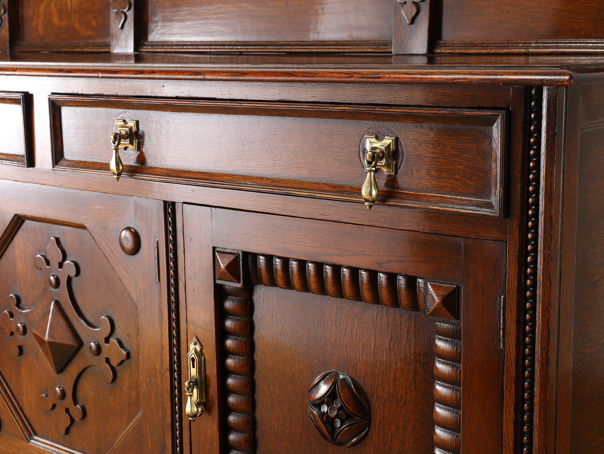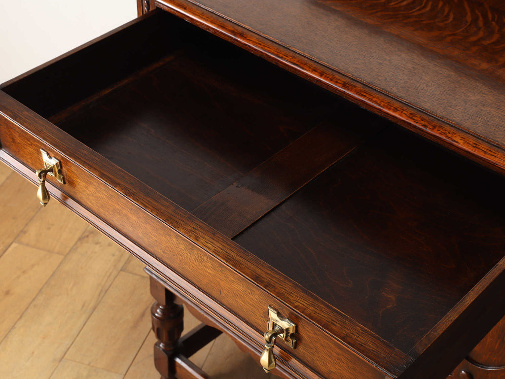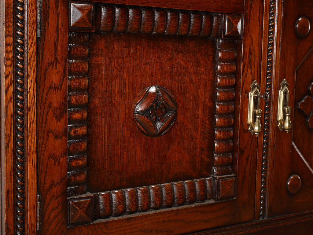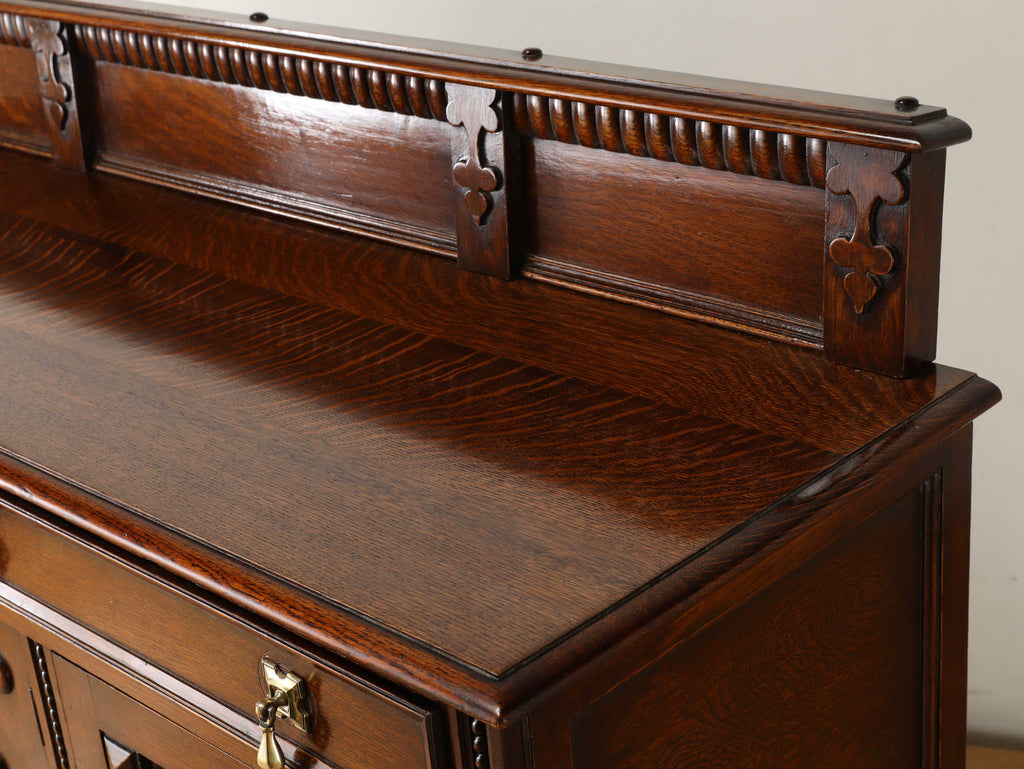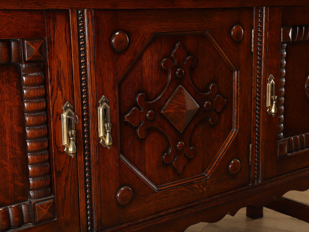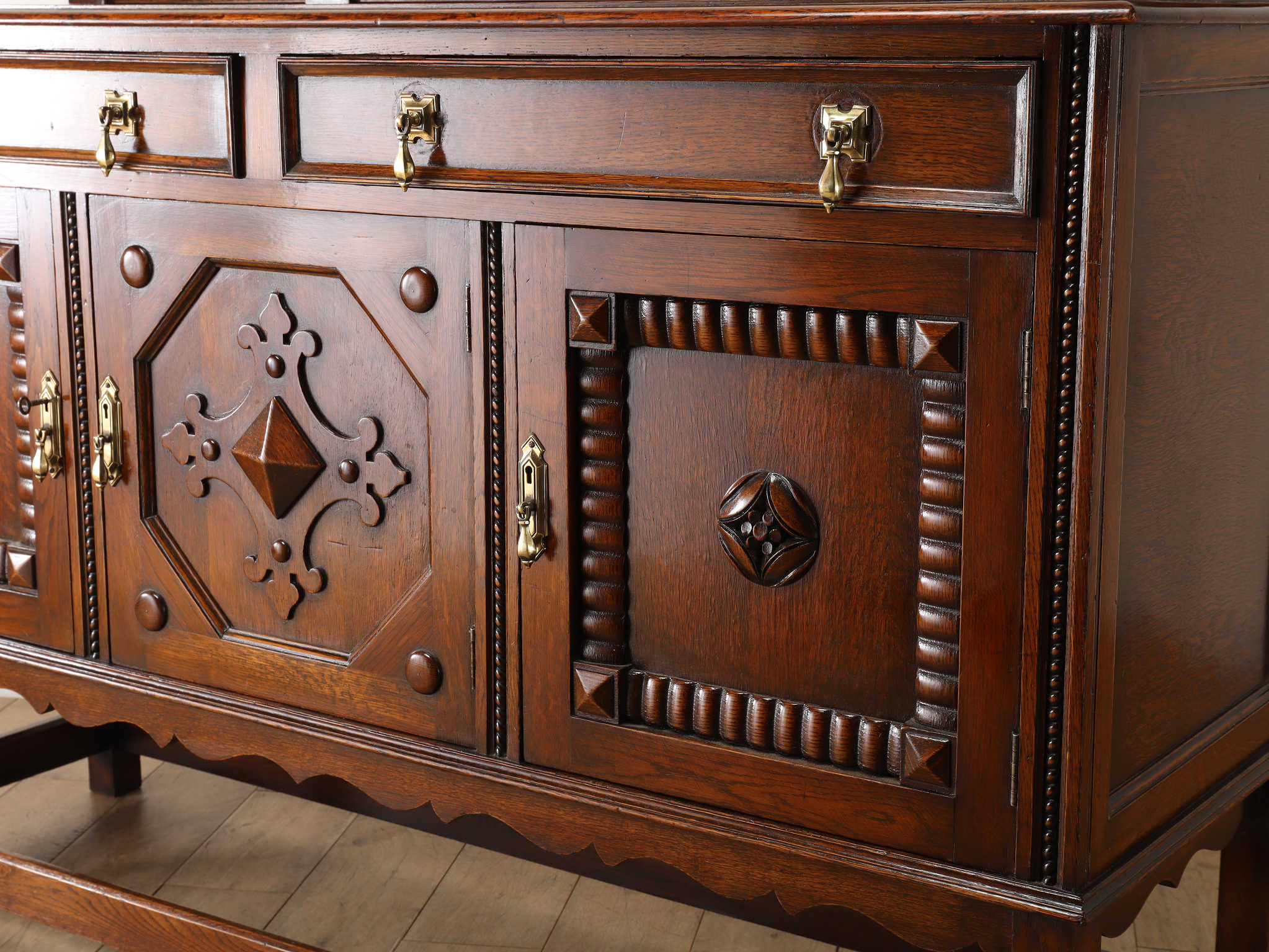 経年変化したオーク材の風合いや、笠木部分と扉や脚など、随所に施された繊細な彫刻が非常に味わい深い一品です。オーク材ならではの力強い木目と堅牢なつくりが特徴で、英国の伝統的なスタイルを感じさせるデザインは、空間に落ち着きと風格をもたらします。抽斗に加え、左右中央も戸棚になっていることから、食器やリネン類、書籍などをたっぷりと収納できます。リビングやダイニングにて、テーブルランプやグリーンなど、お好みのアイテムと組み合わせて、ディスプレイスペースとしても楽しんでみてはいかがでしょうか。