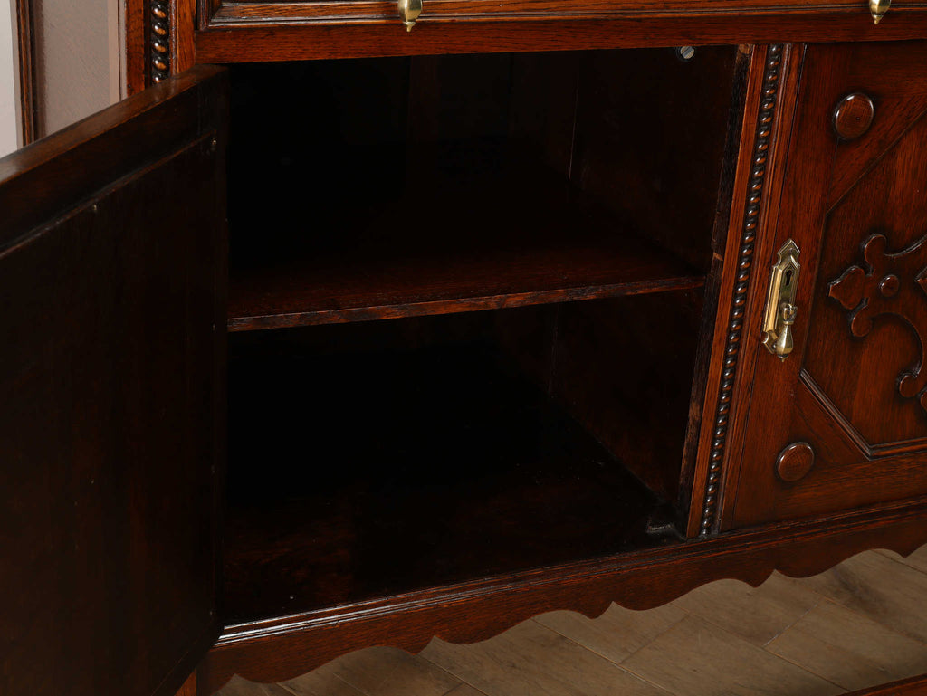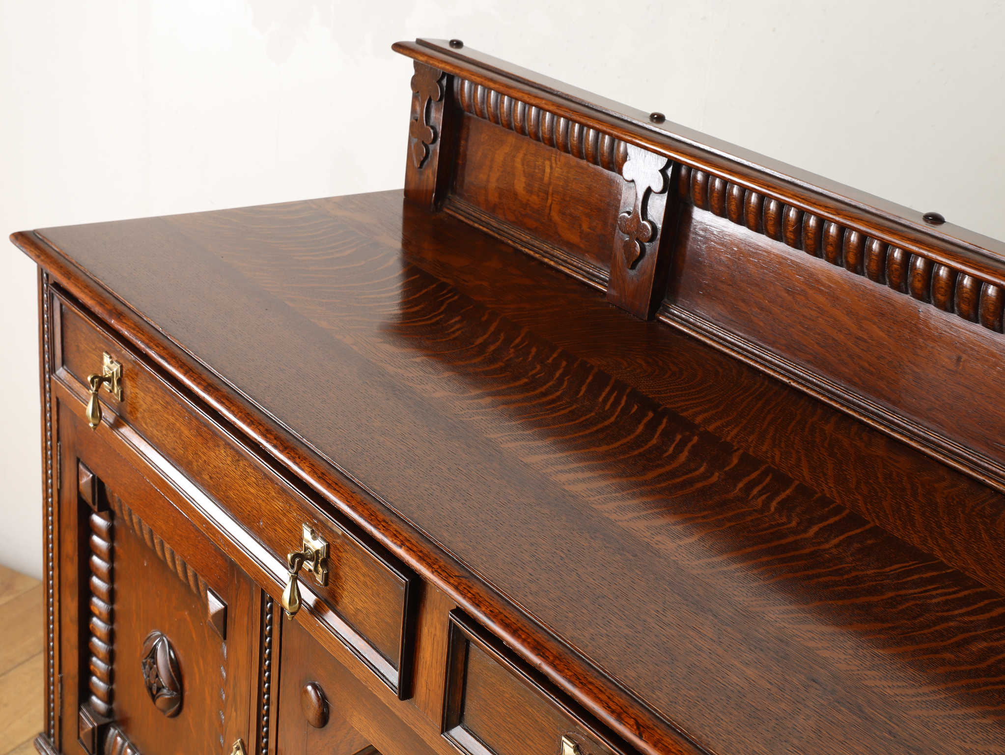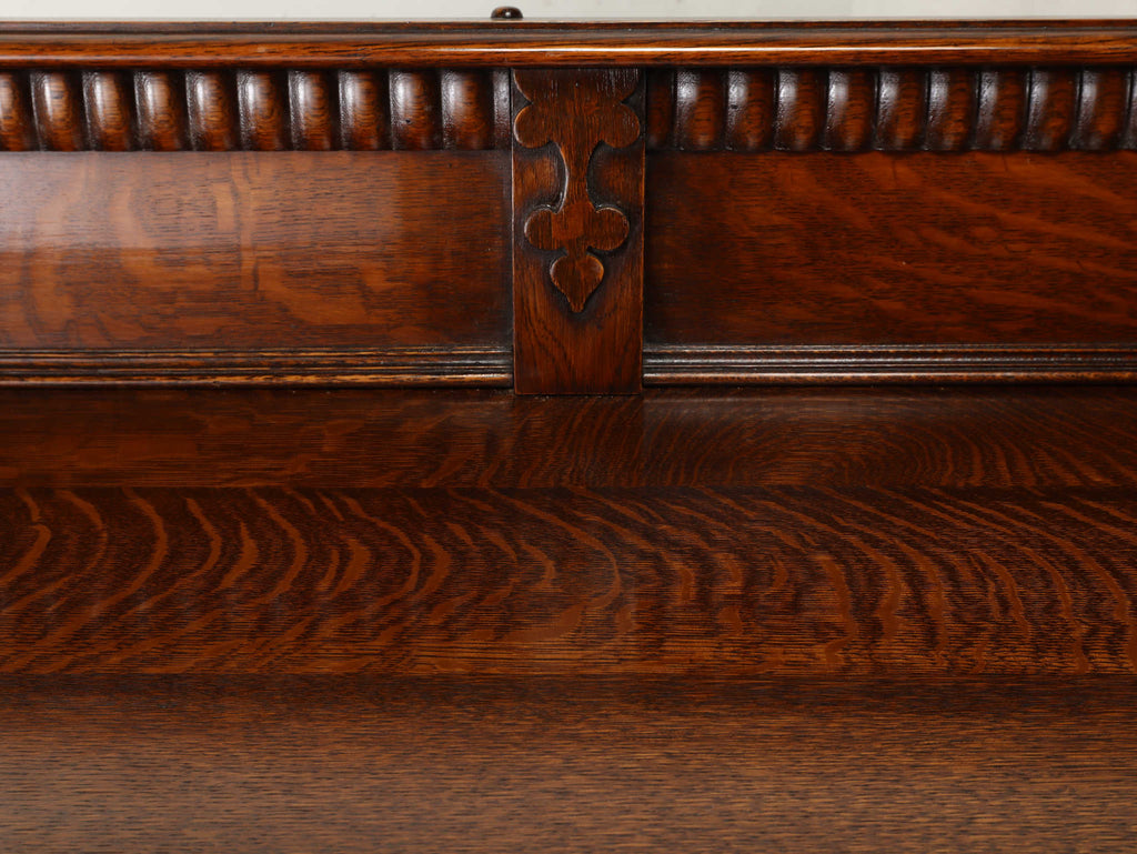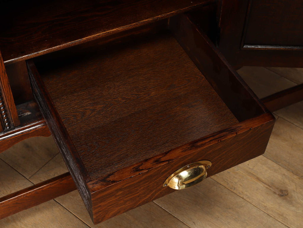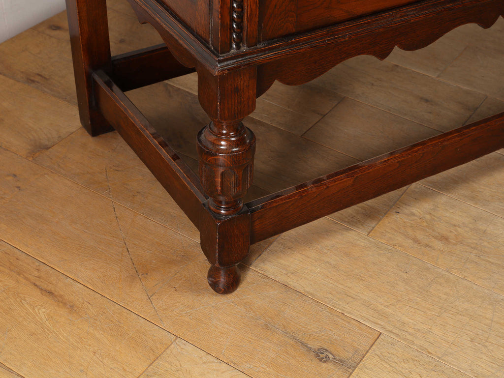 経年変化したオーク材の風合いや、笠木部分と扉や脚など、随所に施された繊細な彫刻が非常に味わい深い一品です。オーク材ならではの力強い木目と堅牢なつくりが特徴で、英国の伝統的なスタイルを感じさせるデザインは、空間に落ち着きと風格をもたらします。抽斗に加え、左右中央も戸棚になっていることから、食器やリネン類、書籍などをたっぷりと収納できます。リビングやダイニングにて、テーブルランプやグリーンなど、お好みのアイテムと組み合わせて、ディスプレイスペースとしても楽しんでみてはいかがでしょうか。