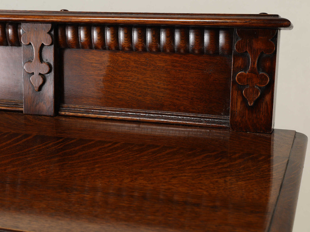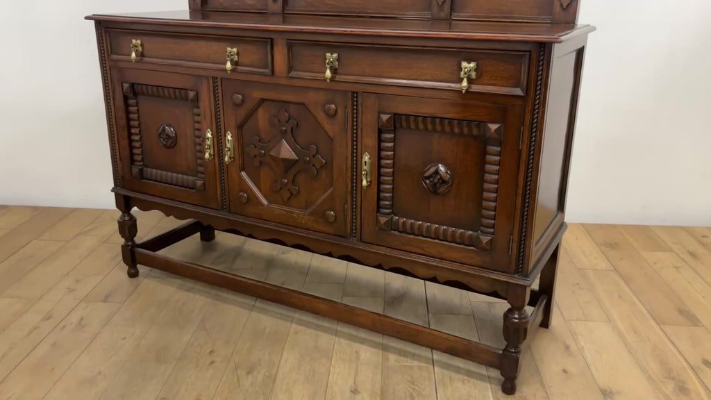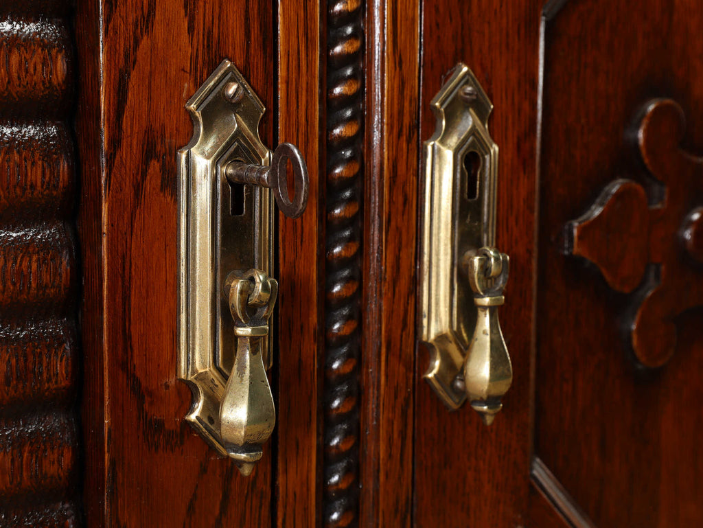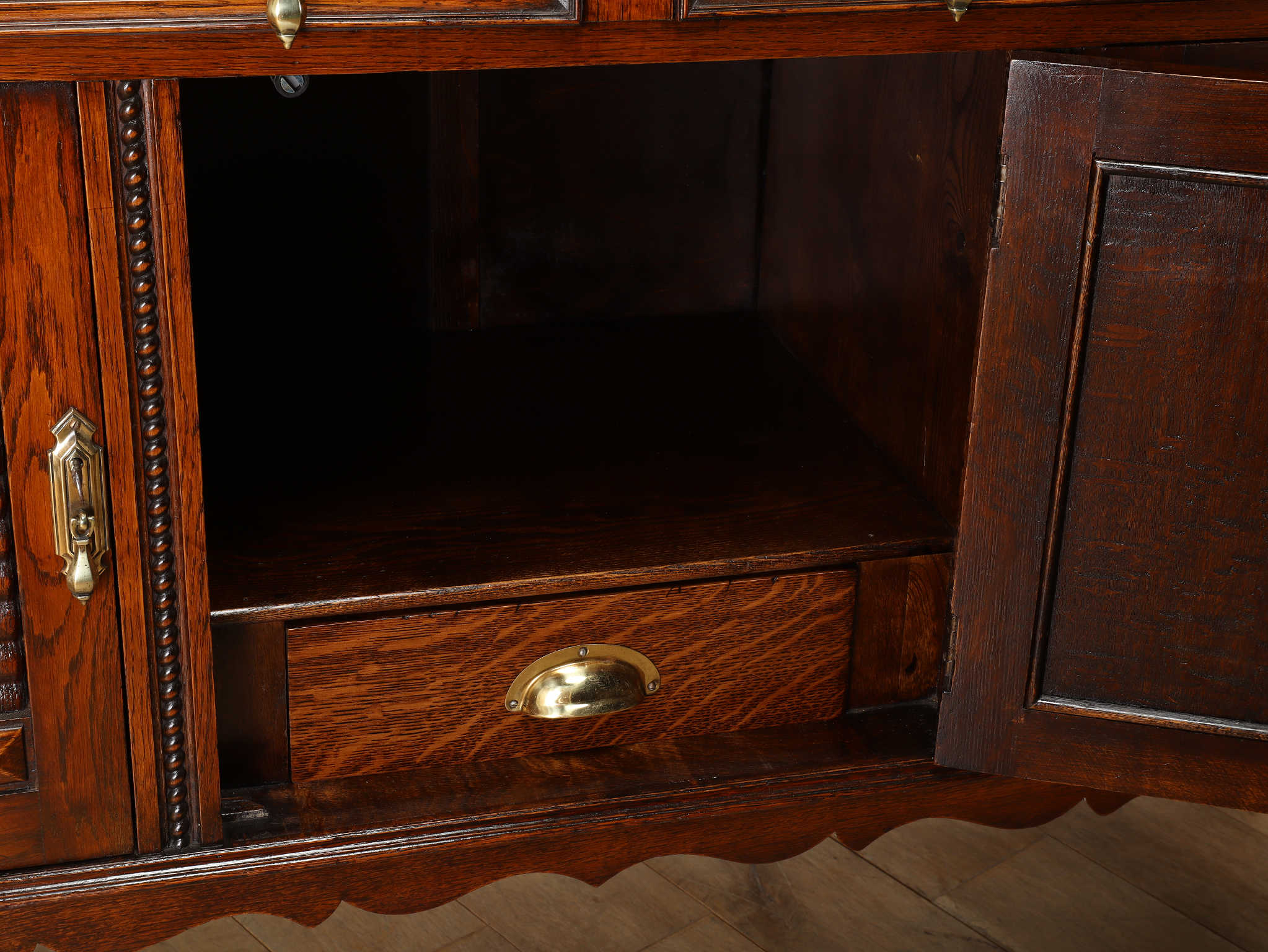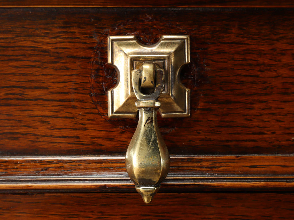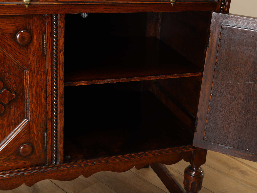 経年変化したオーク材の風合いや、笠木部分と扉や脚など、随所に施された繊細な彫刻が非常に味わい深い一品です。オーク材ならではの力強い木目と堅牢なつくりが特徴で、英国の伝統的なスタイルを感じさせるデザインは、空間に落ち着きと風格をもたらします。抽斗に加え、左右中央も戸棚になっていることから、食器やリネン類、書籍などをたっぷりと収納できます。リビングやダイニングにて、テーブルランプやグリーンなど、お好みのアイテムと組み合わせて、ディスプレイスペースとしても楽しんでみてはいかがでしょうか。