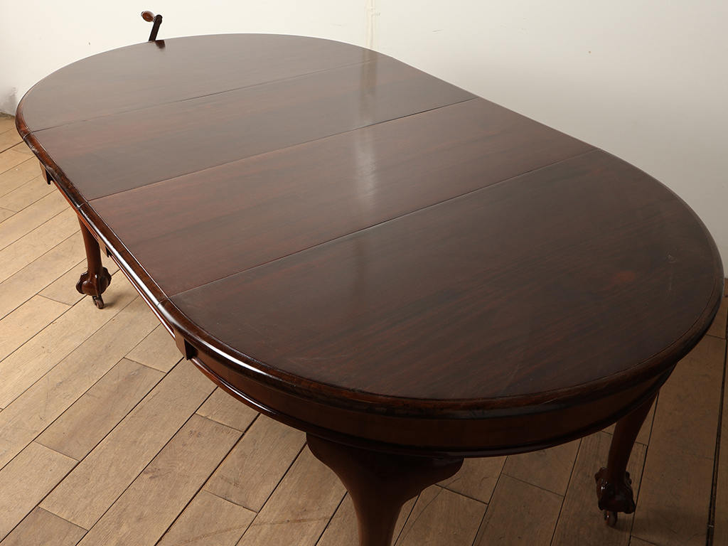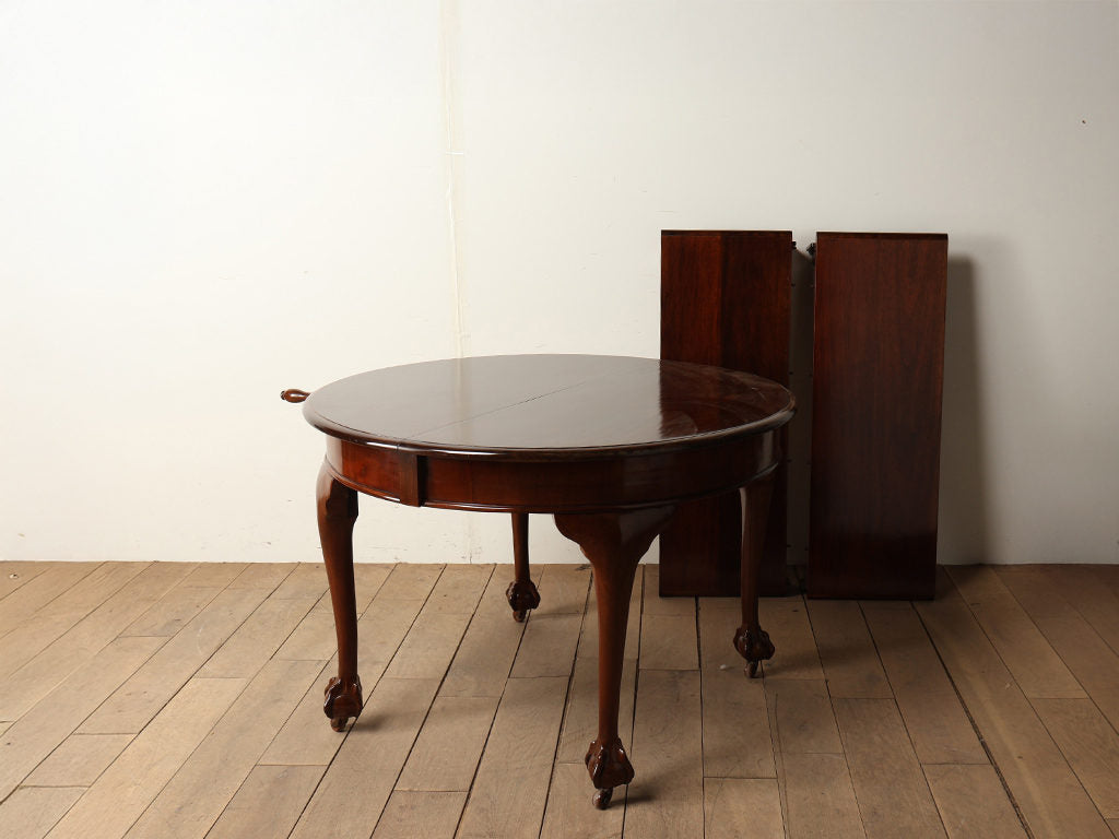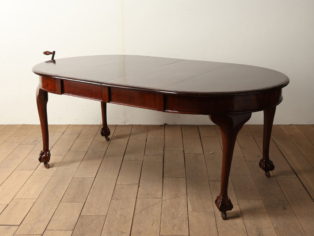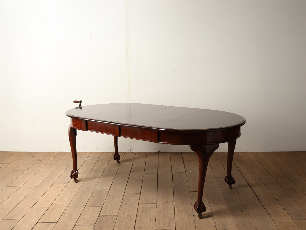 1930年代(推定)英国製、シックで上品なマホガニー材の伸長式テーブル。中板の追加でW1040mmからW1800mmまで自在に調節可能な実用性を備えています。縁起の良いモチーフとして知られるボウルアンドクロウの脚部、滑らかなオーバル天板も気品を漂わせる逸品。ハンドルを回すだけで簡単に伸長できる巧みな機構は、90年の時を超えても変わらぬ動作精度を誇ります。6人から8人まで対応できるサイズ変更は、ディナーパーティから家族の団欒まで、様々なシーンに寄り添います。豊かな木目と深みのある色合いは、空間に温かみと格調高さを演出。英国家具の伝統美を日々の暮らしに取り入れる贅沢を味わってみませんか。